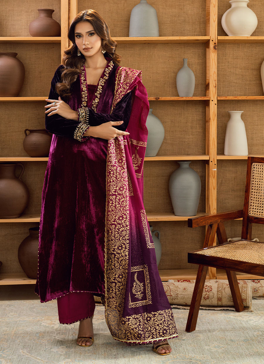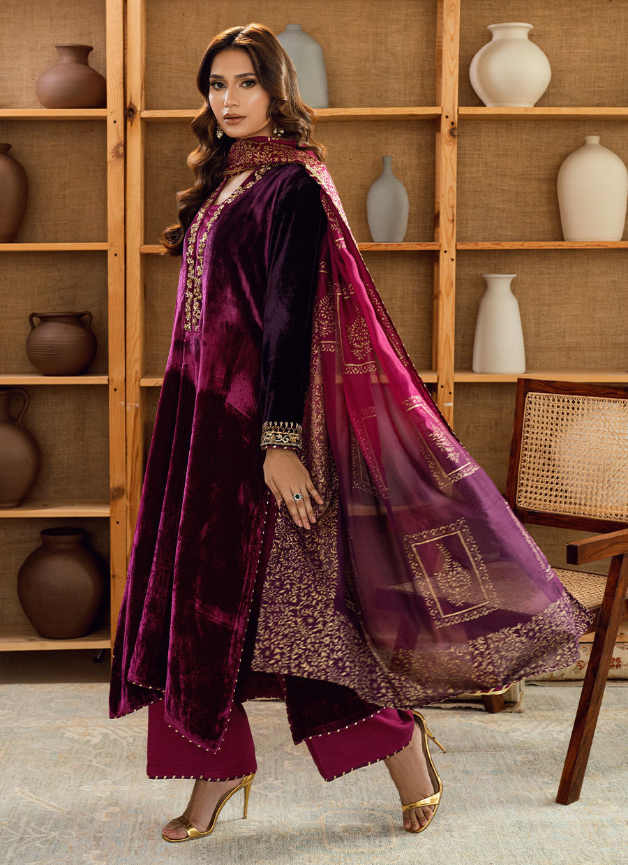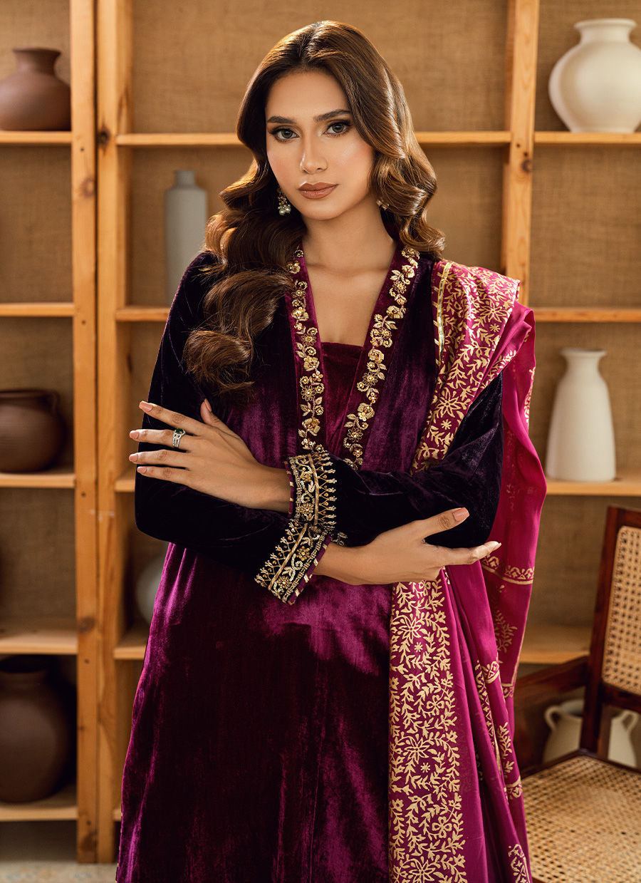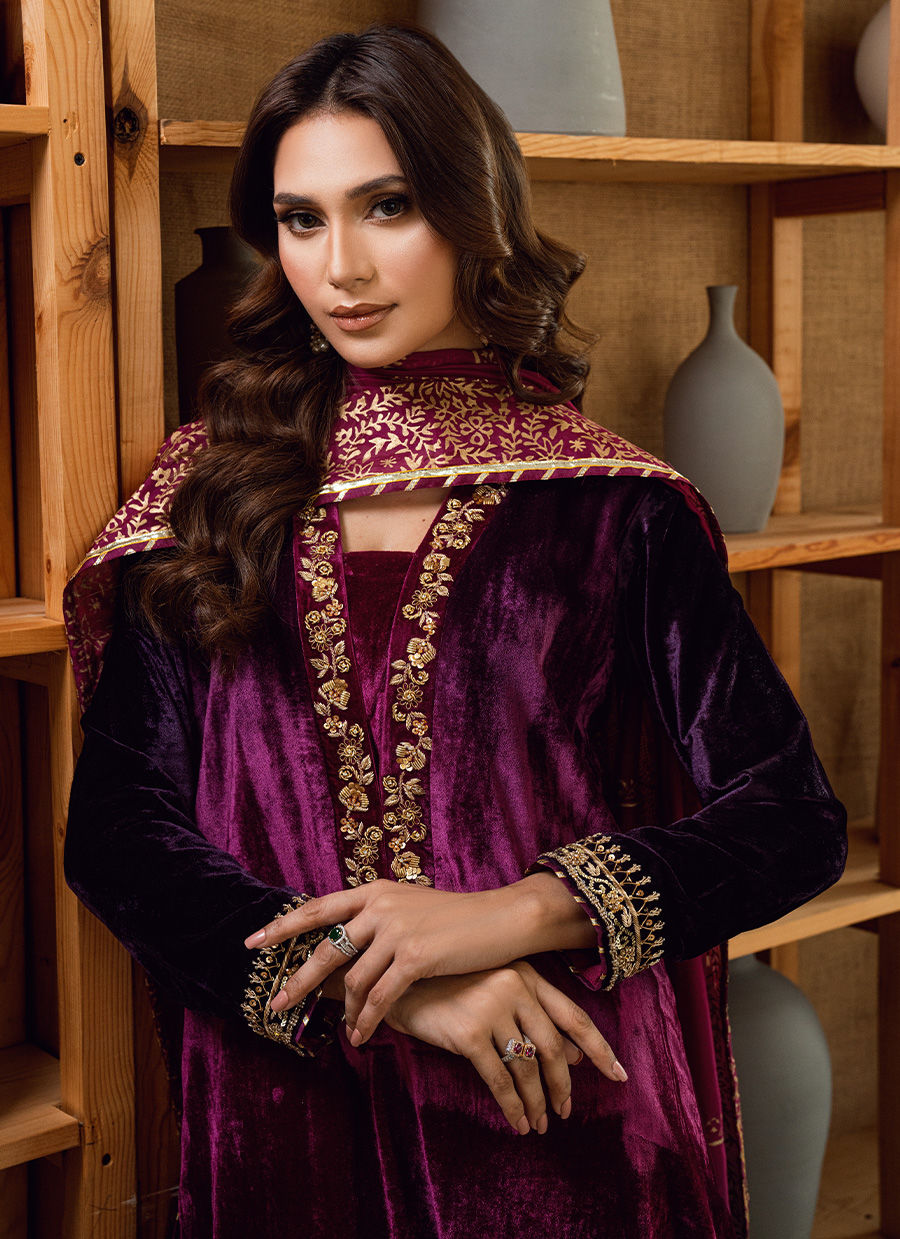 A masterpiece of timeless allure, Majestic Garnet celebrates the richness of shaded magenta velvet—where deep tones meet subtle radiance. The long shirt features dark magenta sleeves and a handcrafted neckline, meticulously embellished with intricate handwork and fine detailing. Each stitch narrates a story of craftsmanship and grace. A gold-block printed silk dupatta elevates the look, adding a regal shimmer that complements the hue’s opulent depth. The pipe-fin finishing on the daman enhances the silhouette’s precision, while straight magenta pants complete this ensemble with modern refinement. Ideal for festive evenings and grand occasions, Majestic Garnet captures the true spirit of heritage couture—a symphony of color, artistry, and elegance.
