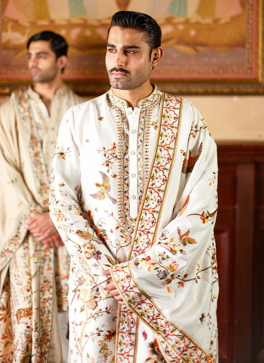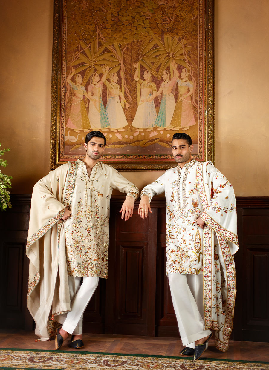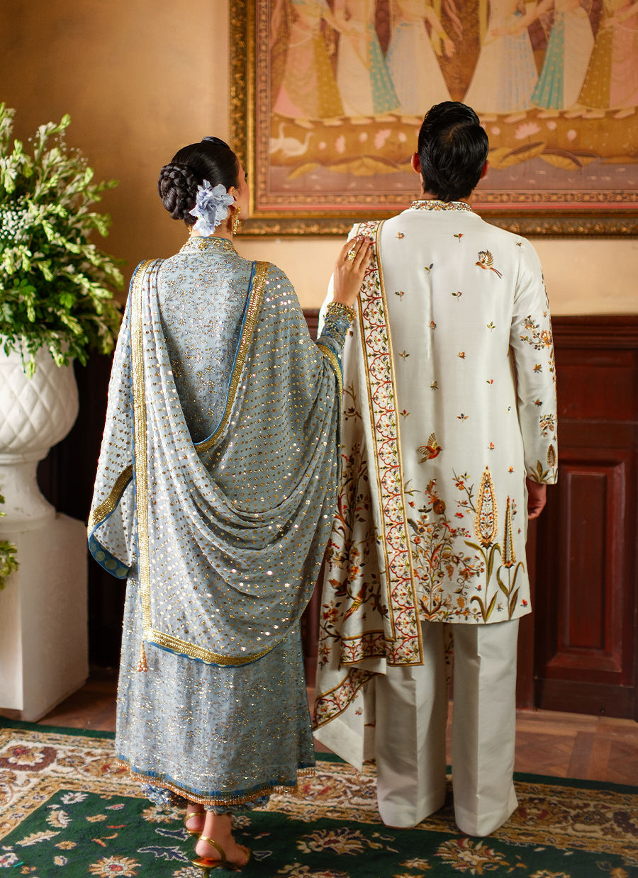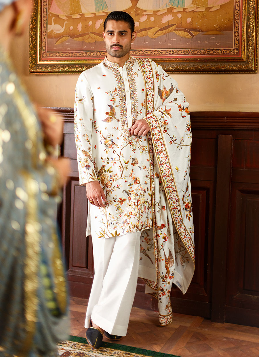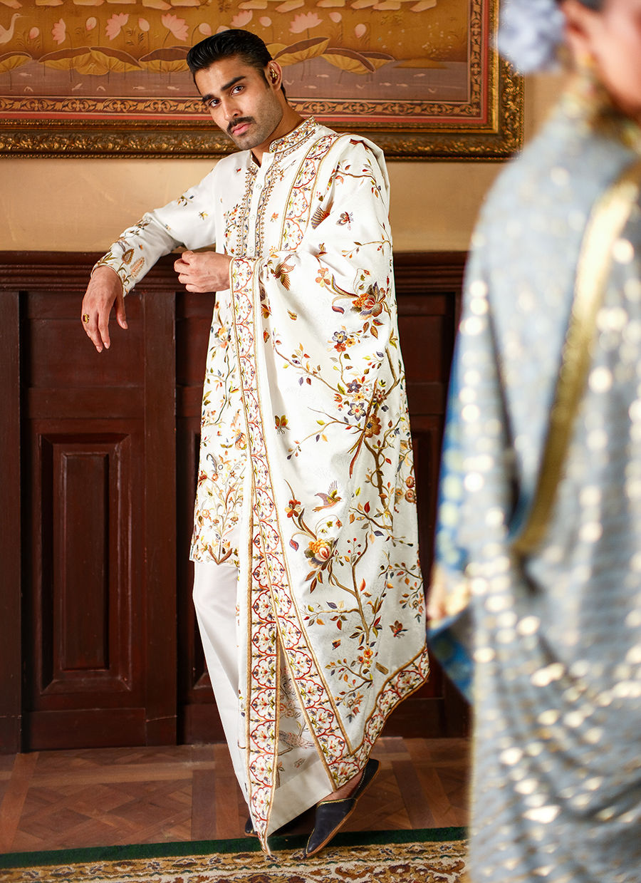 Timeless signature thread and mirrorwork featuring florals and bird motifs paired with a heavily embroidered shawl to match.