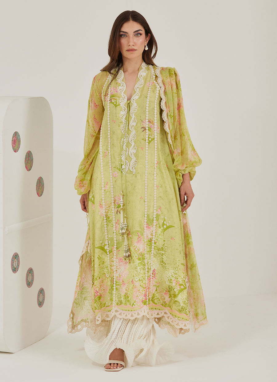 Paired with a sheer dupatta that drapes like a soft whisper, Malone feels both uplifting and refined — a piece that carries warmth, ease, and quiet celebration in every detail.