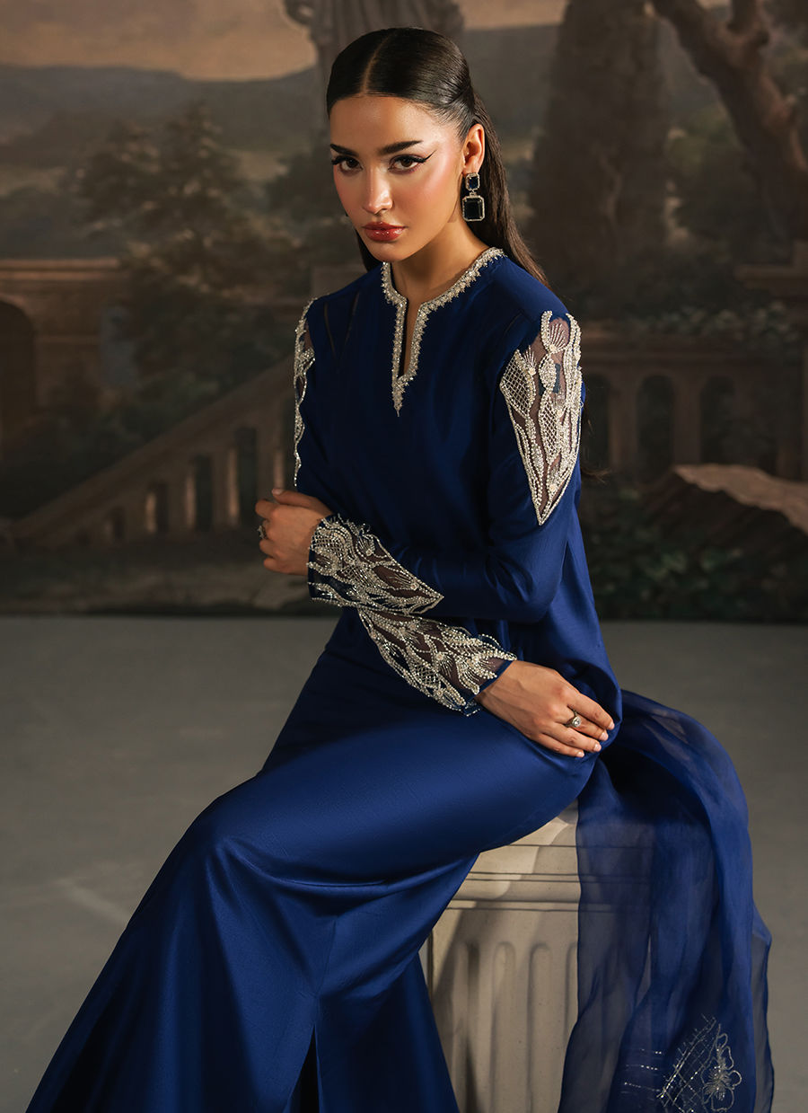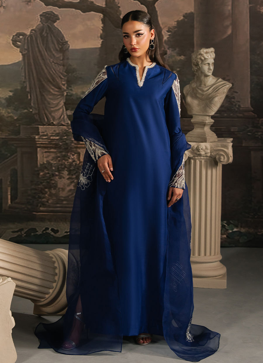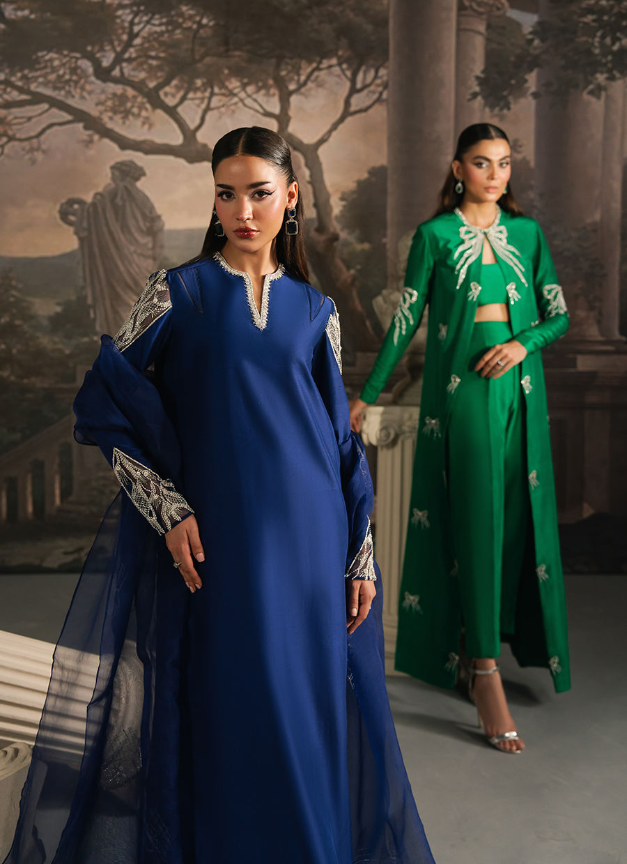 In tune with exclusive trends, Marcella is a long raw silk shirt, artfully adorned with delicate pearl and crystal embellishments. Its modernly Embellished And tailored sleeves set against a rich navy blue canvas create an effortless statement of elegance. Paired with straight pants and an organza dupatta edged with subtle finishing, this ensemble comes together as a complete vision of sophistication, a timeless choice for you.