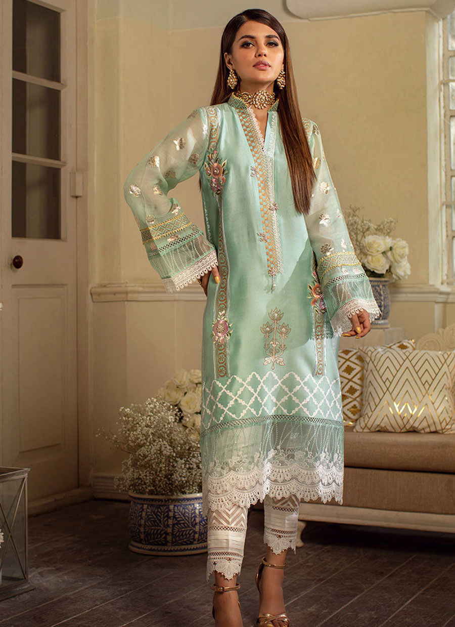 Cotton net long shirt with hand block printed details in golds, silvers and whites featuring silk thread embroidered rosettes on center front. The neckline of the shirt is adorned with pearls and dabka embellishments. The shirt is paired with embroidered white organza dupatta with pearls, sequins and lace finishing’s.