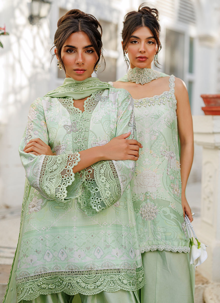 A chic mint green ensemble featuring a printed raw silk short shirt with delicate hand-embellished detailing and an embellished strap that adds a modern touch. It is paired with a flowing sheesha silk dhaka, while a narrow medium silk dupatta finished with brooch detailing completes the look. *Model is 5'5" and is wearing a size extra small.