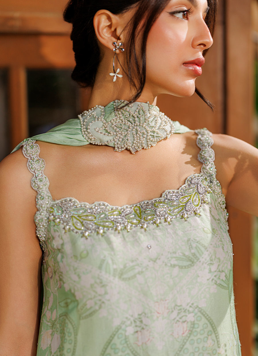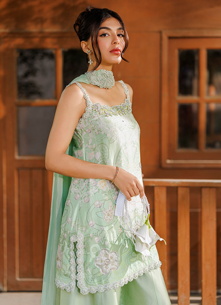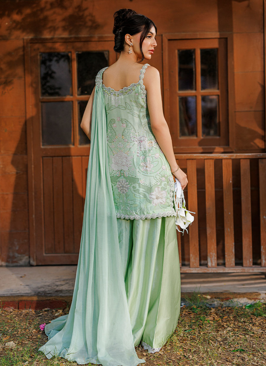 A chic mint green ensemble featuring a printed raw silk short shirt with delicate hand-embellished detailing and an embellished strap that adds a modern touch. It is paired with a flowing sheesha silk dhaka, while a narrow medium silk dupatta finished with brooch detailing completes the look. *Model is 5'5" and is wearing a size extra small.