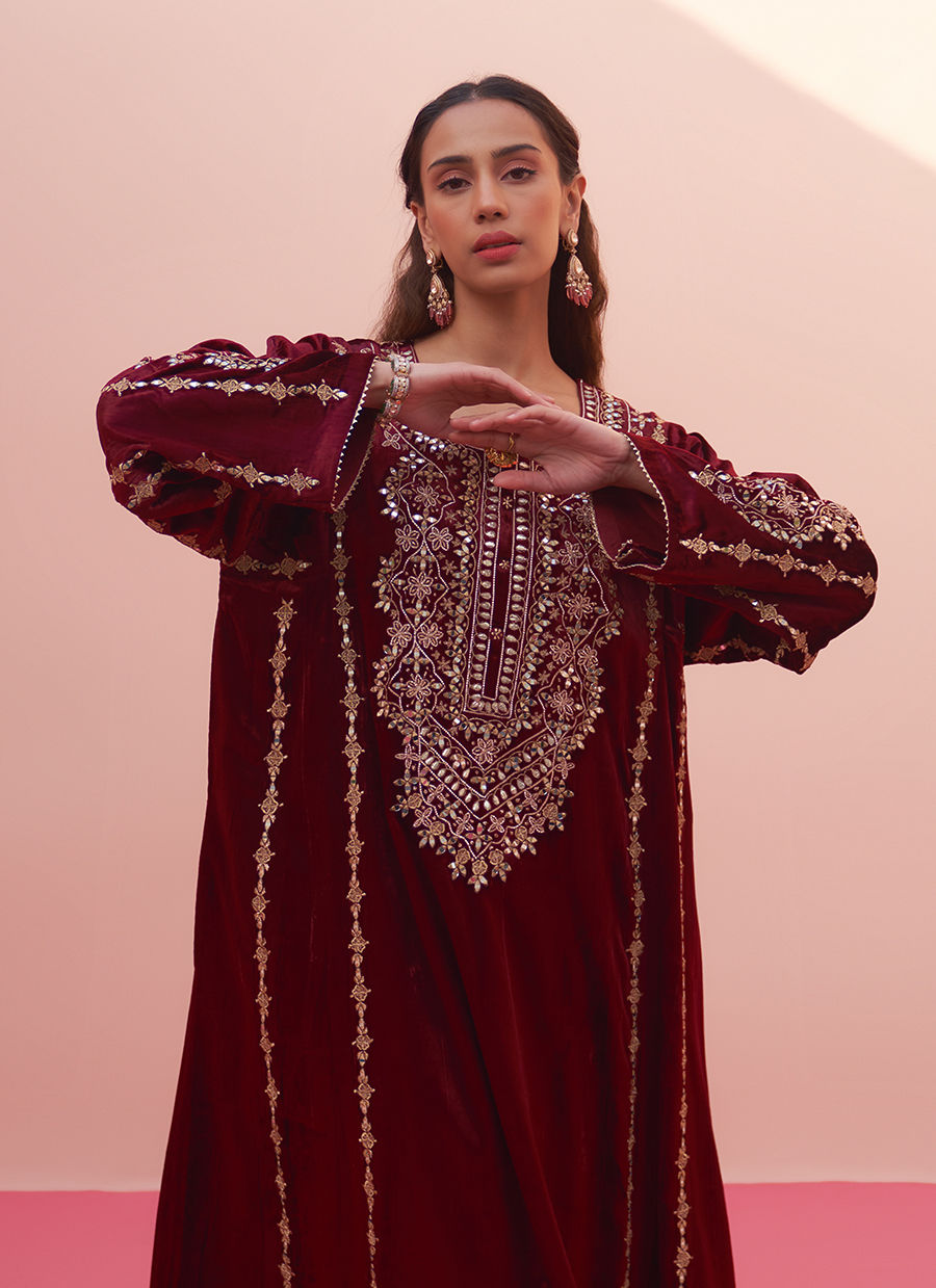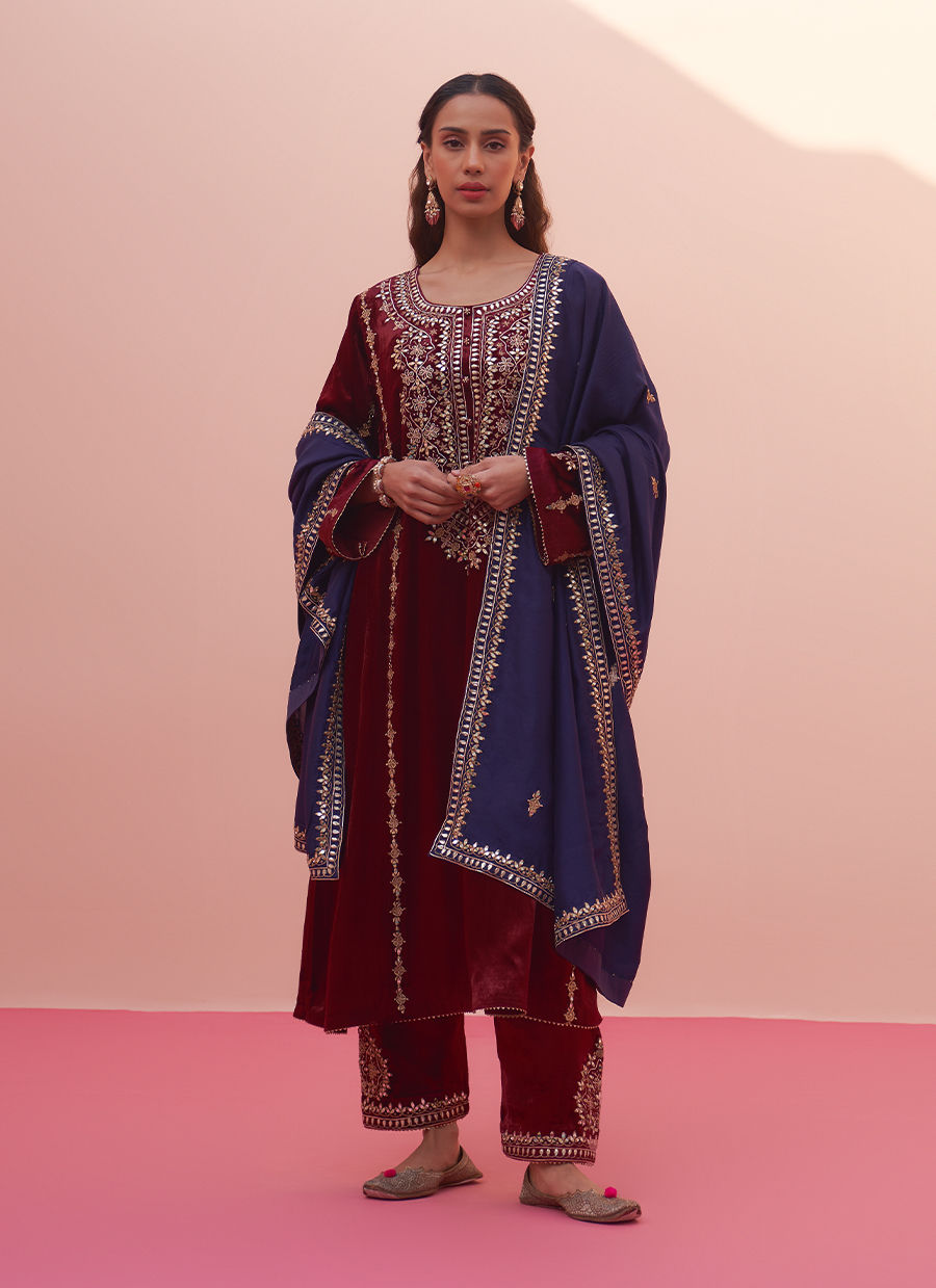 A Maroon Choga set paired with a deep purple dupatta embroidered with gold kasab and gotta work highlighted with mirror.