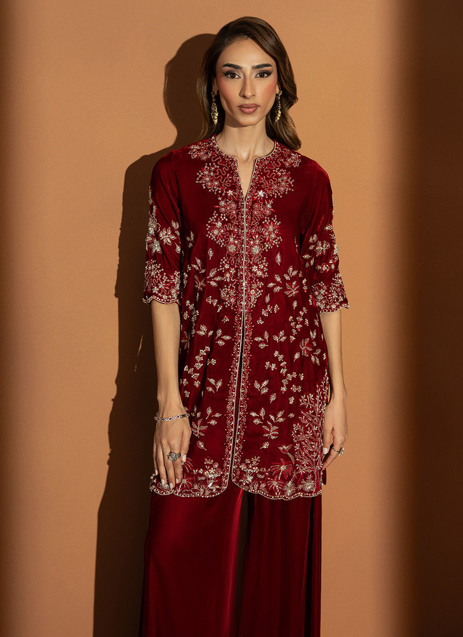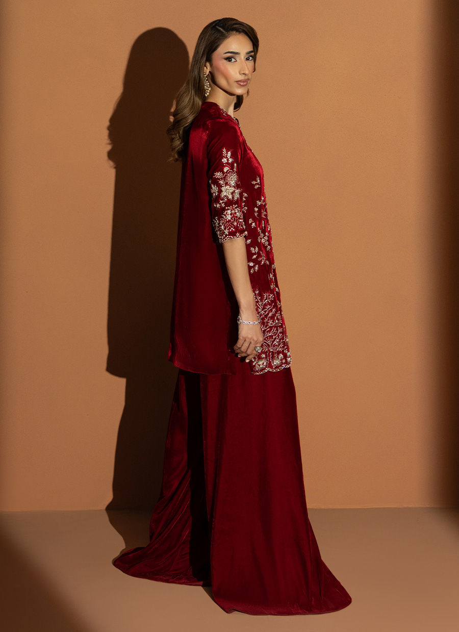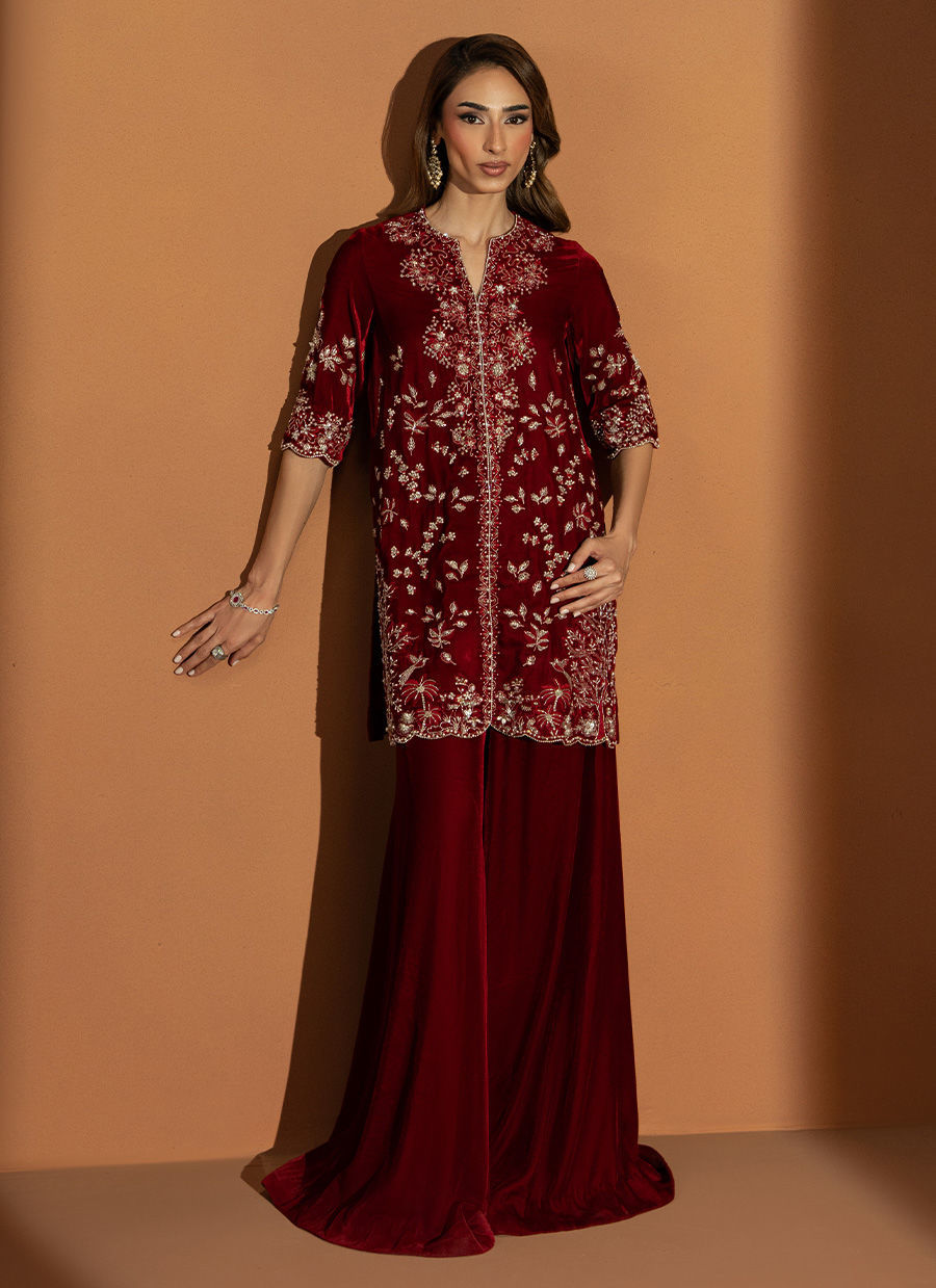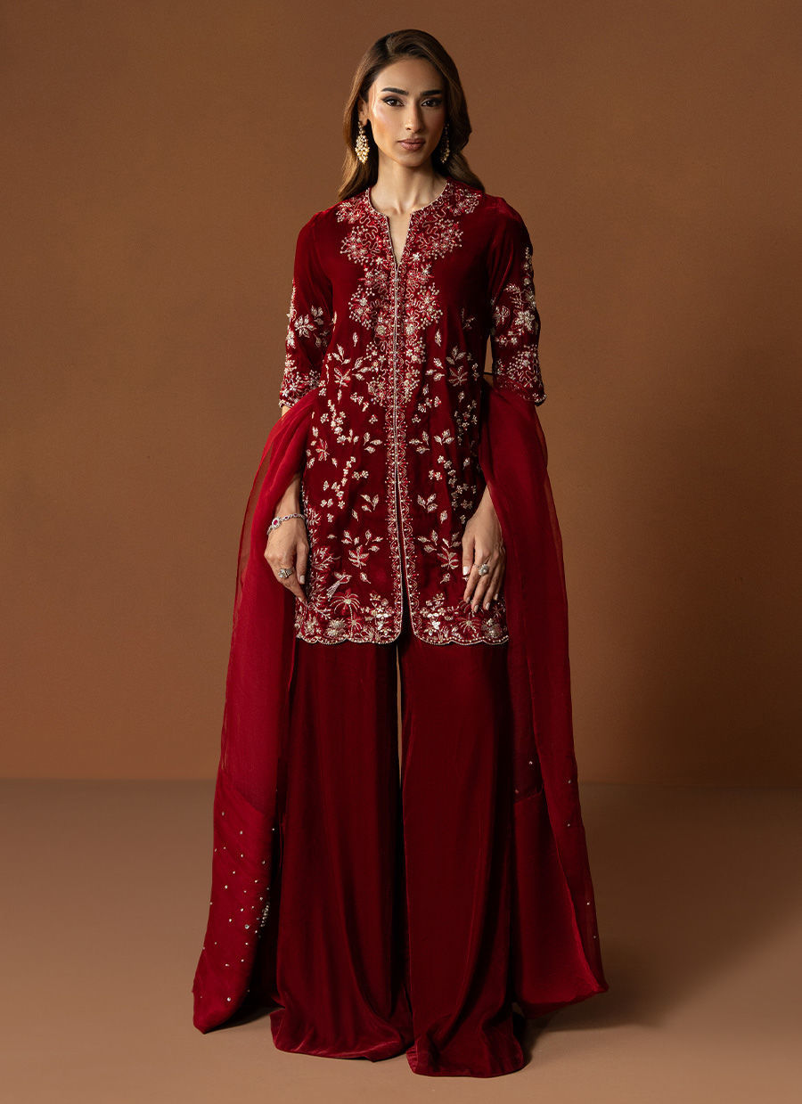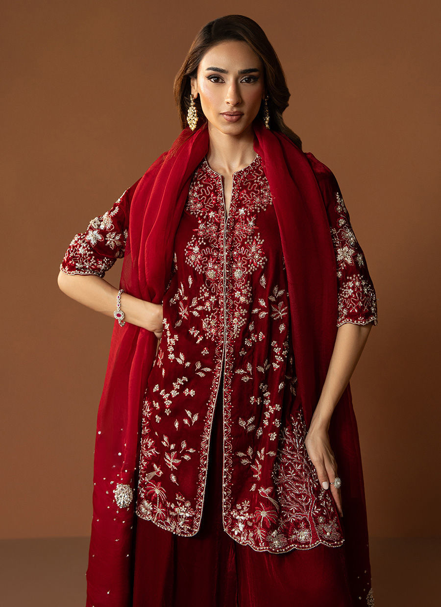 In a rich burgundy hue, Marquis embodies the essence of winter arrival. The short front-open velvet gown is detailed with heavy embellishments, reflecting timeless craftsmanship and regal charm. Paired with flared pants that lend graceful movement and a finely worked two-sided bordered dupatta, this outfit is a perfect blend of warmth, luxury, and enduring elegance.