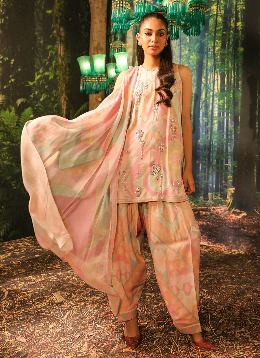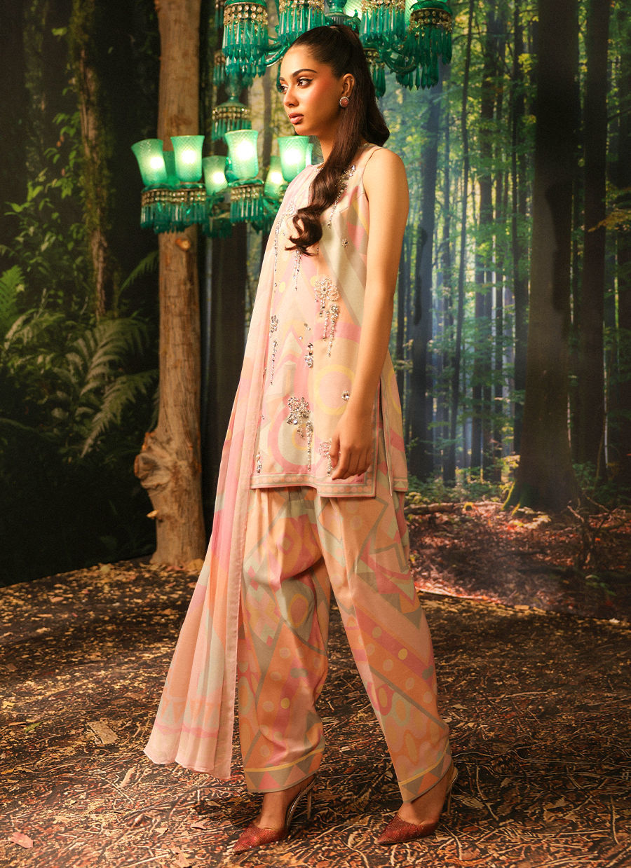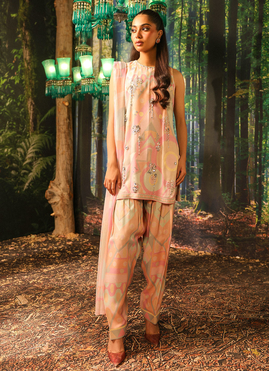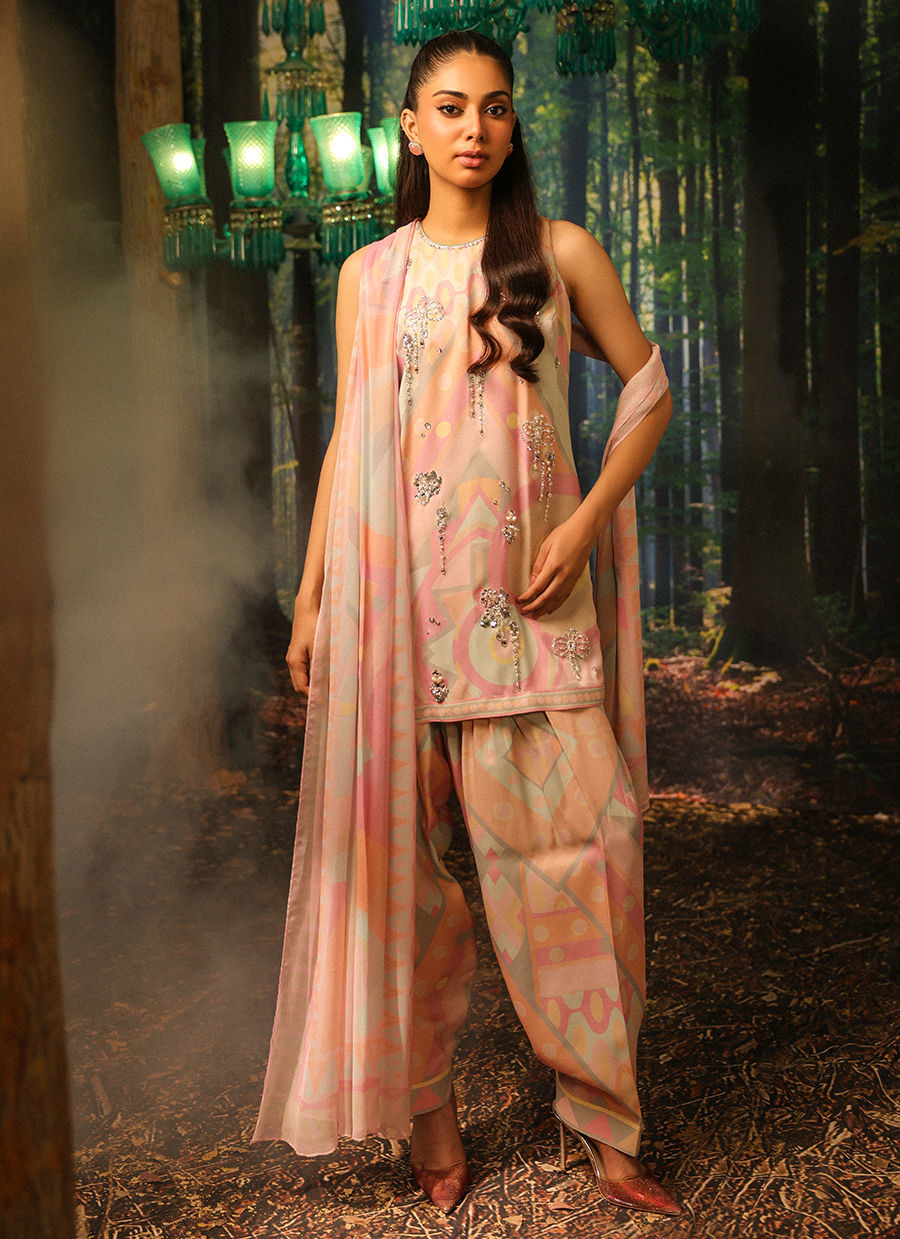 Color: Pastel Fabric: Shirt and Shalwar: Crepe, Dupatta: Silk Work Details: Handwork