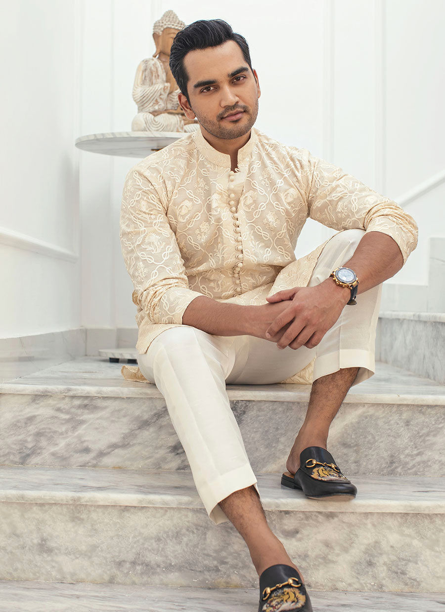 Ox silk kurta featuring abstract silk thread embroidered details in pastel butterscotch shade. The neckline is adorned with loop buttons and the kurta can be paired straight cotton white pants.
