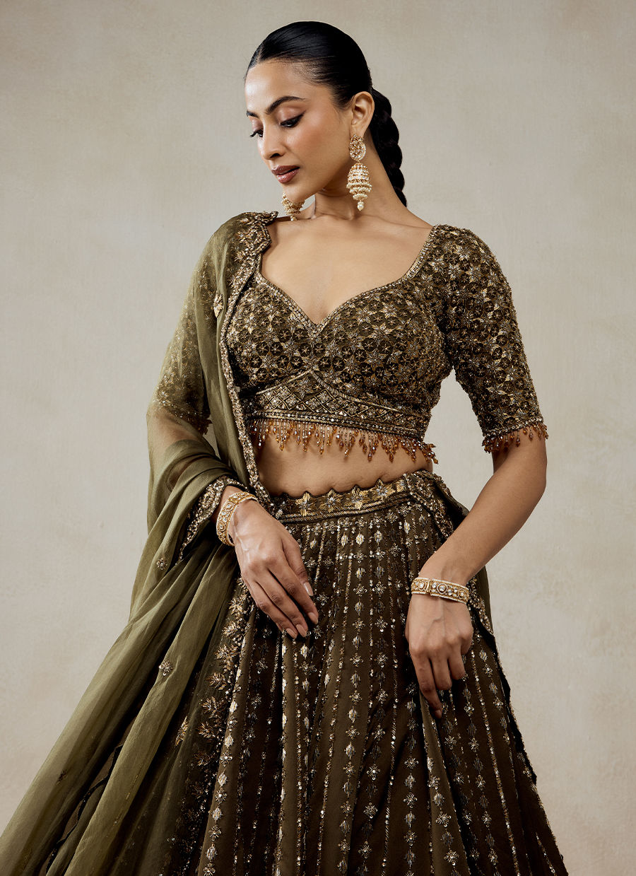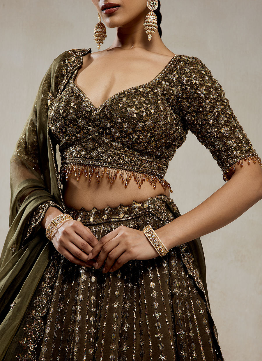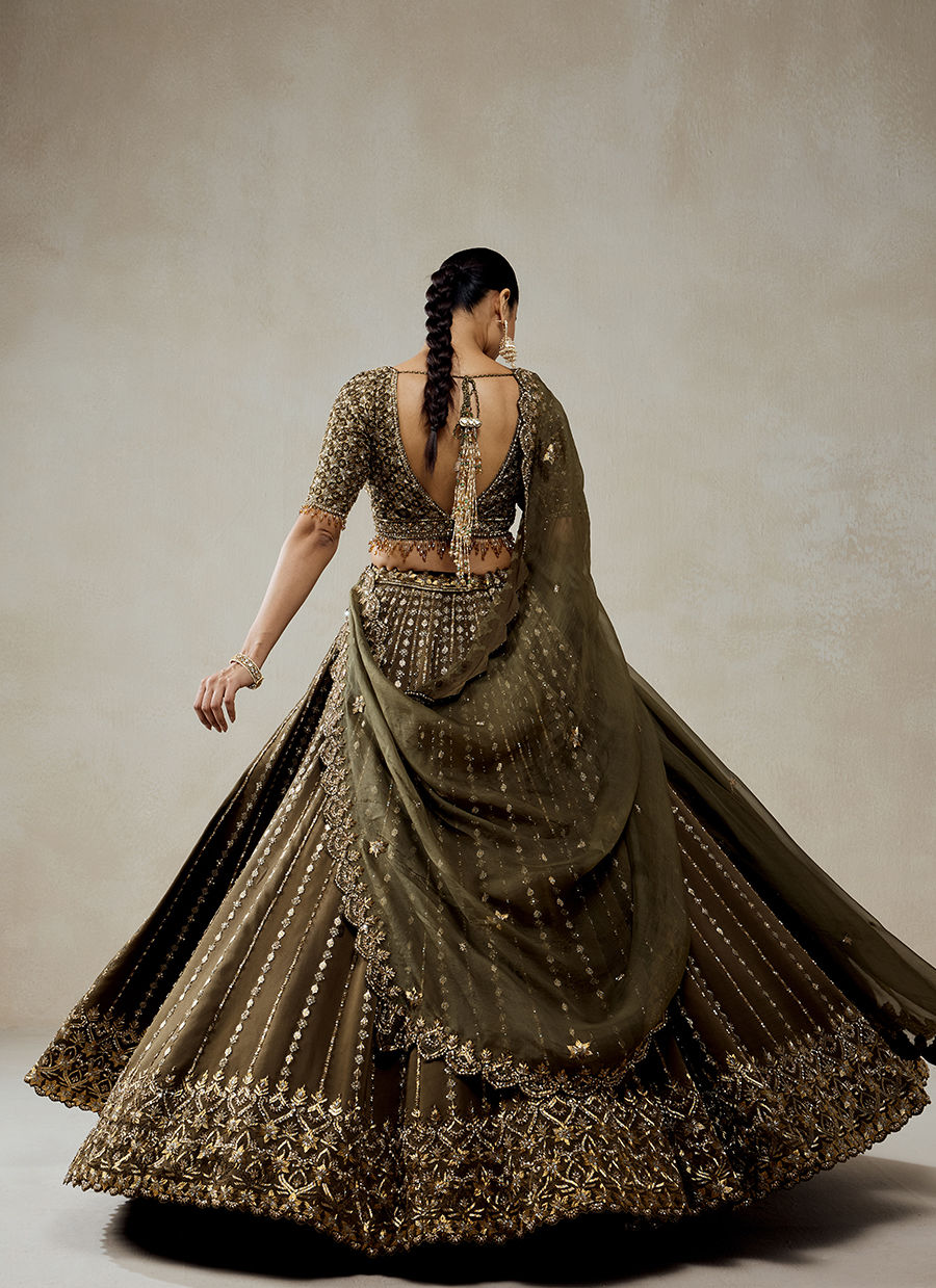 A richly embellished lehenga ensemble that celebrates grandeur and heritage craftsmanship, crafted in a luxurious blend of organza, satin, and shantoon. The lehenga features Vertical embroidered panels, elongating the silhouette. A heavily embellished hemline border, dense with intricate motifs for a grand finish. The blouse is richly adorned with All-over hand embroidery, featuring zari, sequins, and delicate beadwork. Fine detailing along the neckline and hem for a couture finish. The dupatta is Lightly embellished with scattered motifs and a detailed border, adding softness without overwhelming the look.