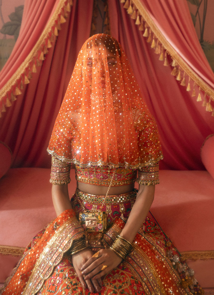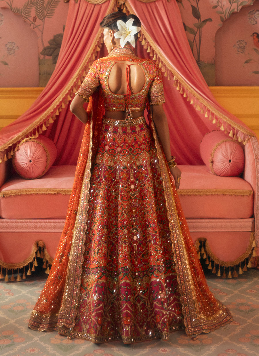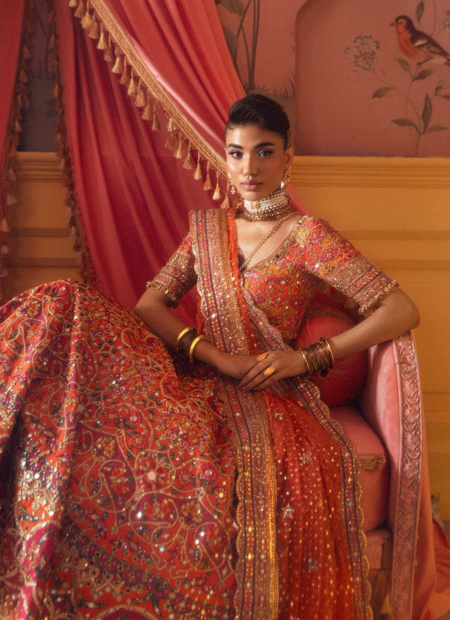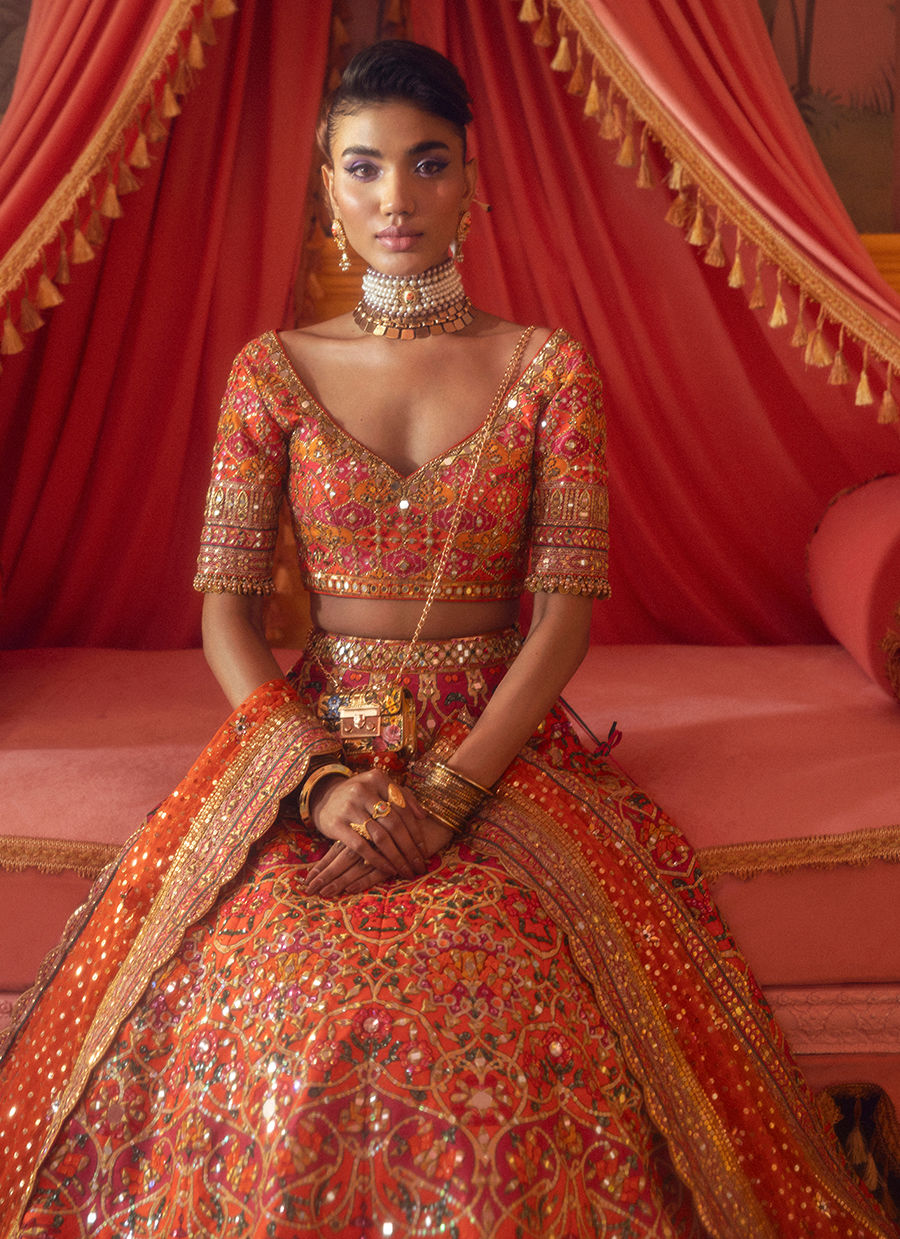 In a fiery orange hue, this bridal look sparkles with mirrorwork and rich gold detailing, weaving a tale of tradition and romance.