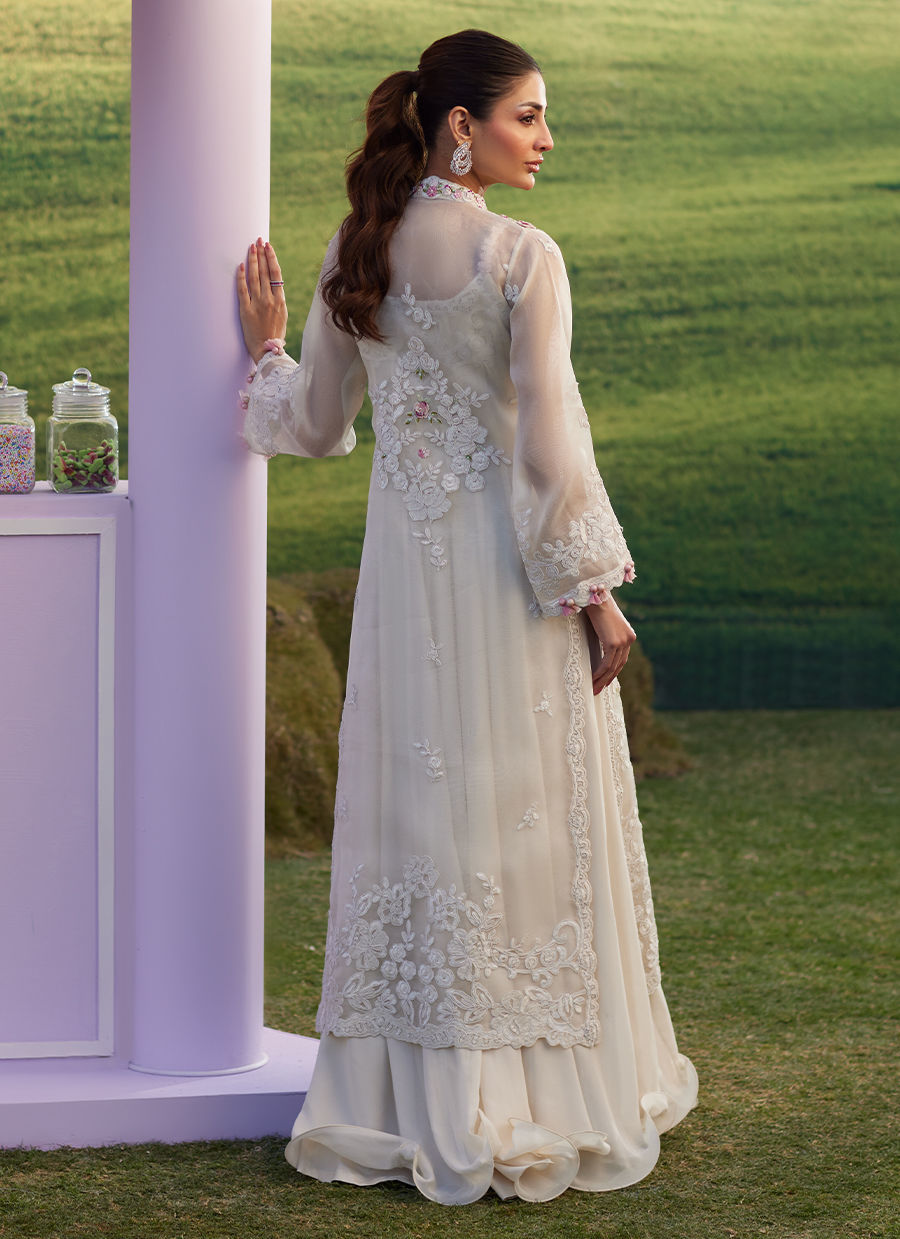 Bask in the glow of subtle sophistication with Melia — a delicate statement designed for the most special celebrations. This ethereal off-white organza jacket is beautifully embroidered with resham and cord work, further elevated with intricate 3D flowers, petals, sequins, and cut glass beads in soft shades of pastel pinks and greens. Layered over a flowing inner chiffon dress, featuring matching embroidery around the neckline, this ensemble feels effortlessly graceful and timeless — perfect for Eid festivities, intimate gatherings, and elegant evenings.