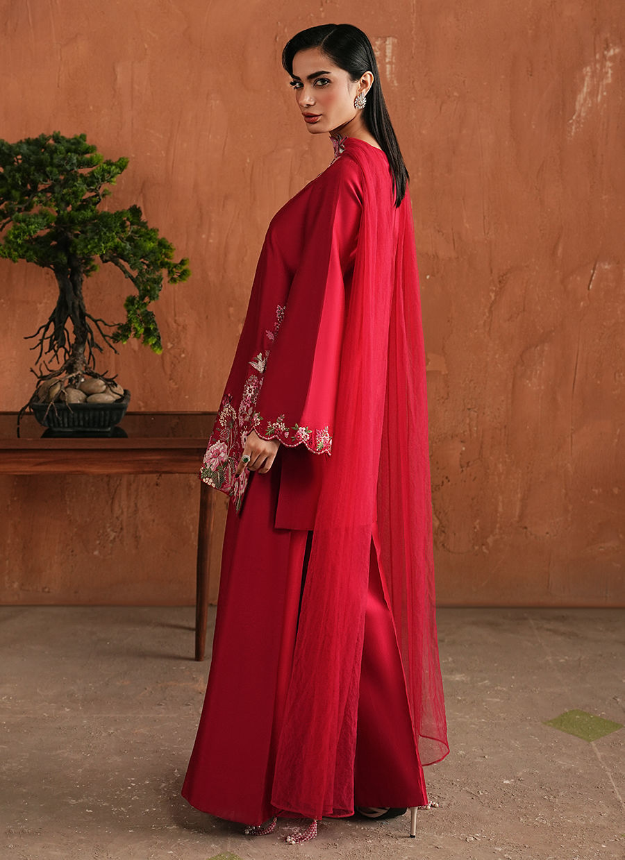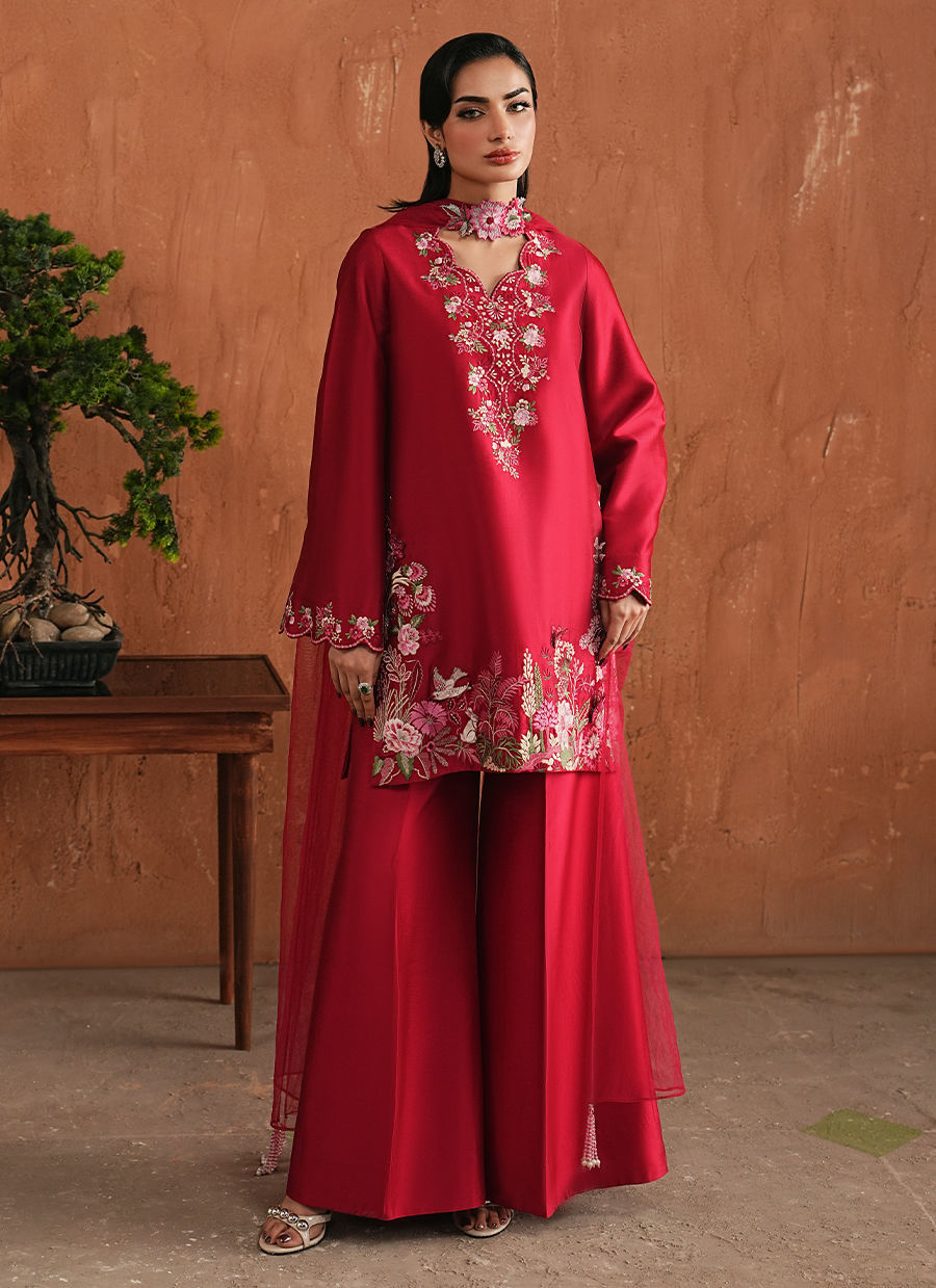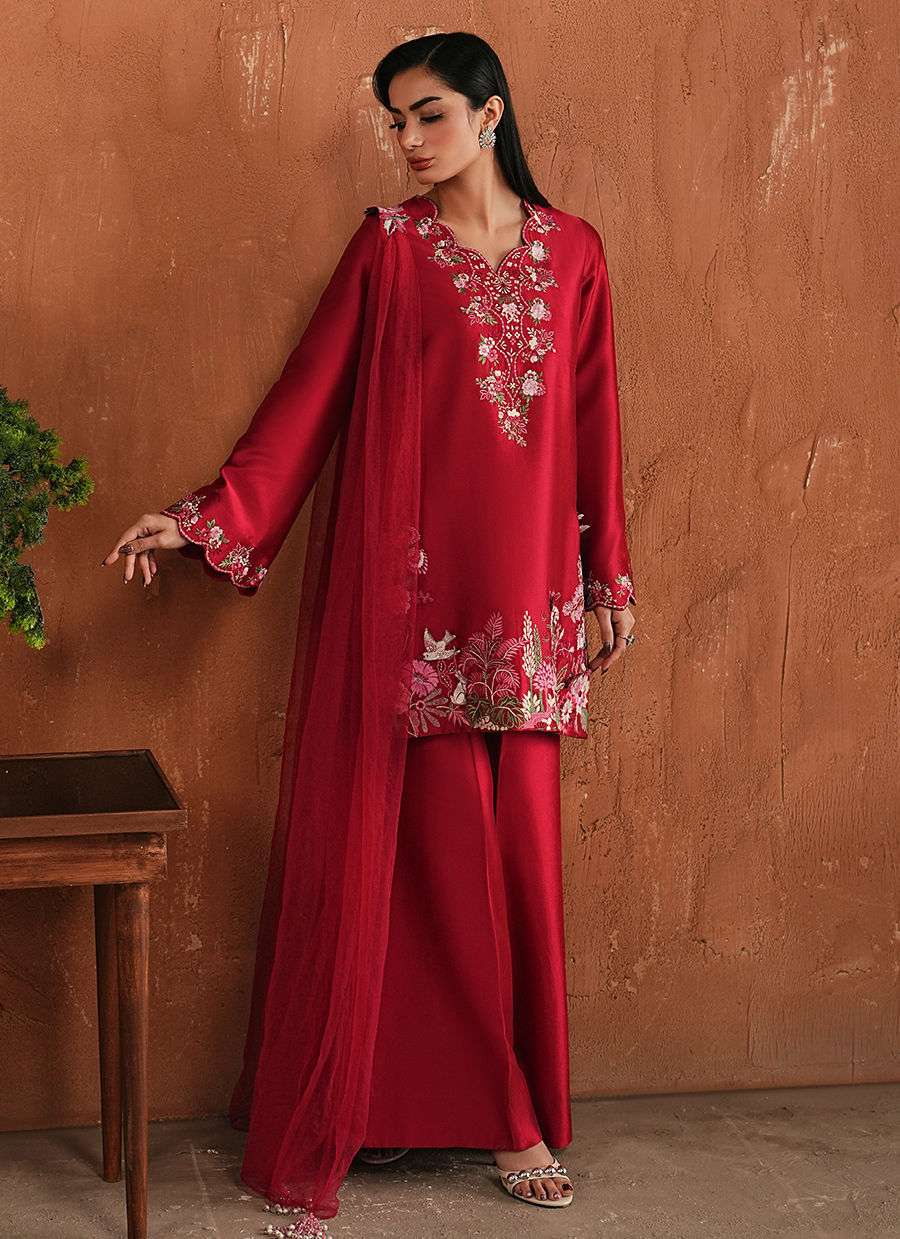 Favourite pick of our creative designer.A deep pink tone sets the mood for this look. The short Korean Raw Silk shirt is finished with intricate hand embroidery along the neckline, sleeves, and borders, giving the piece its character and depth. Paired with flared trousers for a graceful fall, the look is completed with a finely pleated net dupatta, detailed with the same motifs as the shirt.