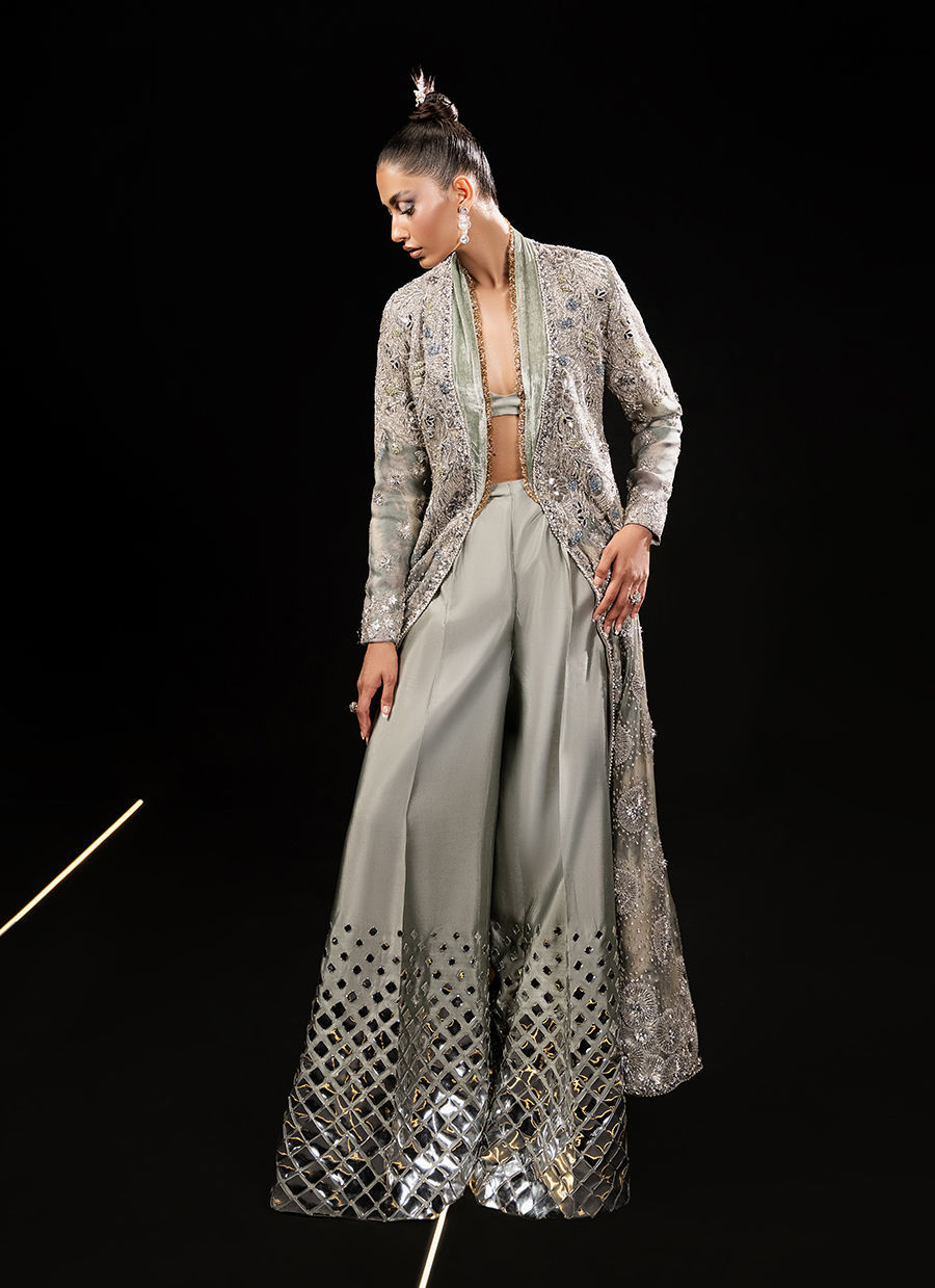 Includes: Jacket with Bustier Paired with a Trouser This light sage green ensemble features a front open organza jacket, intricately adorned with dabka naqshi, mukesh work, and striking French knot details in contrasting hues. Velvet patchwork florals, along with a velvet collar adorned with kiran details, bring an opulent touch to the piece. Delicate beadwork, pearls, sequins, and Swarovskis elevate the embellishments, while the tie-dye lining adds depth to the intricate embroidery. Paired with a flared boot-cut trouser made from tissue silk, intricately hand-sewn with leatherette, this outfit is designed to leave a lasting impression.