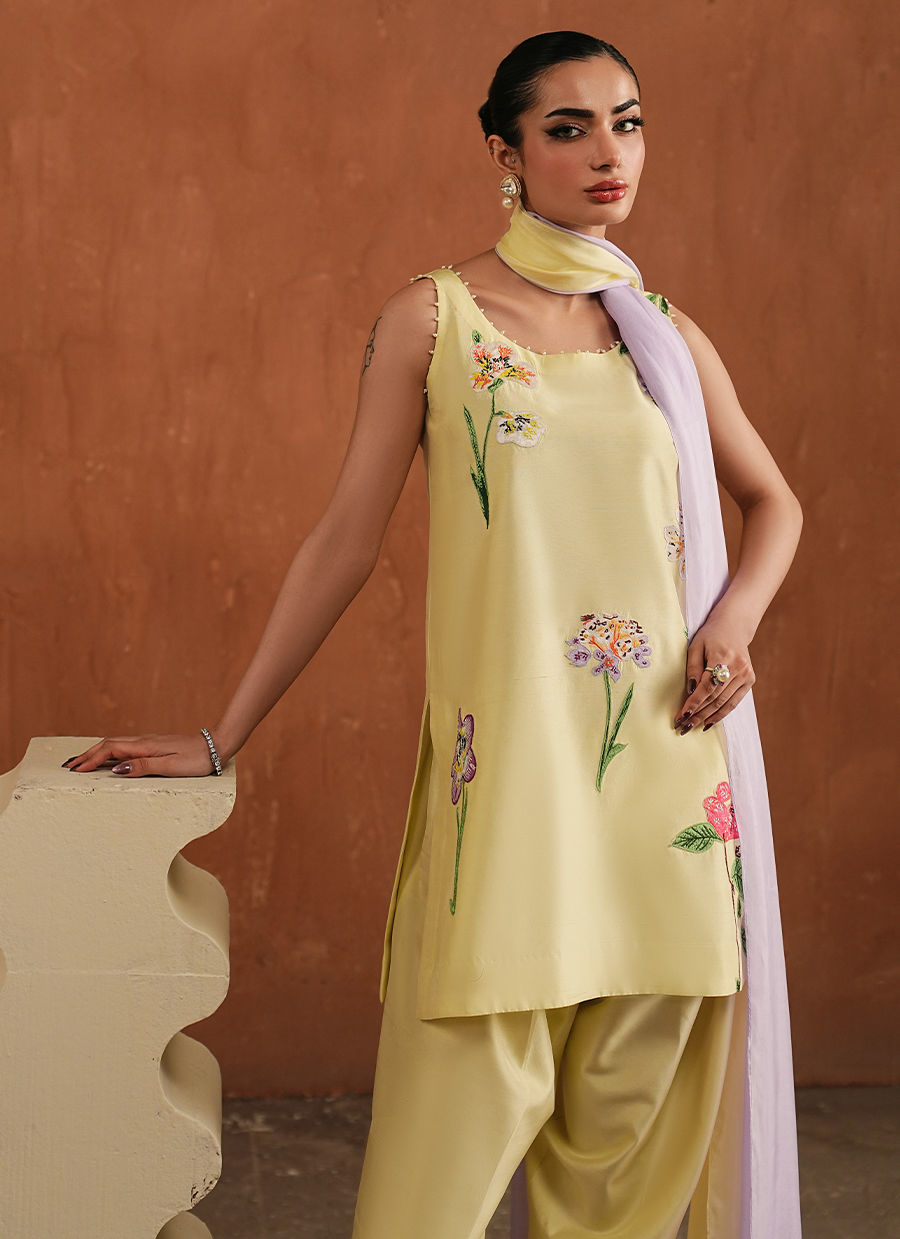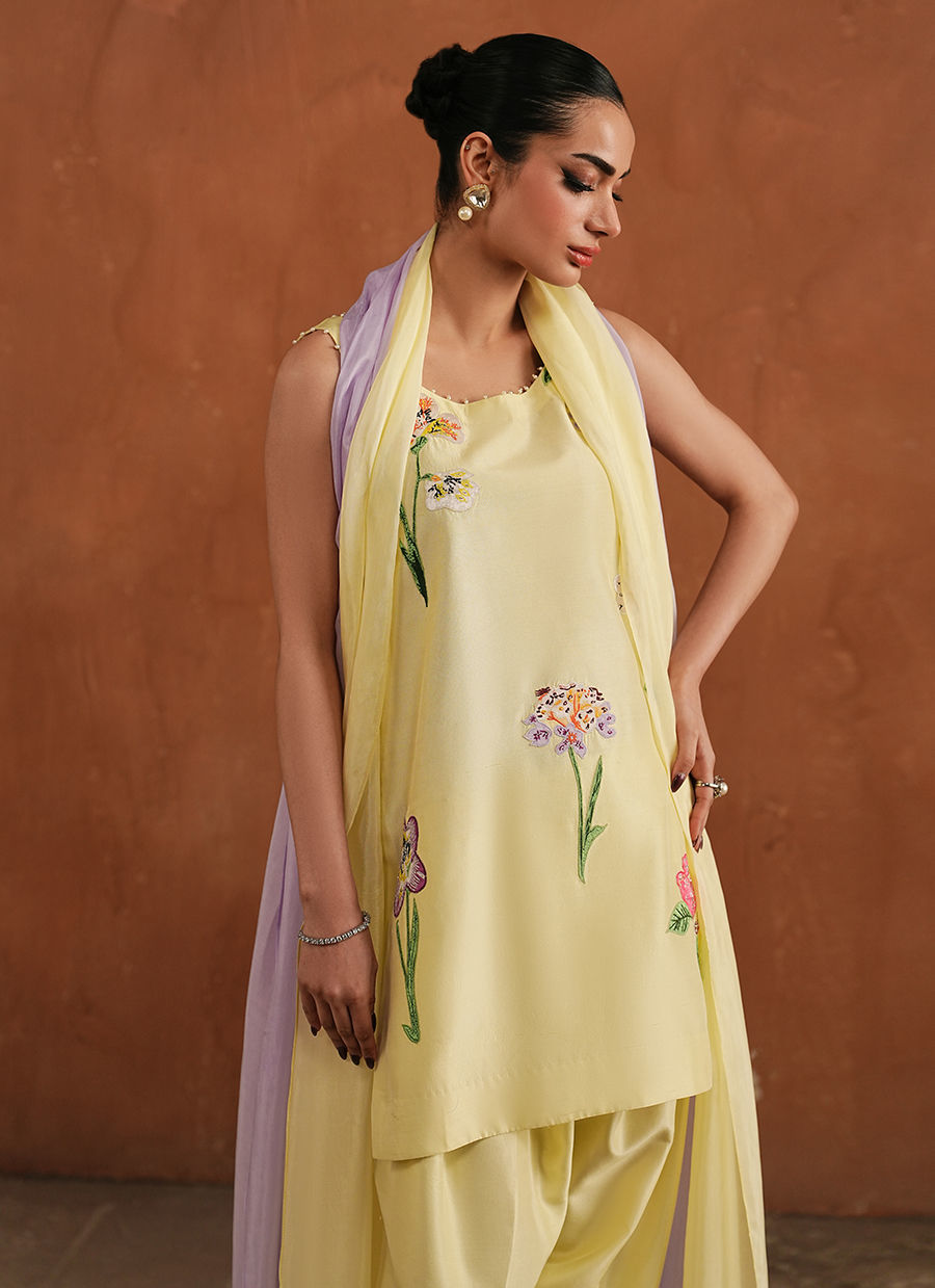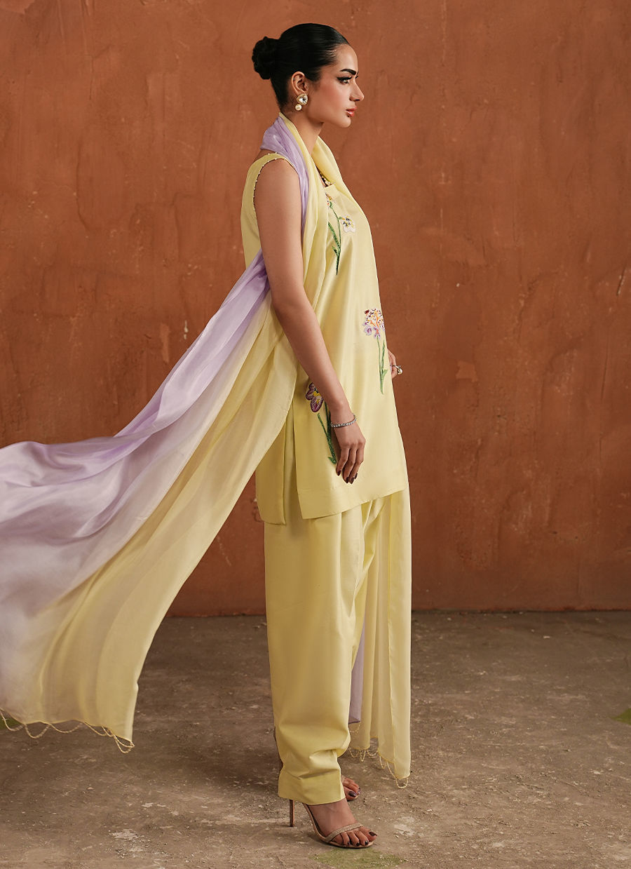 A soft pastel short Korean raw Silk shirt with floral details, worn with a comfortable shalwar and a two-toned dupatta. Finished with light appliqué and small embellishments, this look is about ease and wearability, made for everyday Ramadan dressing without overthinking it.