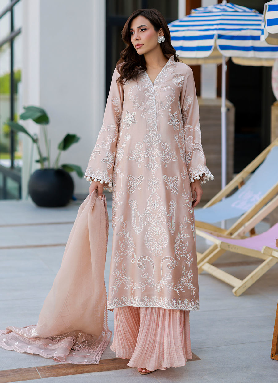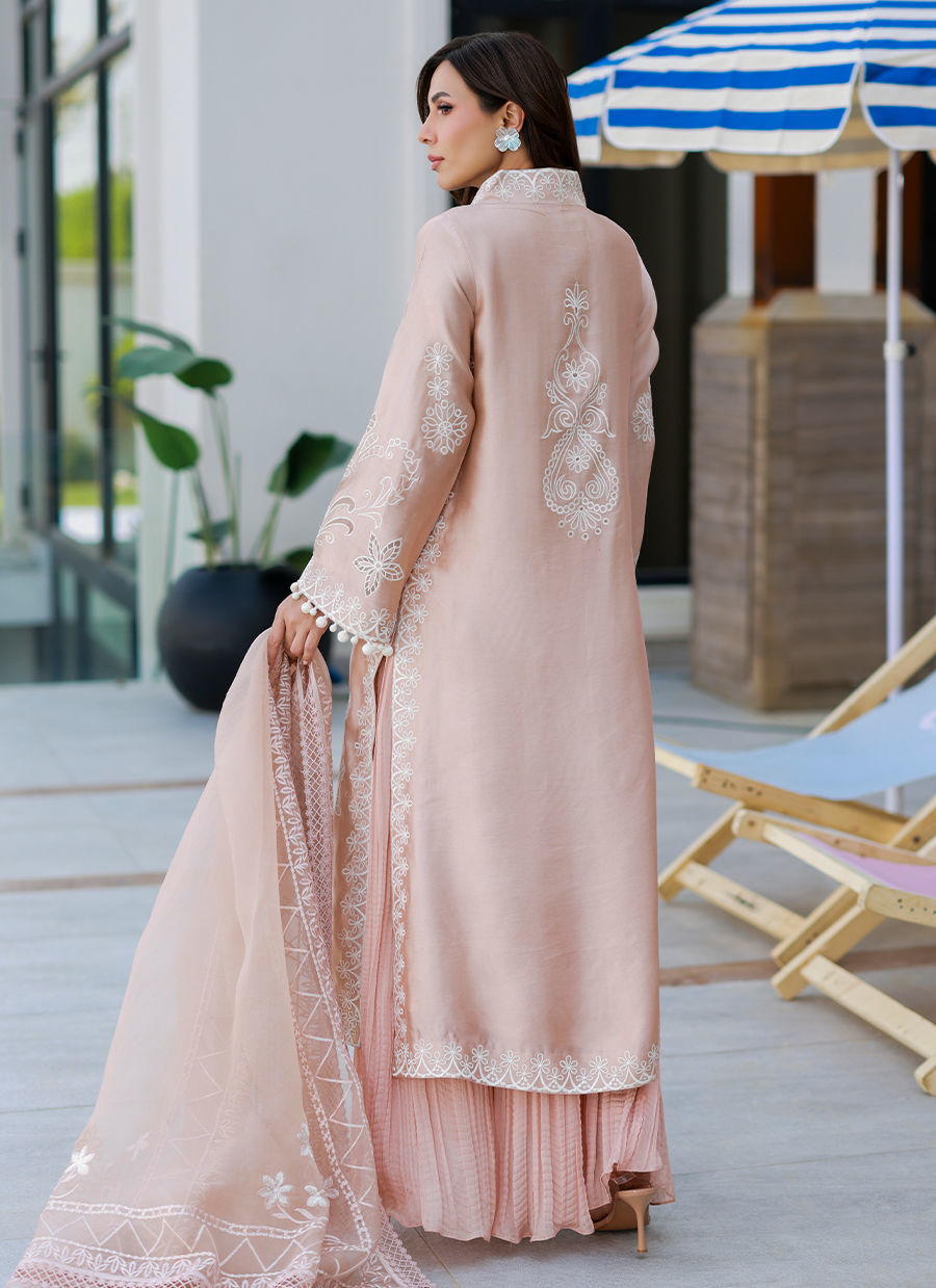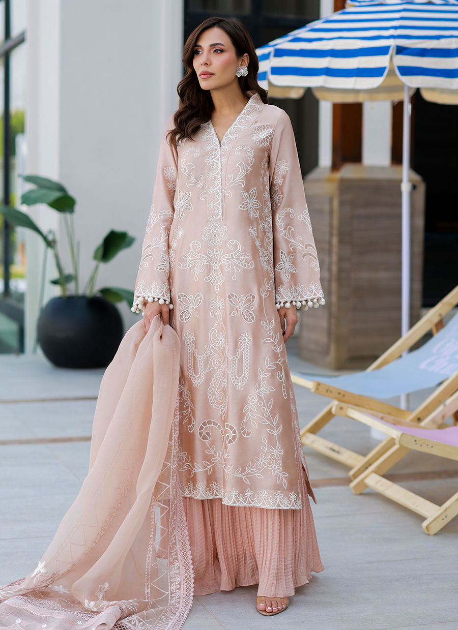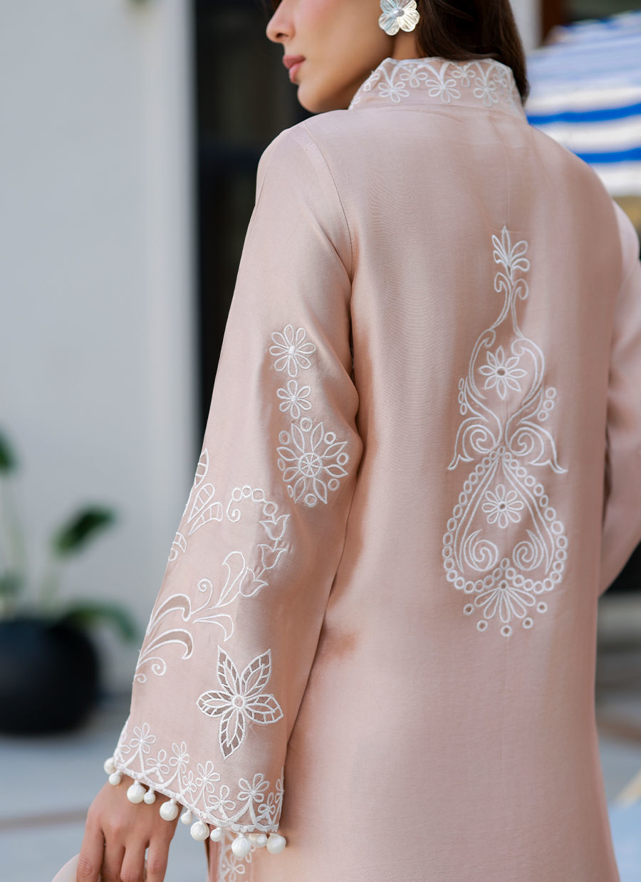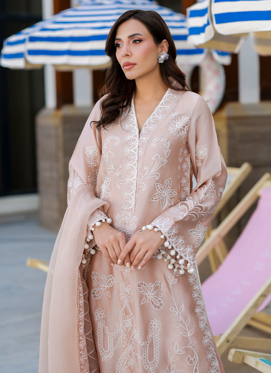 A long nude-toned kurta in Sheesha silk adorned with off-white resham embroidery and delicate Schiffli cutwork, paired with a crushed silk Izaar and complemented by an embroidered organza dupatta.