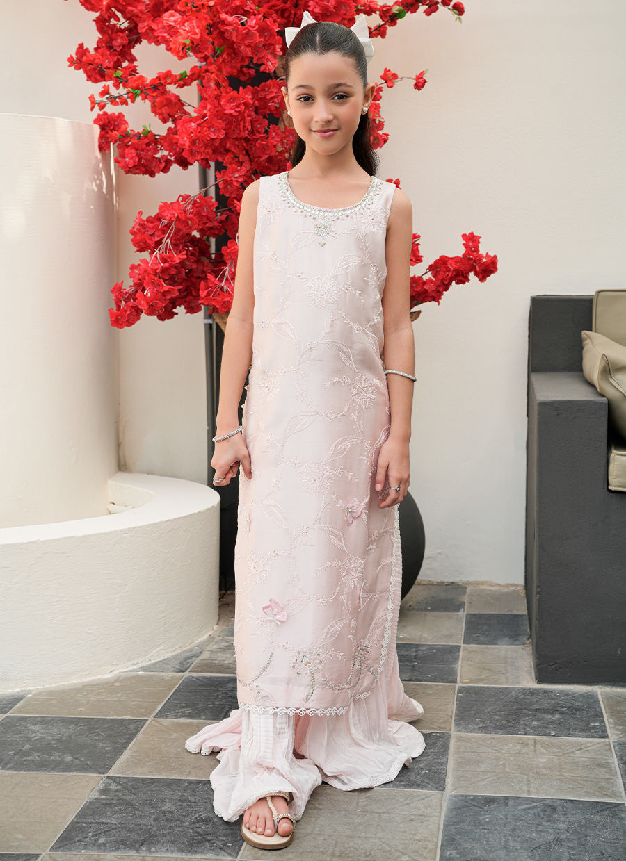 A romantic blush pink mommy and me ensemble, delicately draped and adorned with intricate embellishments and fine embroidery. The fluid silhouette creates a soft, ethereal presence bringing together timeless femininity with a refined, modern festive allure.