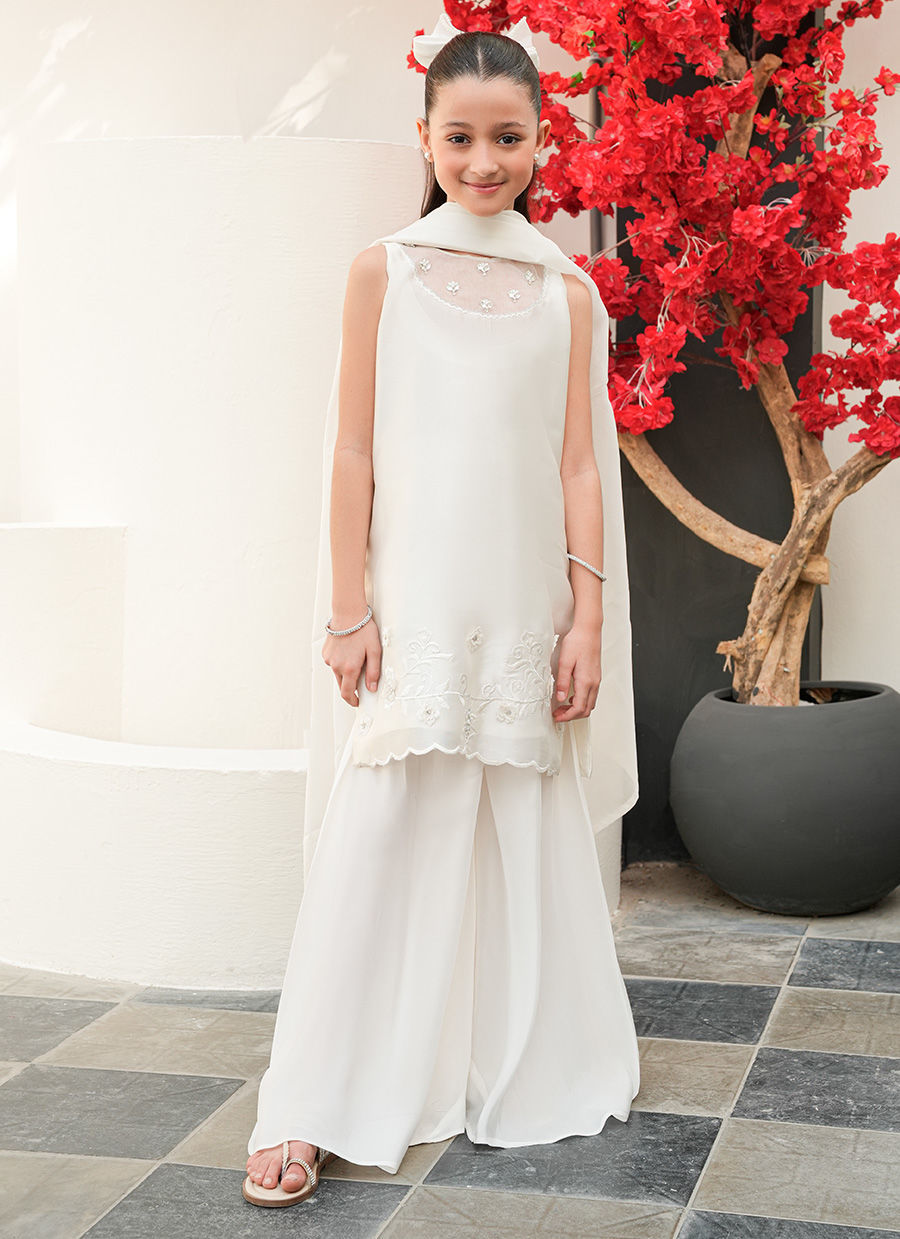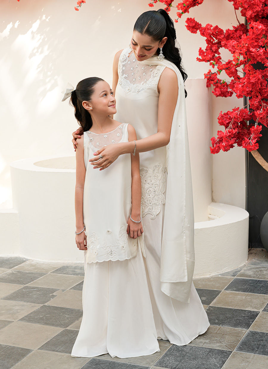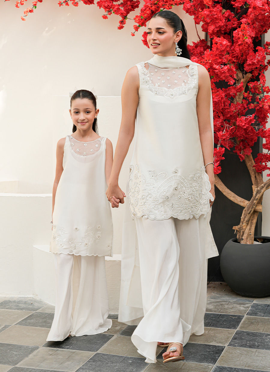 An ethereal ivory mommy and me ensemble, adorned with refined pearl embellishments and delicate scalloped embroidery, tailored in a modern, fluid silhouette. Paired with flowing bottoms, the design embodies timeless elegance crafted for graceful daytime festivities and cherished celebratory moments.