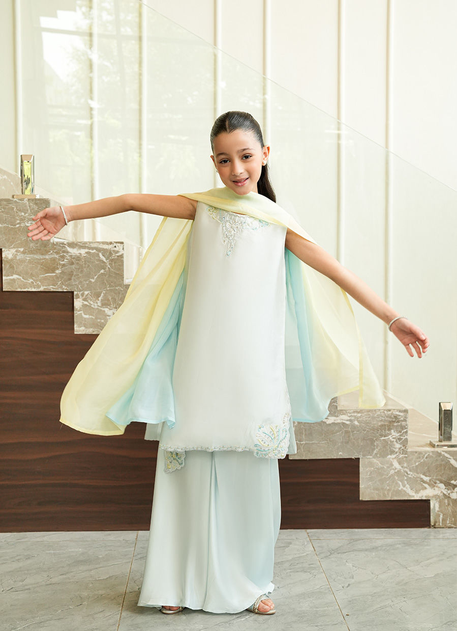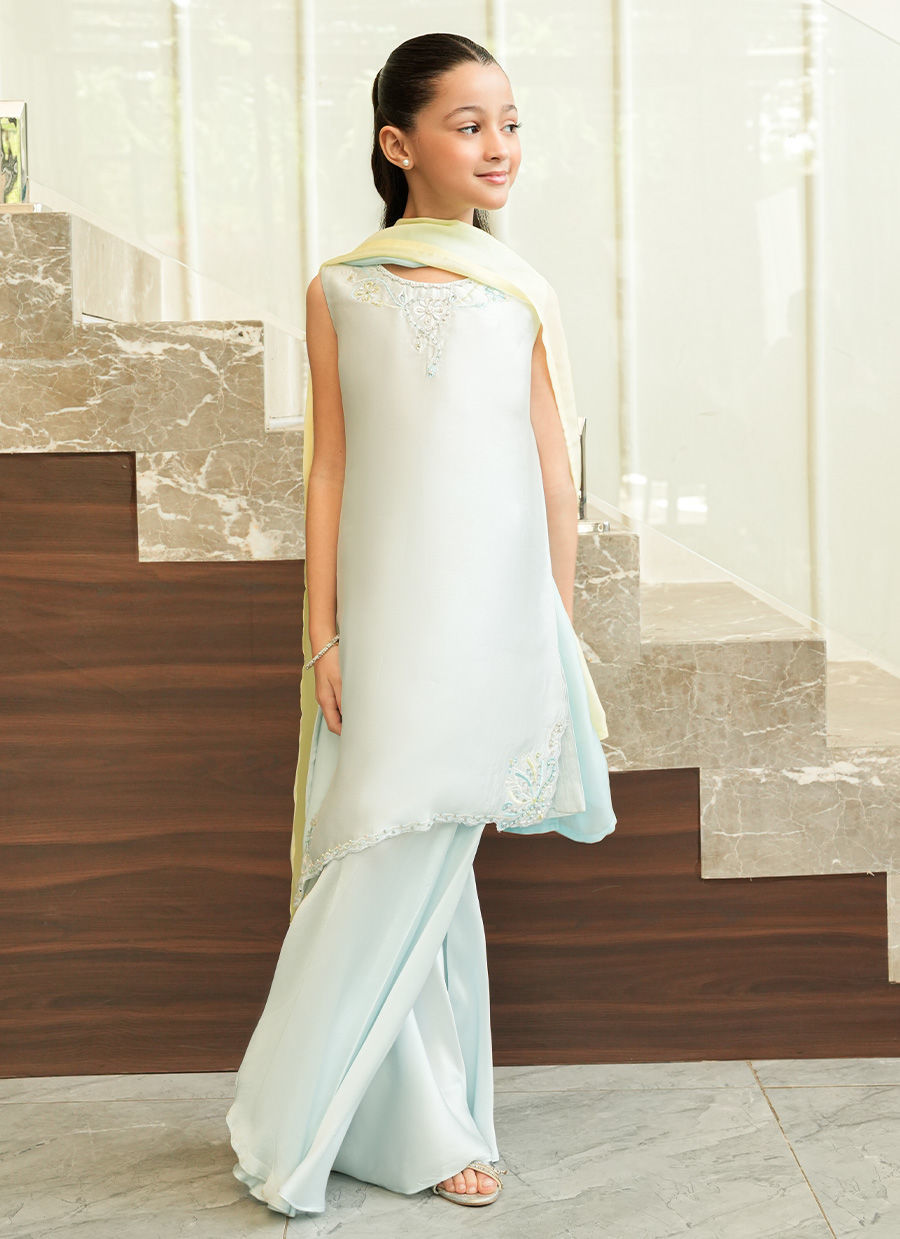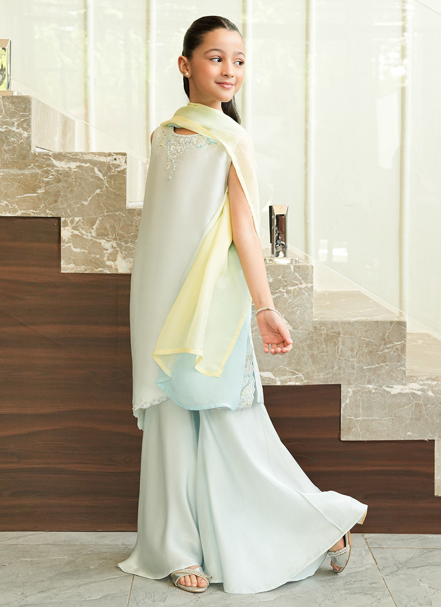 A refreshing pastel blue asymmetrical ensemble, delicately embroidered along the neckline and hem, and accented with hand-embellished stones and pearls for a soft festive shimmer. Paired with fluid flared pants and a contrasting lemon yellow dupatta, the look captures modern elegance with a playful, uplifting pop of color.