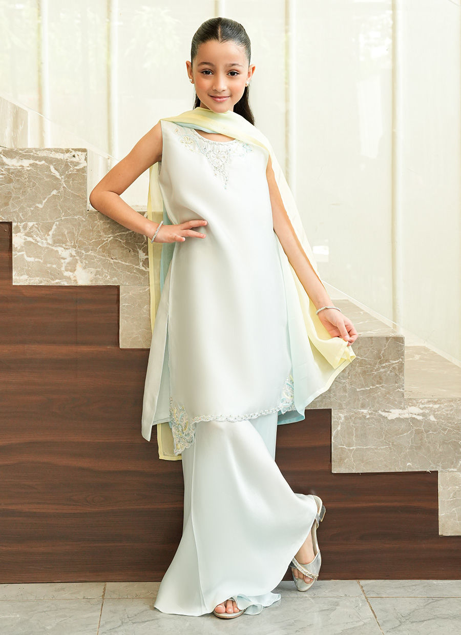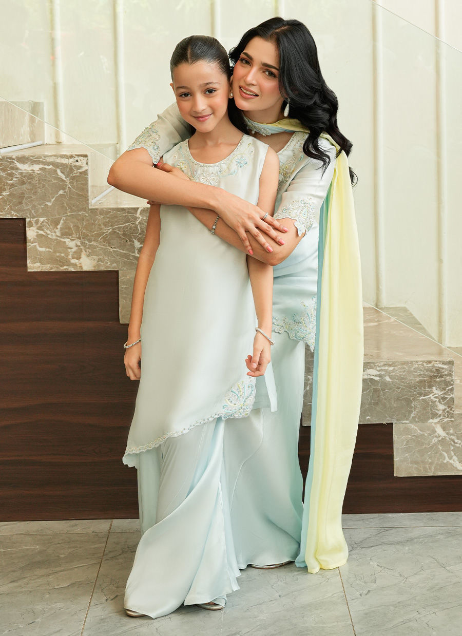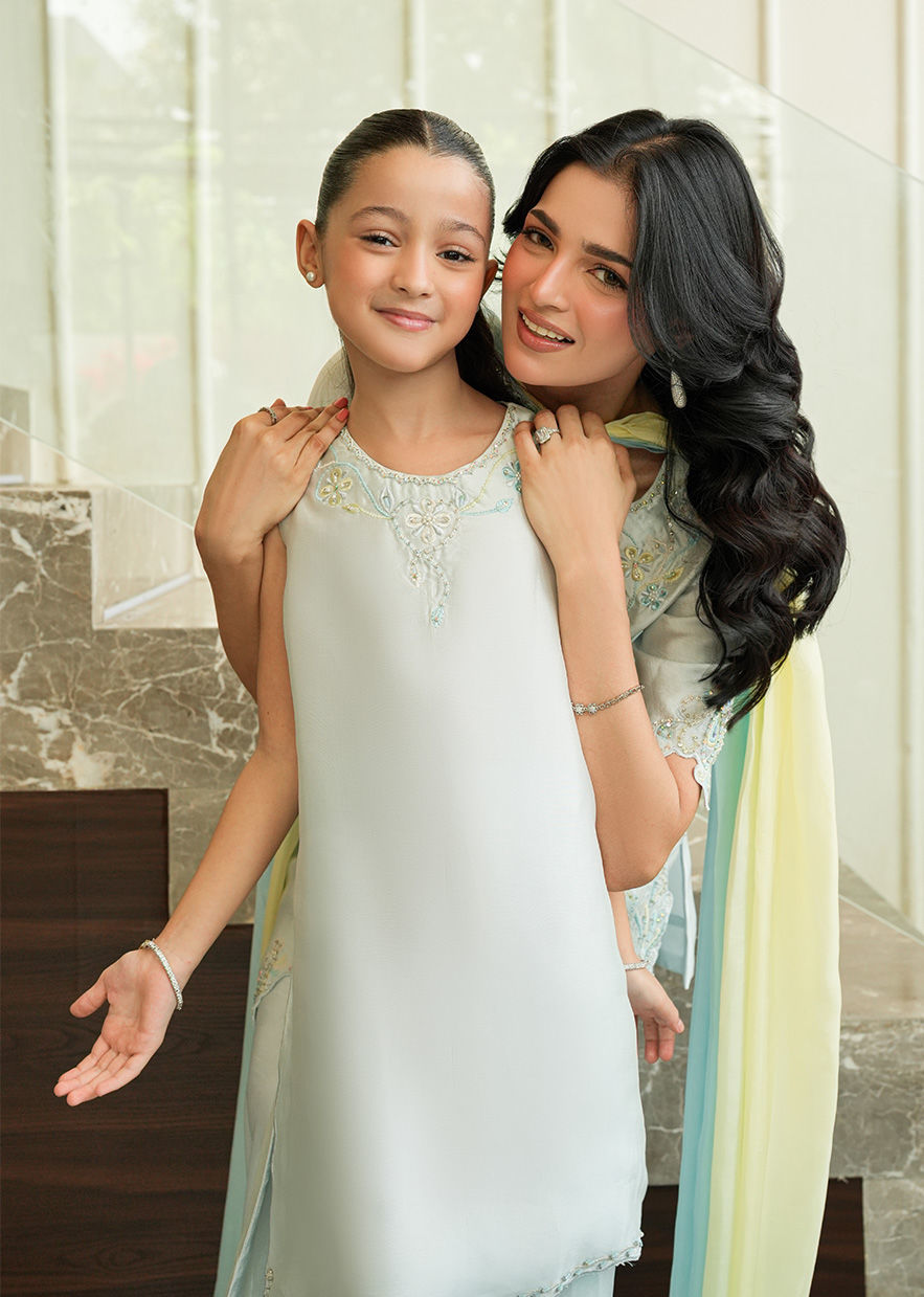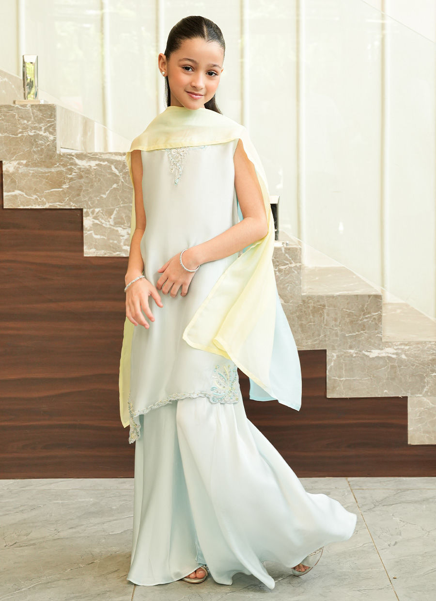 A refreshing pastel blue asymmetrical ensemble, delicately embroidered along the neckline and hem, and accented with hand-embellished stones and pearls for a soft festive shimmer. Paired with fluid flared pants and a contrasting lemon yellow dupatta, the look captures modern elegance with a playful, uplifting pop of color.