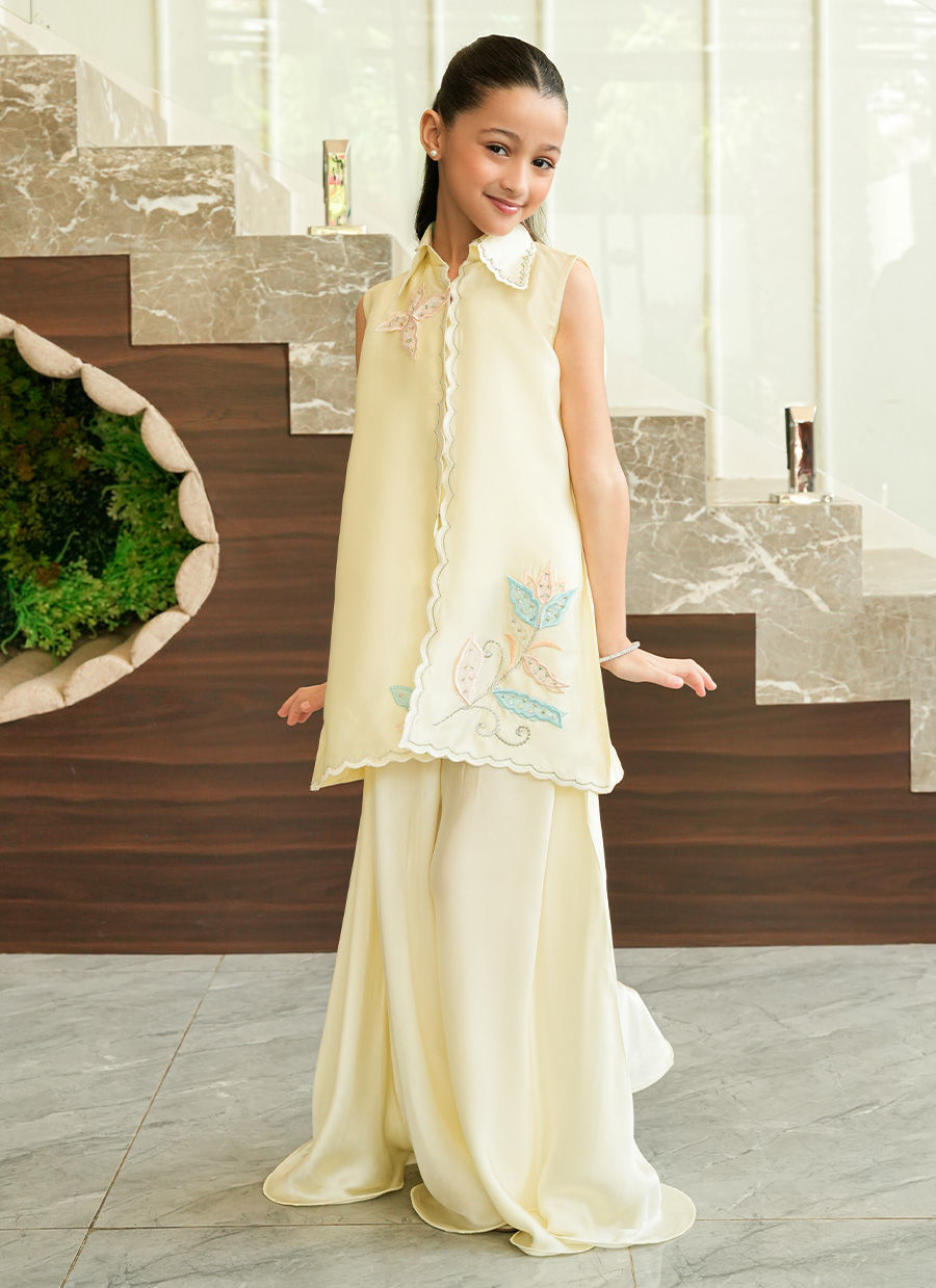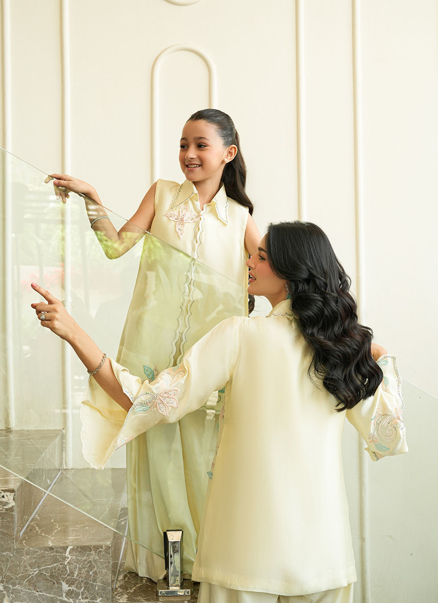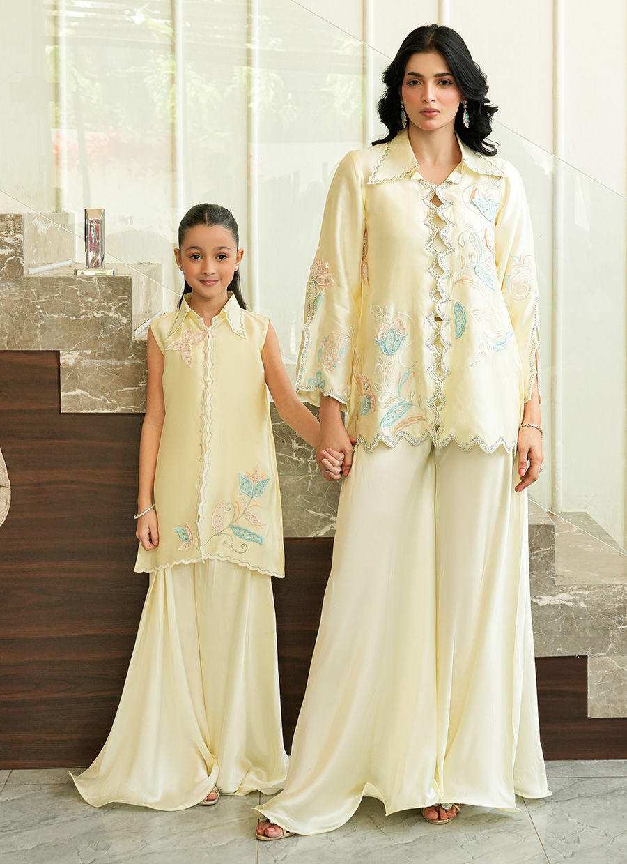 A refreshing pastel yellow mommy and me ensemble adorned with delicate floral embroidery in soft blue and blush hues, elevated with intricate scalloped detailing. Paired with fluid wide-leg trousers, the silhouette flows with graceful ease balancing effortless sophistication with a touch of playful charm.