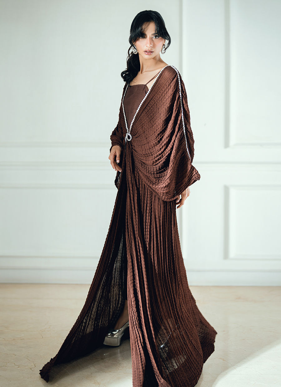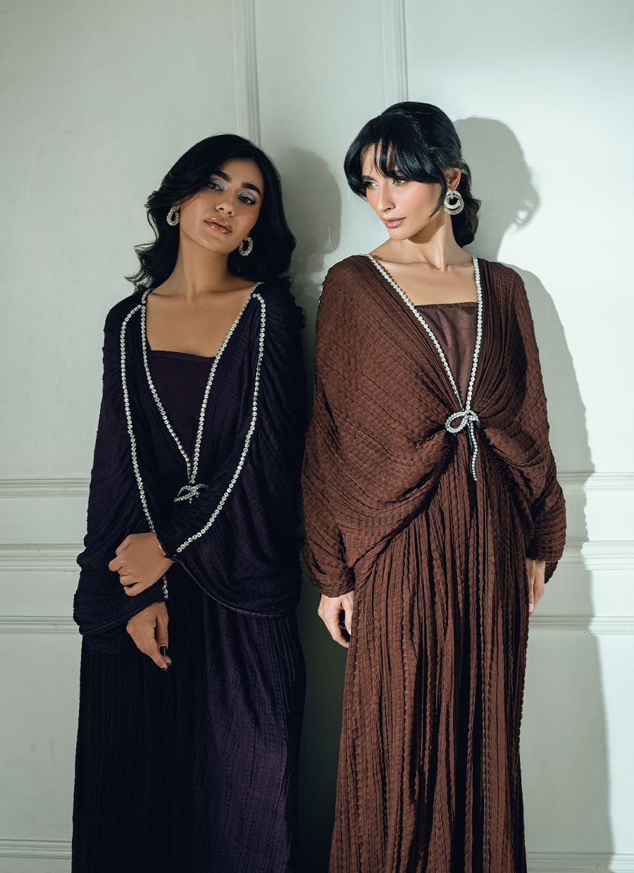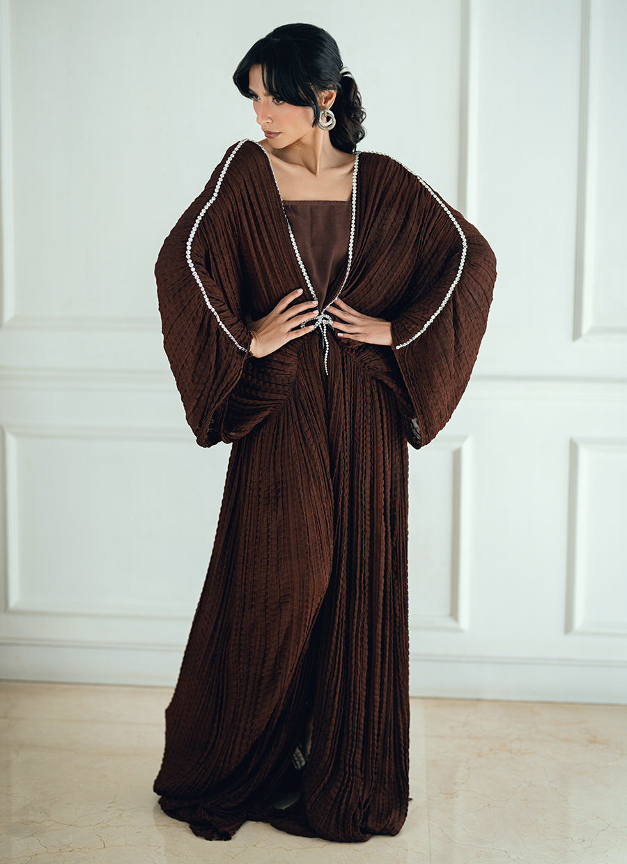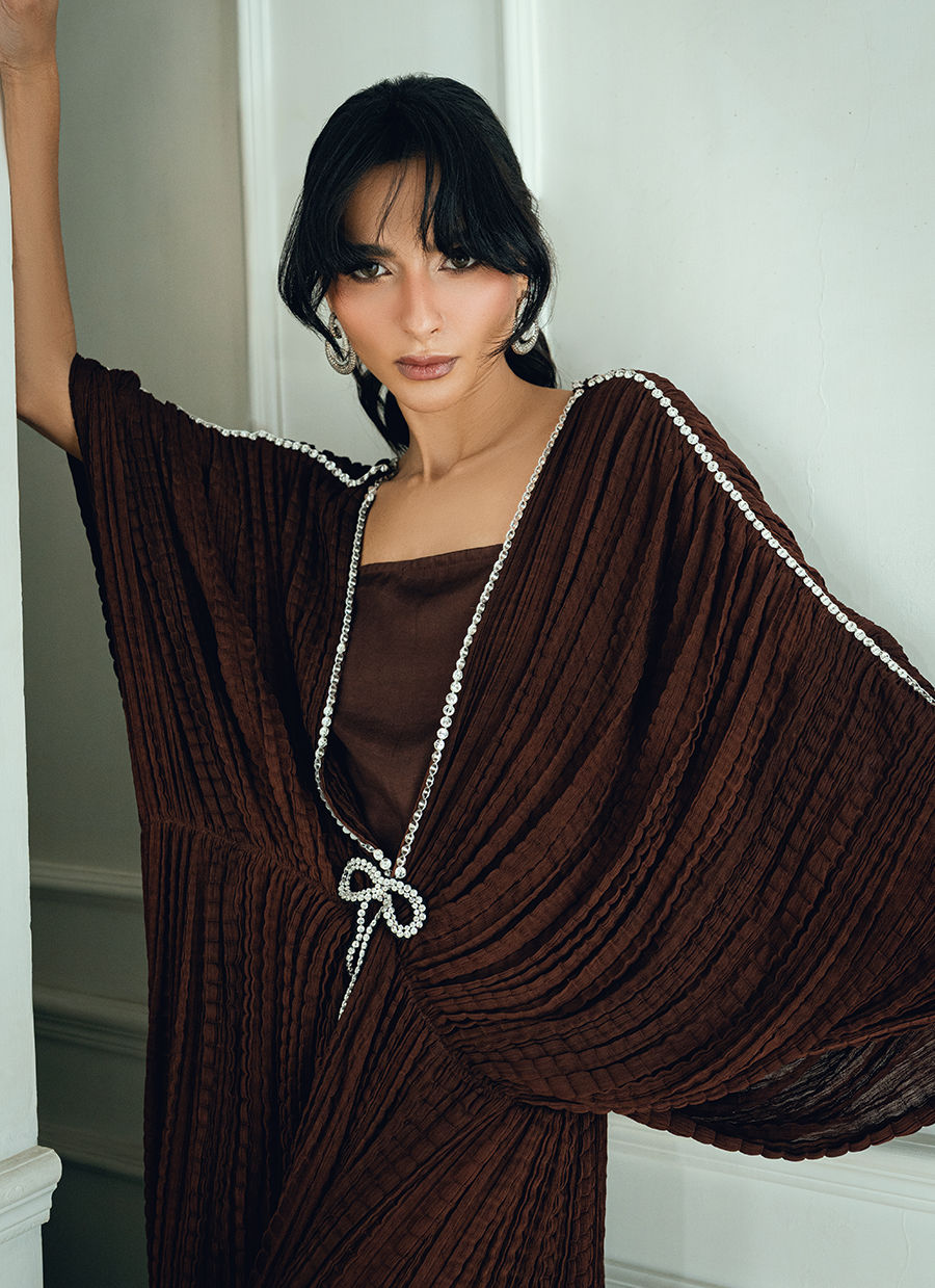 Minzy georgette chiffon kaftan is designed with diamond-worked necklines on the front, back, and sleeves, finished with 3D bow brooch accents on both sides.