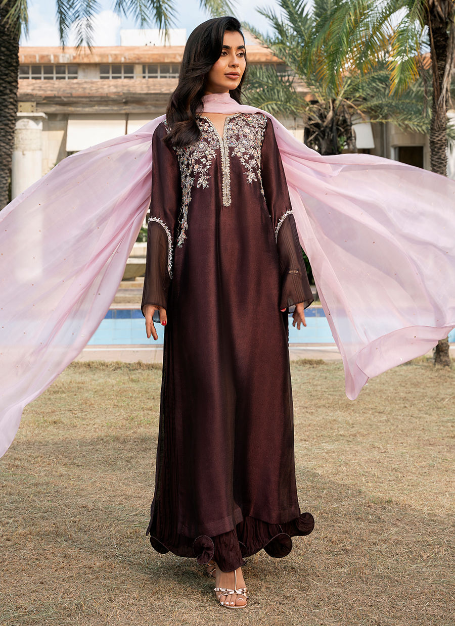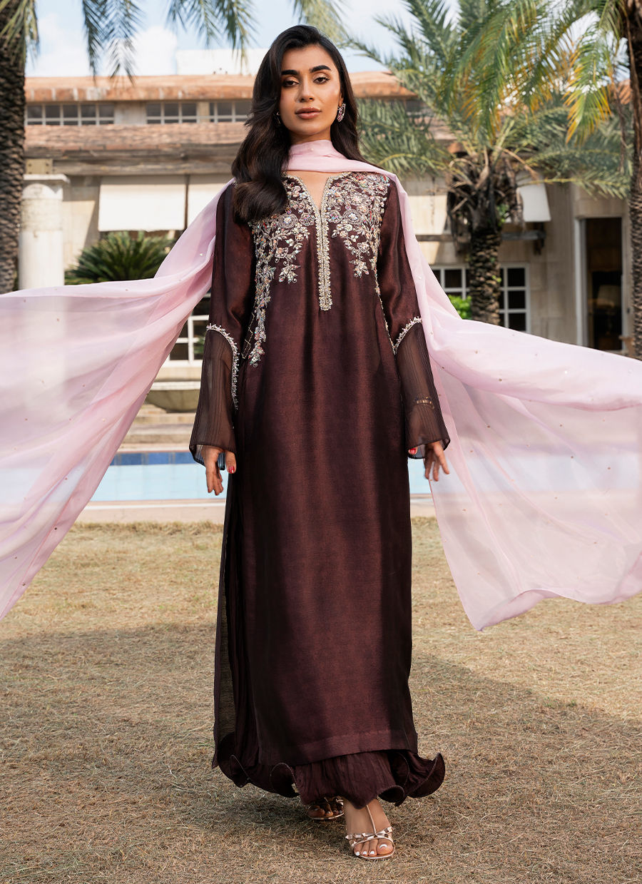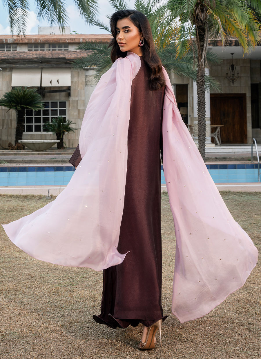 Mocha Muse is a timeless long shirt crafted from luxurious self-textured tissue silk. It features intricate embroidery and hand-embellished sequins along the neckline, adding a subtle touch of sparkle. The sleeves are elevated with delicate organza stitching details, enhancing the overall elegance of the look. The outfit is paired with crushed, flared pants for a modern twist and finished with a soft powder pink silk dupatta—bringing the entire ensemble together with effortless grace. *Fabric is on self print hence silt may differ from the actual design. Shirt Type: Loose Fit Wrap Length: 30.5 Sleeve Length: 25 Pants Length: 30 Model Height: 5'3