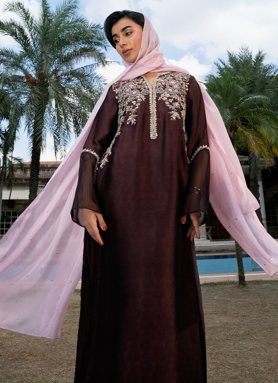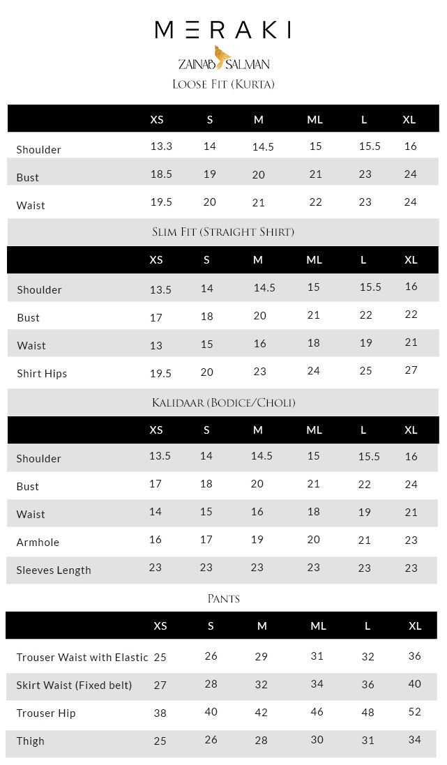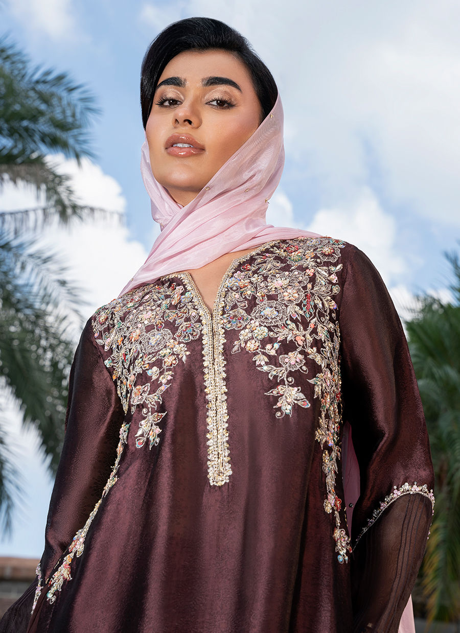 Mocha Muse is a timeless long shirt crafted from luxurious self-textured tissue silk. It features intricate embroidery and hand-embellished sequins along the neckline, adding a subtle touch of sparkle. The sleeves are elevated with delicate organza stitching details, enhancing the overall elegance of the look. The outfit is paired with crushed, flared pants for a modern twist and finished with a soft powder pink silk dupatta—bringing the entire ensemble together with effortless grace. *Fabric is on self print hence silt may differ from the actual design. Shirt Type: Loose Fit Wrap Length: 30.5 Sleeve Length: 25 Pants Length: 30 Model Height: 5'3