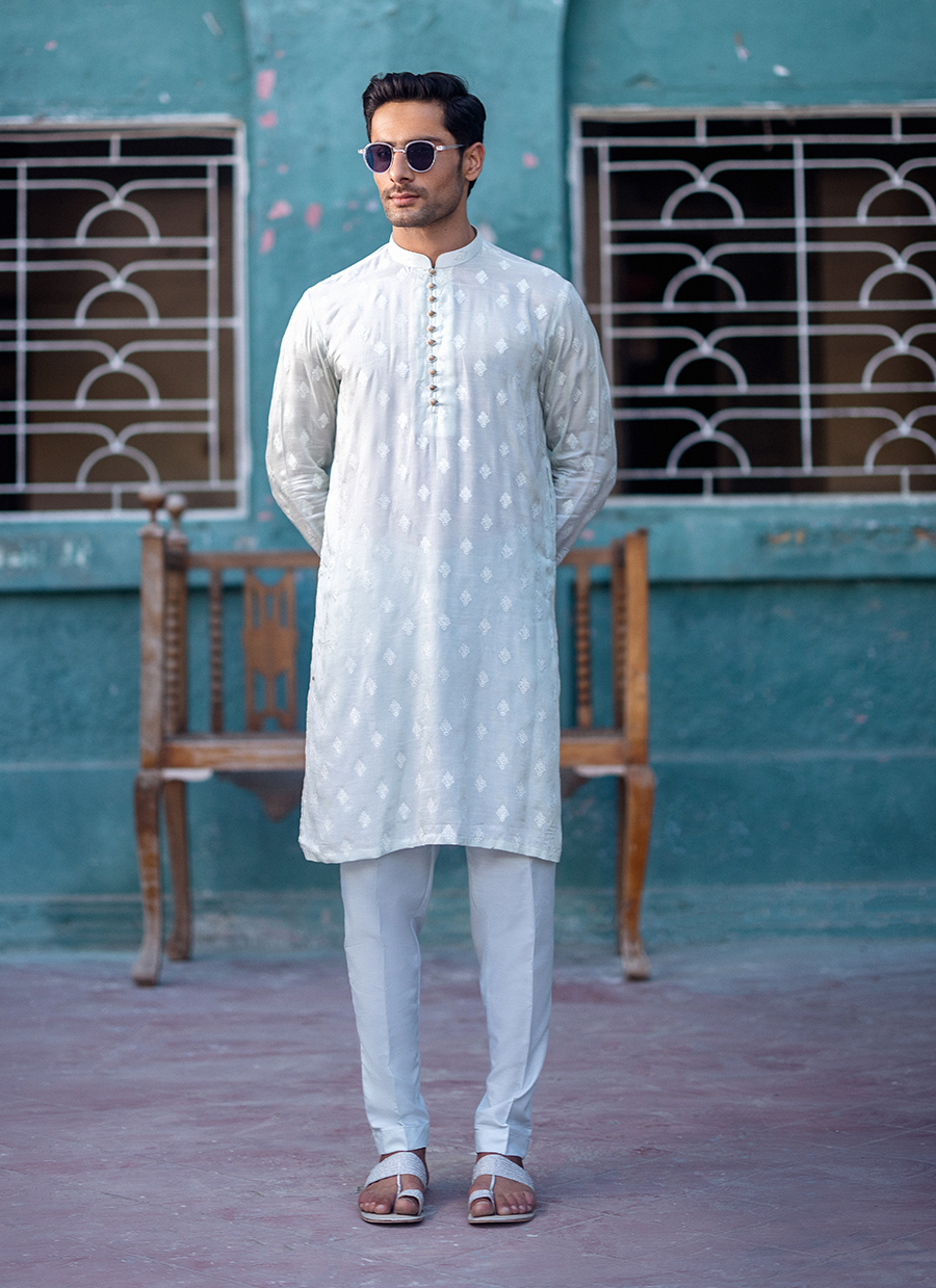 Mint blue raw silk kurta with embroidered motifs and loop button paired with a cotton silk pajama.