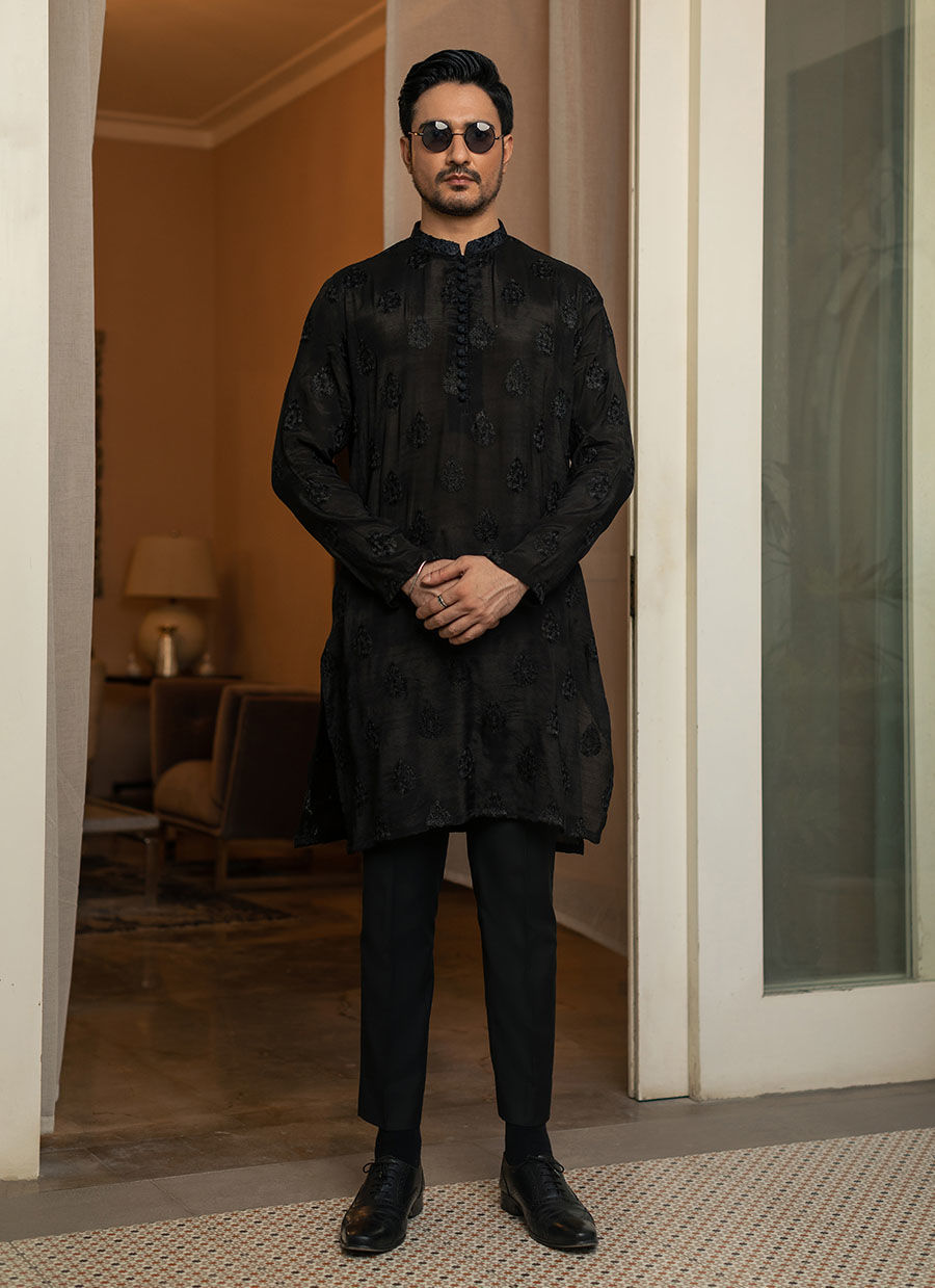 Classic black men's cotton raw silk kurta with Hand embroidery on neck and boti all over.