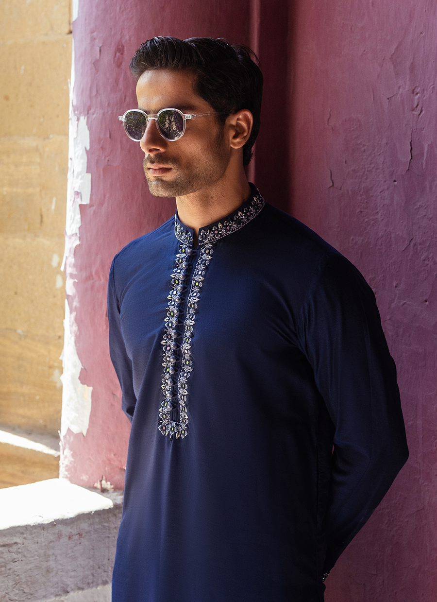 Elevate your ethnic ensemble with our exquisite blue cotton silk kurta pajama, adorned with intricate embroidery on the collar, placket, and sleeves. This ensemble seamlessly blends traditional craftsmanship with contemporary style, making it a perfect choice for festive celebrations, formal gatherings, or any special occasion where sophistication is key. Impeccably tailored and stylishly designed, this kurta pajama set is sure to make a lasting impression.
