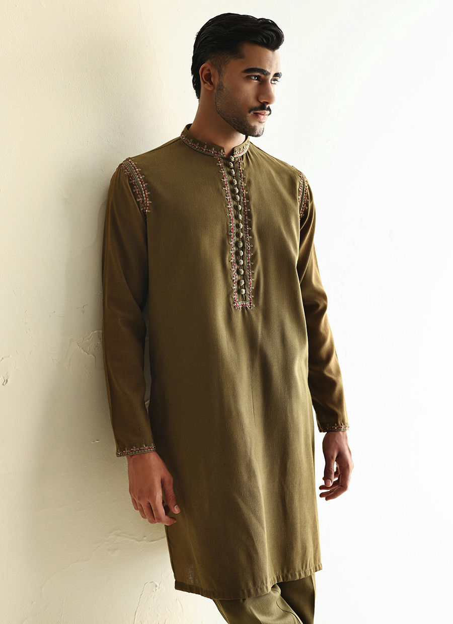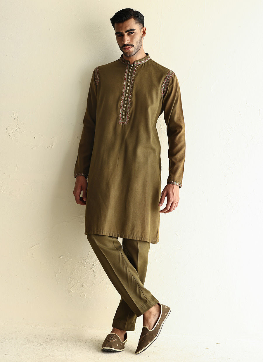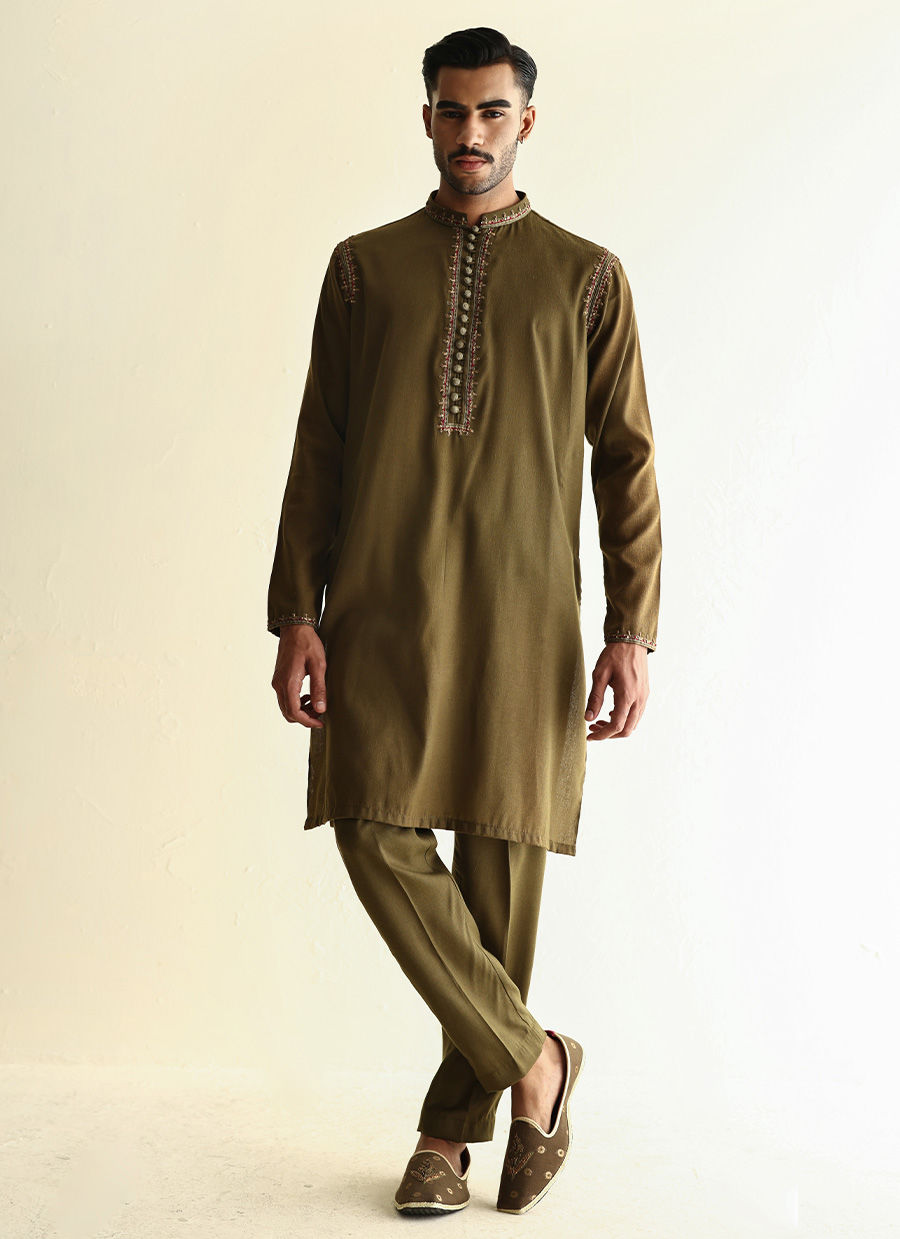 Linen kurta with hand-embroidered collar, sleeves, and shoulders, paired with a heavily embroidered linen waistcoat for a refined yet contemporary look