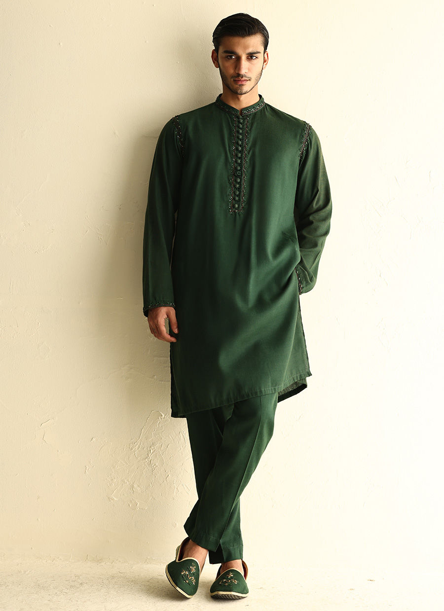 Linen kurta with hand-embroidered collar, sleeves, and shoulders, paired with a heavily embroidered linen waistcoat for a refined yet contemporary look