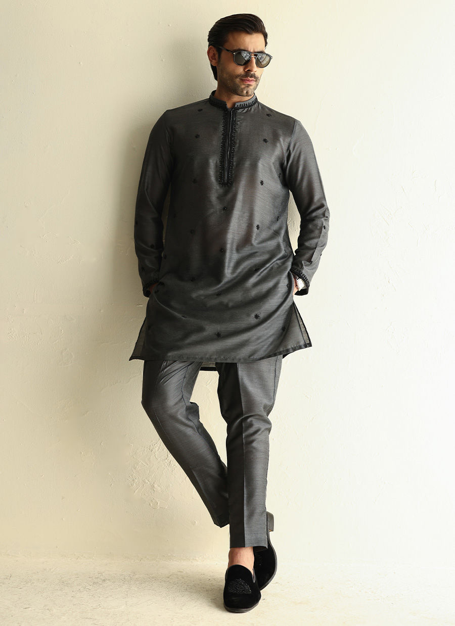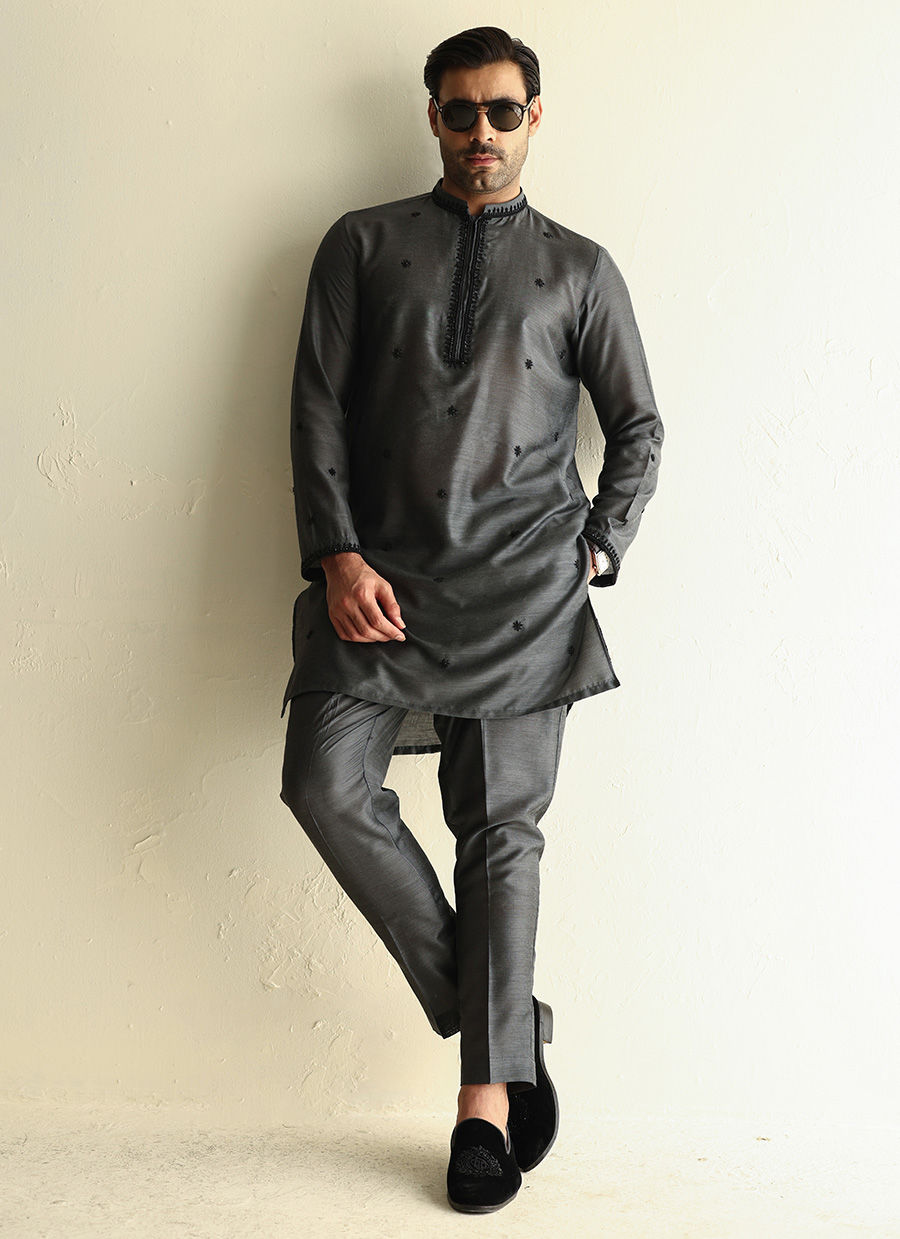 Khaddi silk kurta featuring hand-embroidered collar, placket, and all-over motifs