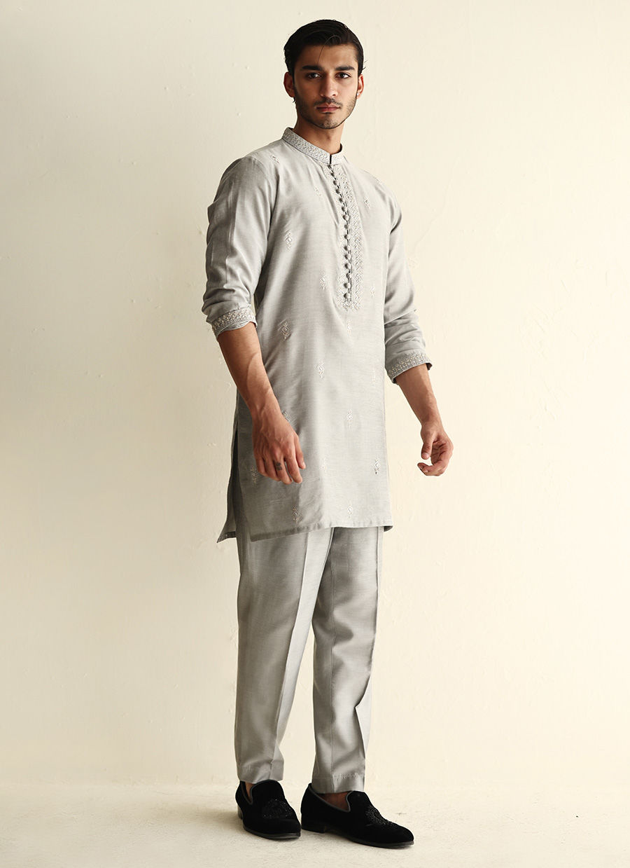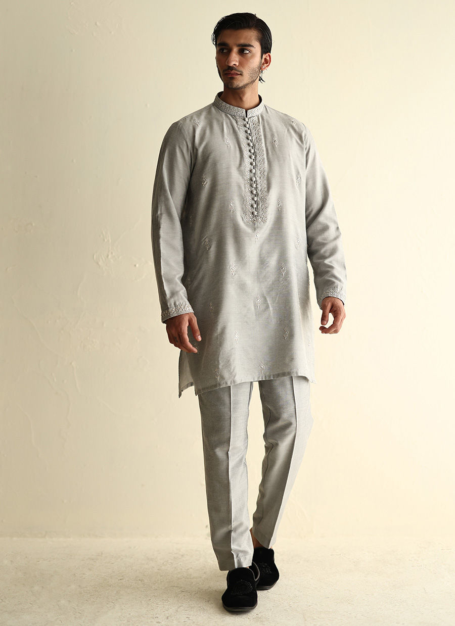 Khaddi silk kurta pajama embellished with all-over motifs and delicate handwork on the collar and placket, refined fusion of heritage and craftsmanship.