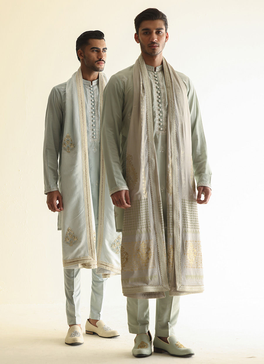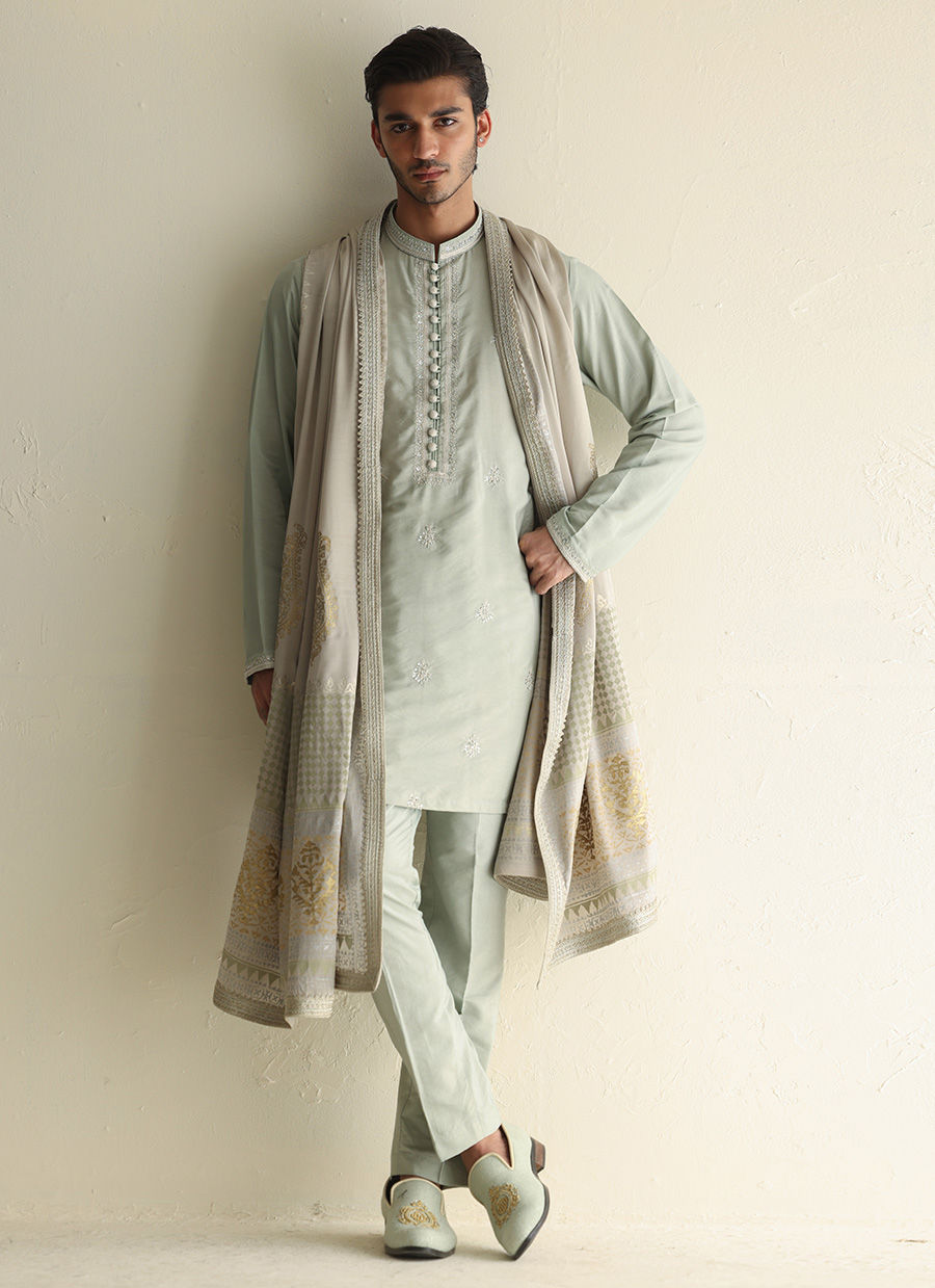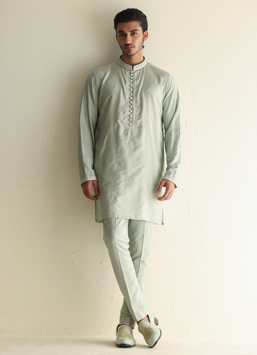 Khaddi silk kurta pajama embellished with all-over motifs and delicate handwork on the collar and placket, refined fusion of heritage and craftsmanship.