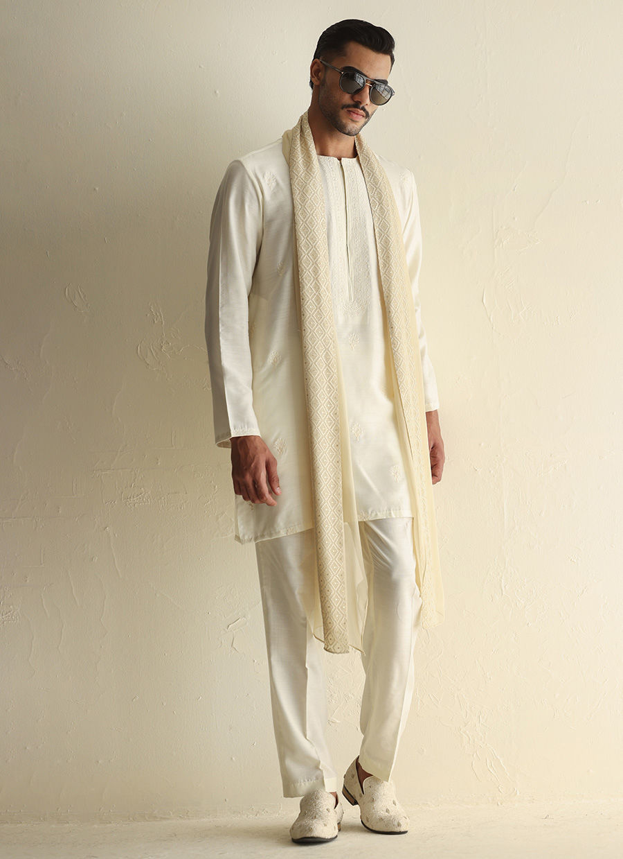 Khaddi silk kurta adorned with delicate embroidered motifs