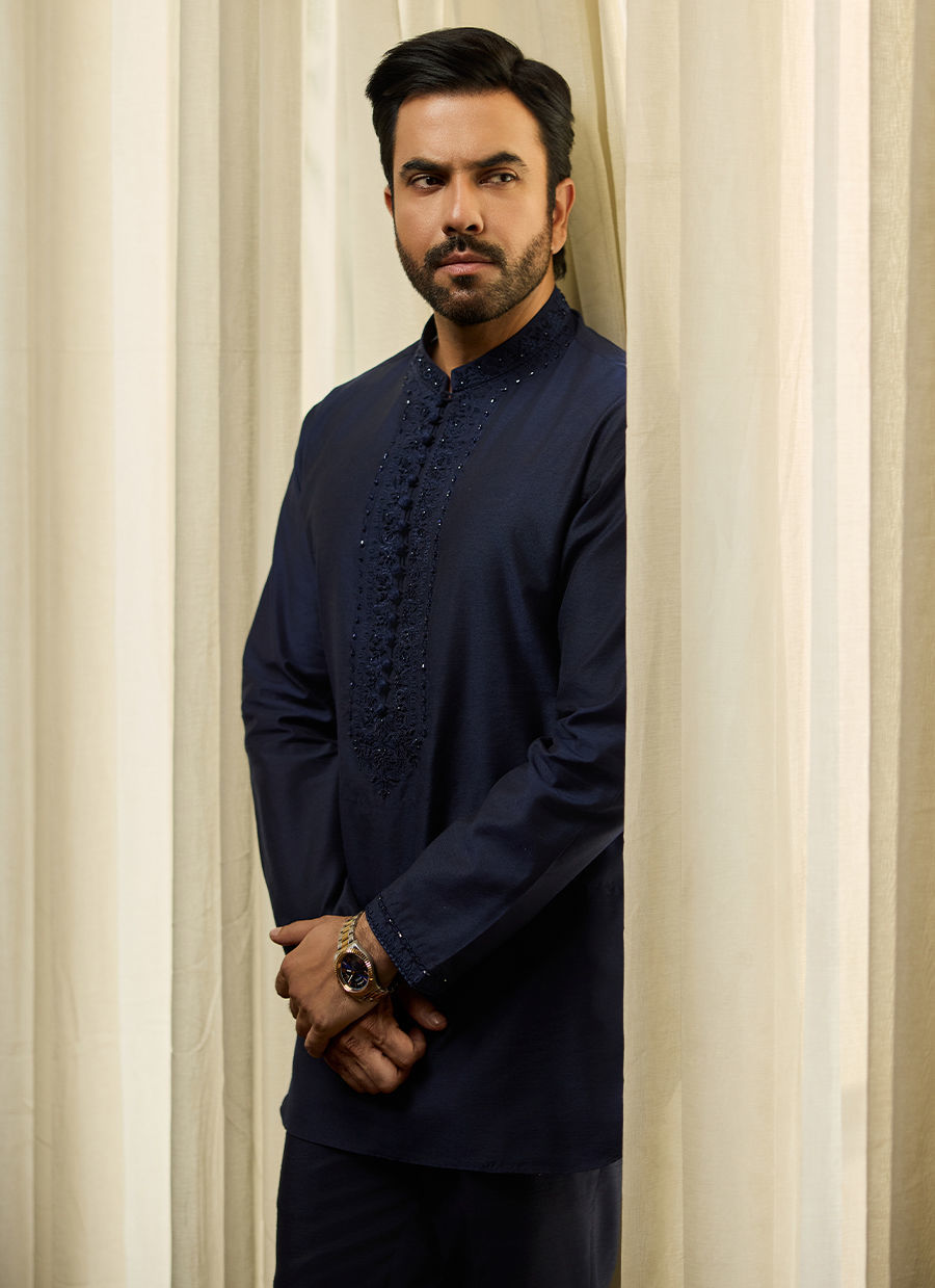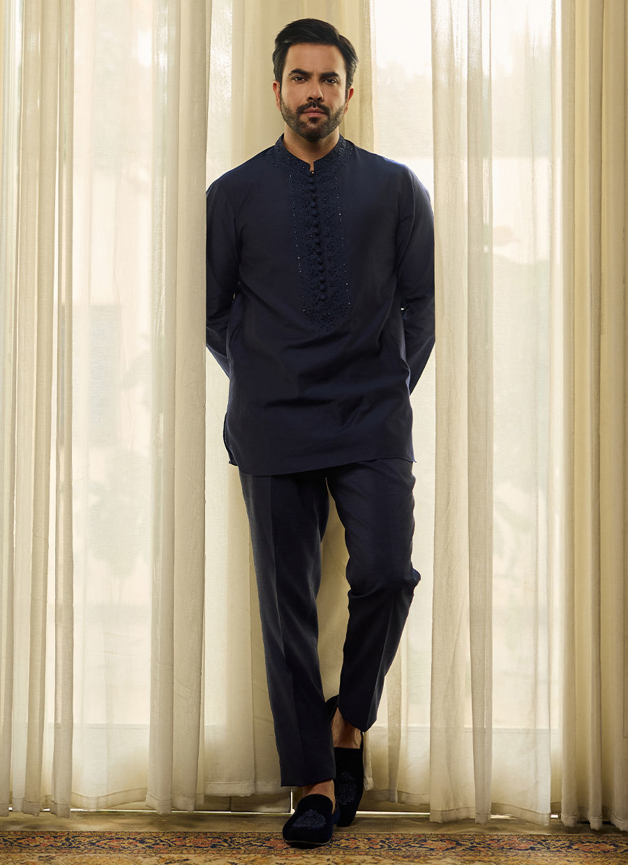 Embrace refined, monochromatic luxury with this exquisitely tailored Kurta. Crafted in a rich, deep Midnight Blue (or Navy) fabric, the piece is defined by its masterful tone-on-tone detailing. The entire placket and Band collar are intricately embellished with dense, self-colored threadwork, creating a textured pattern that is both subtle and luxurious.