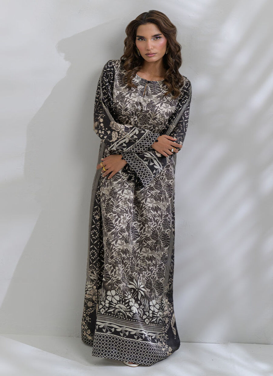 Elevate your everyday style with this elegant breathable shamooz silk kaftan, featuring a beige and black color palette. This is a long ankle length kaftan with flowy bell sleeves which is perfect for casual outings, summer-time movie nights or even breezy dinner dates.