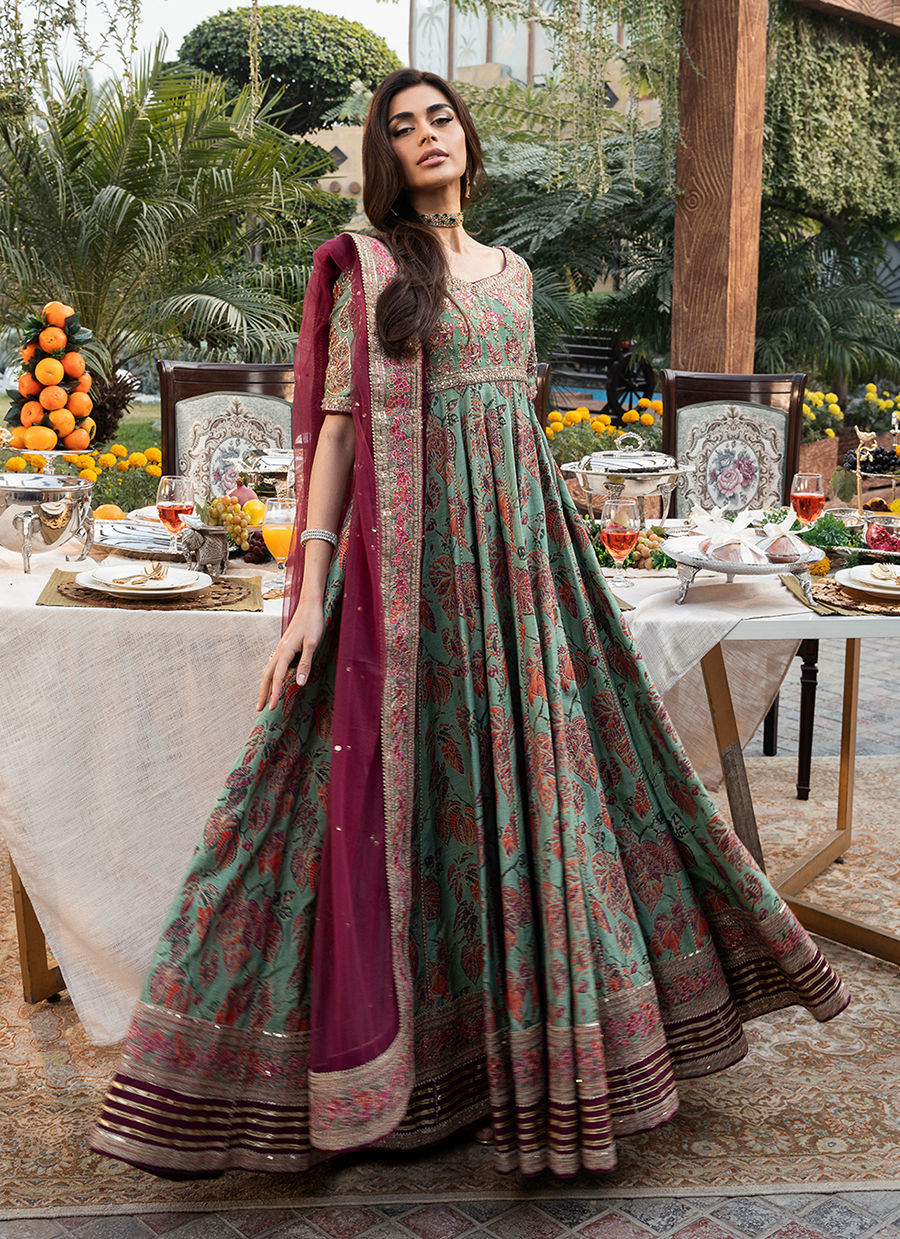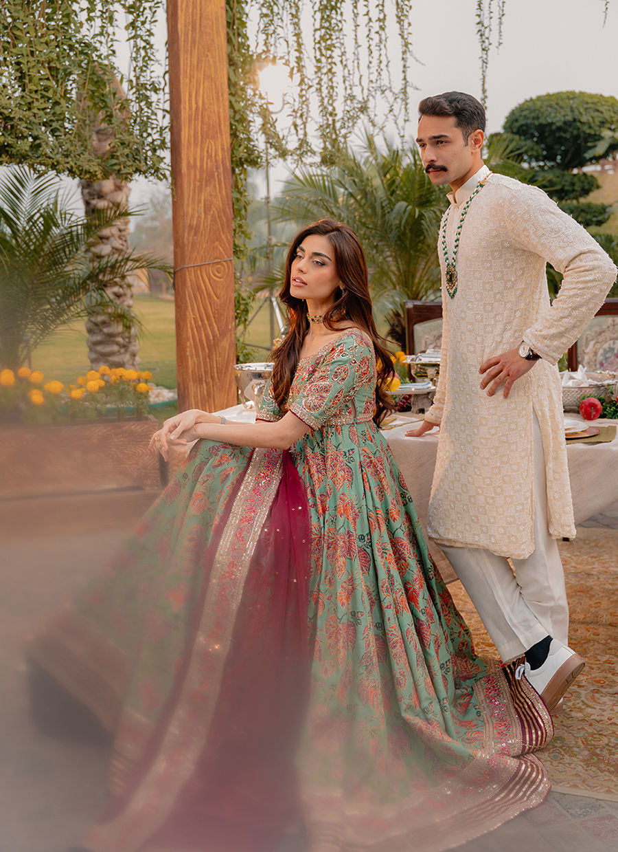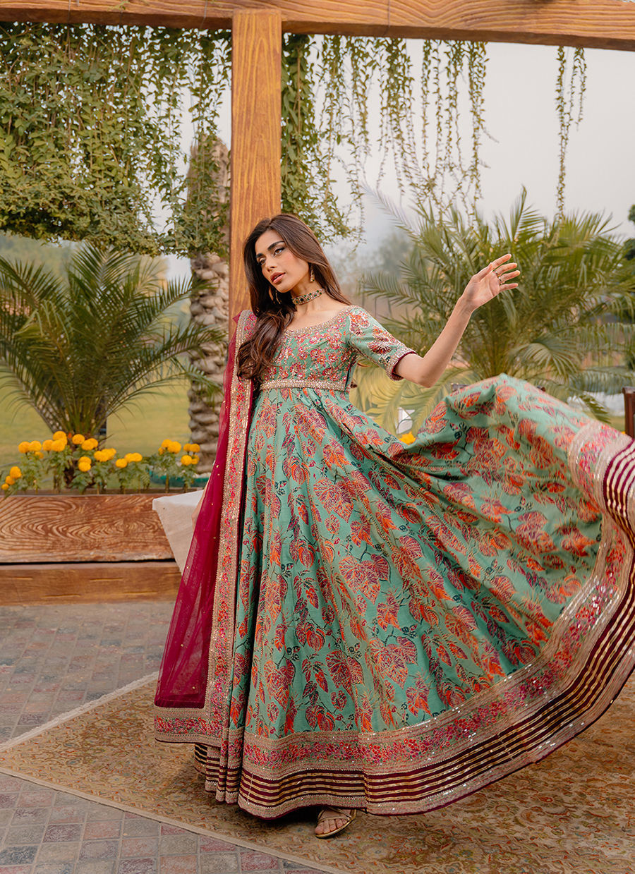 The Kalidar is crafted from premium screen printed Korean raw silk, giving the outfit a graceful flow and a rich, refined texture.The bodice is beautifully highlighted with hand embellishment.The outfit is paired with Korean raw silk churidar pants.Completing the look is a net dupatta, adorned with embroidered borders and sequin spray that add depth and elegance to the ensemble.