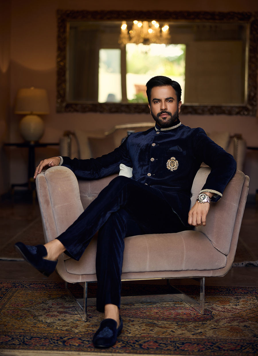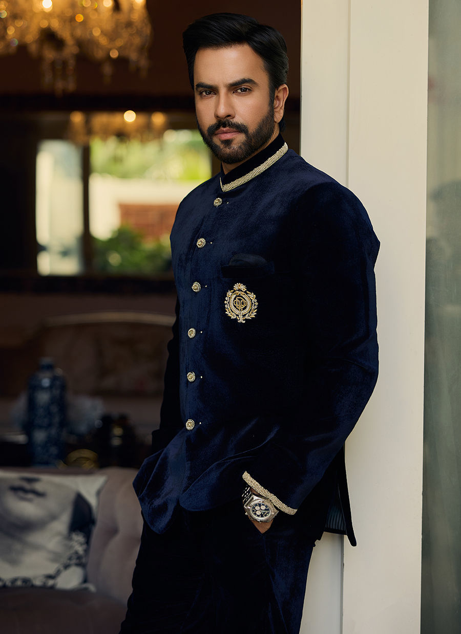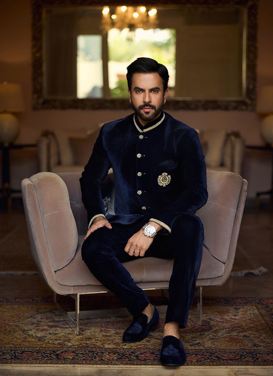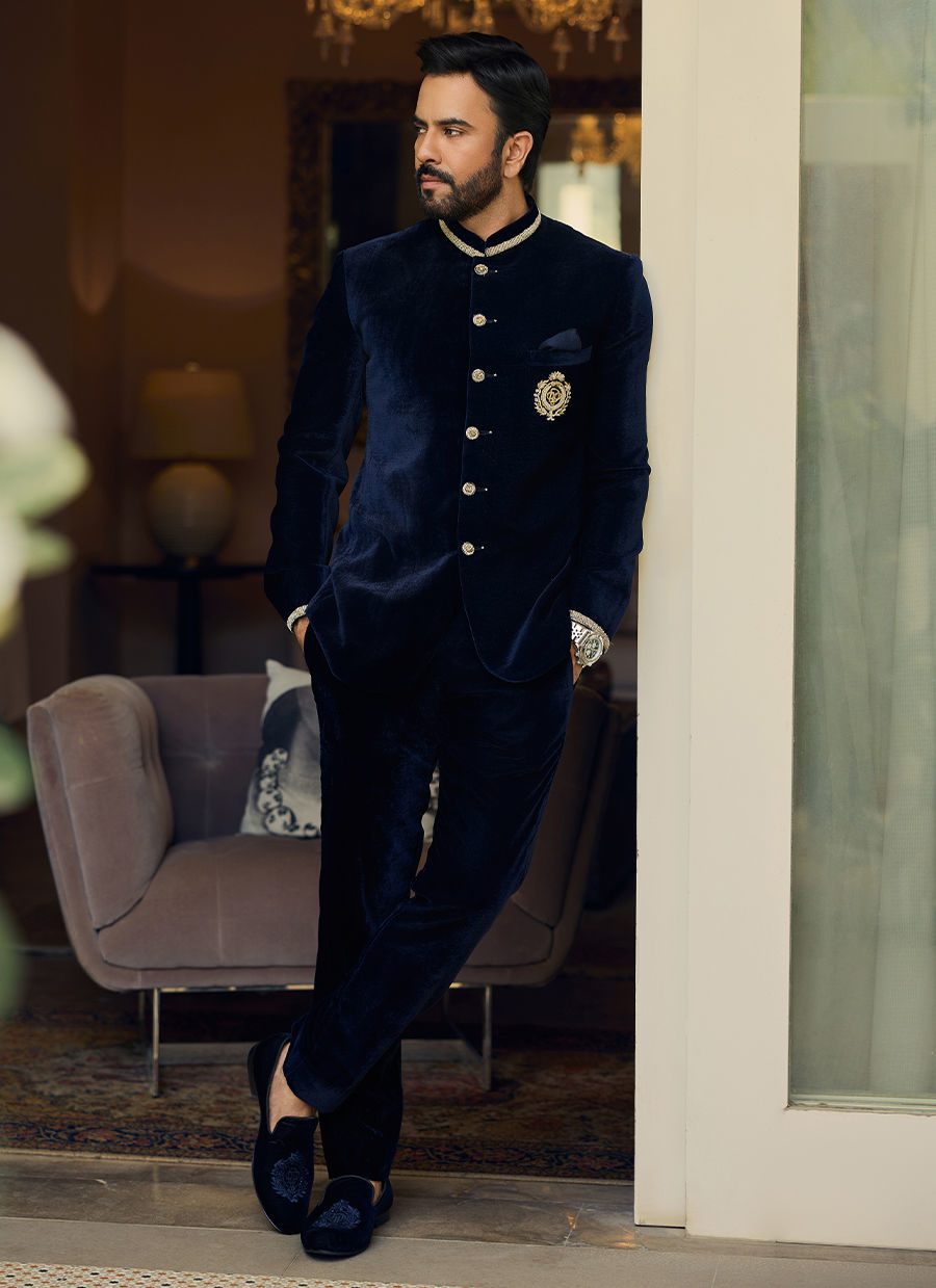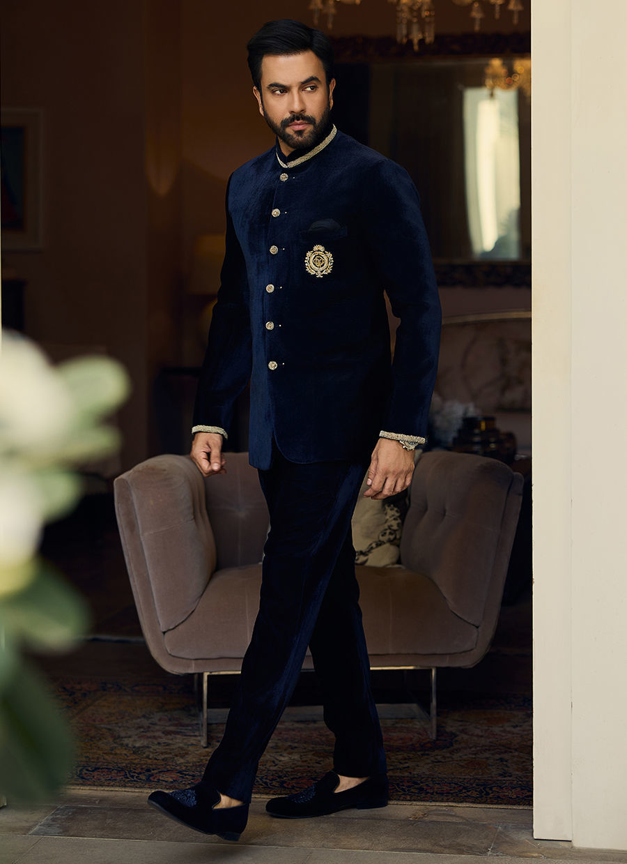 A breathtaking Midnight Navy Velvet Bandhgala Suit, a modern interpretation of traditional royalty. The jacket is impeccably tailored in plush velvet, featuring a standing Mandarin collar (Bandh) highlighted with delicate gold hand embroidery. The front is adorned with large, polished metallic buttons, leading down to a tailored fit. A striking embroidered DP crest on the chest pocket adds a touch of aristocratic heritage. Paired with matching slim-fit velvet trousers and embroidered velvet shoes, this ensemble is the quintessential choice for a groom, a close family member at a wedding, or an elite formal celebration.