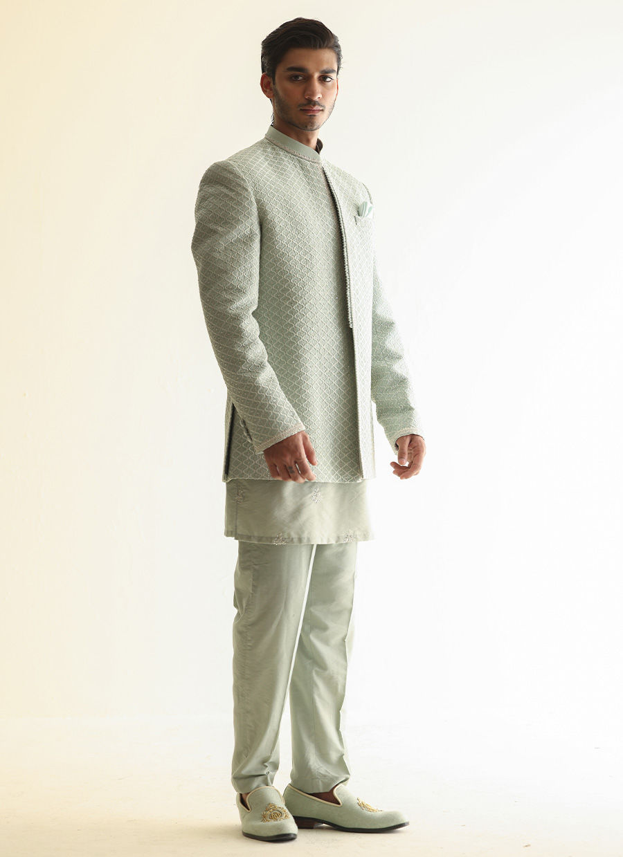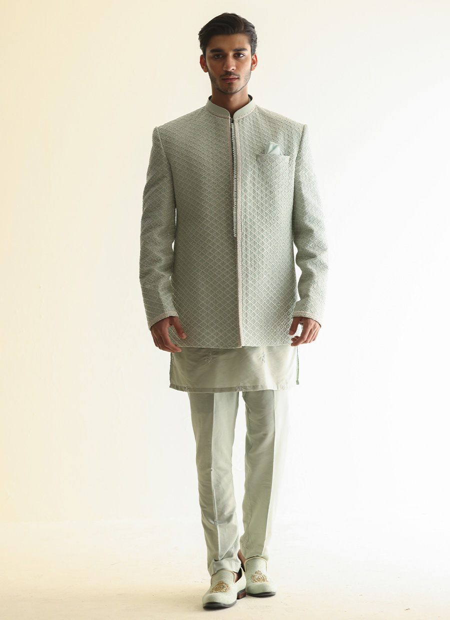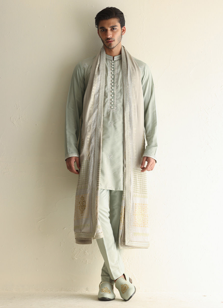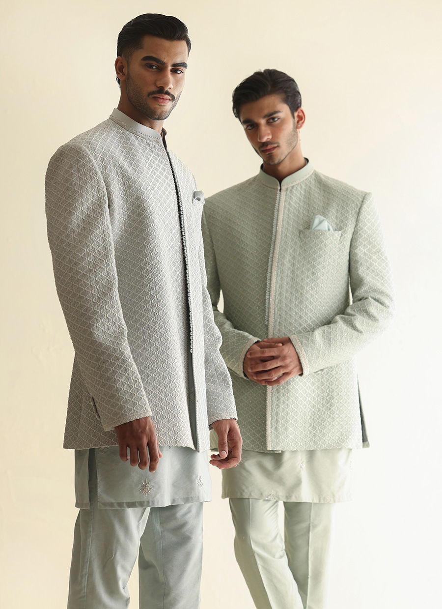 Fully embroidered raw silk front-open jacket paired with a khaddi silk kurta featuring hand-embroidered collar, placket, and all-over motifs for a rich, handcrafted look