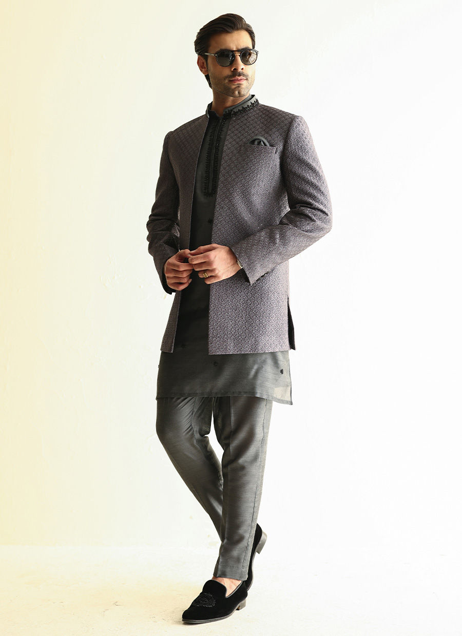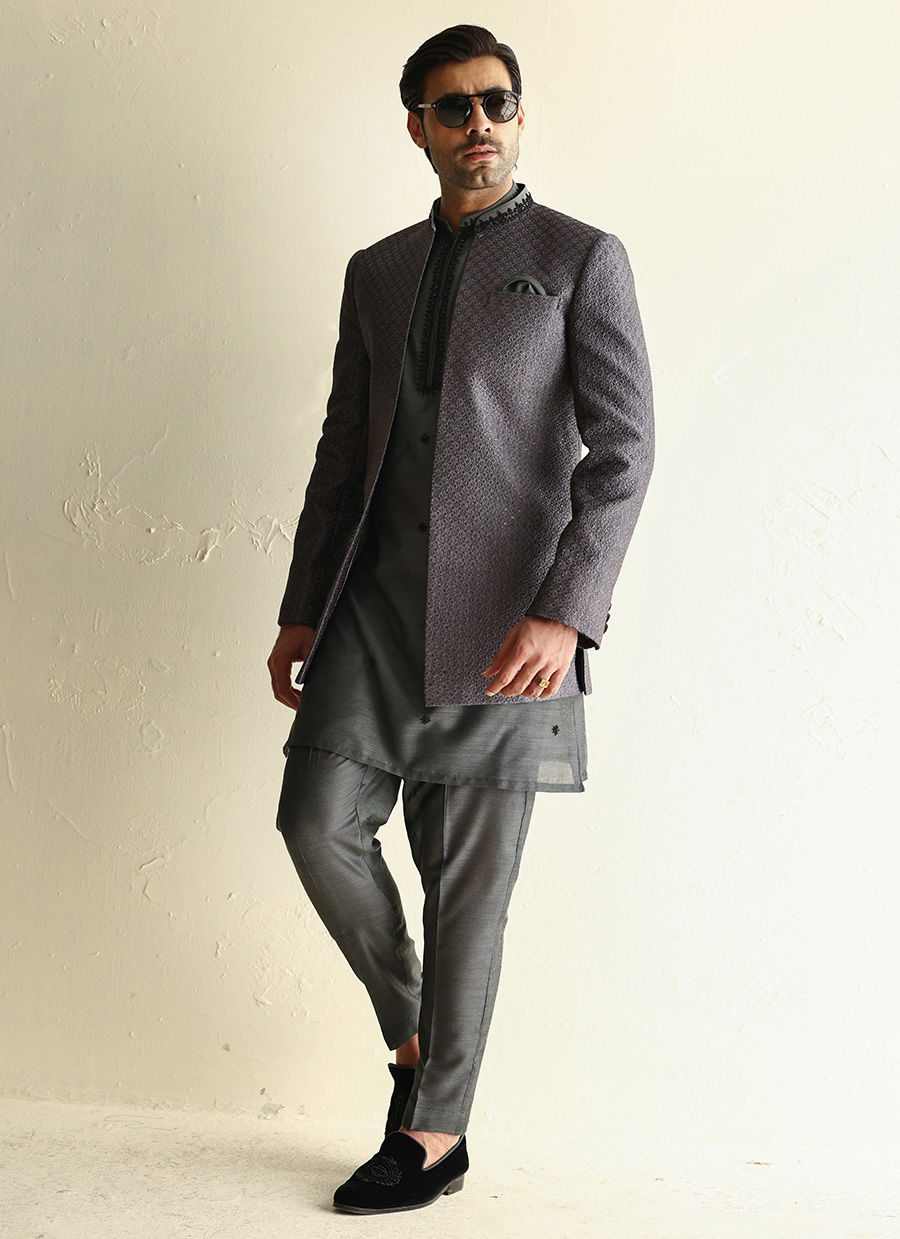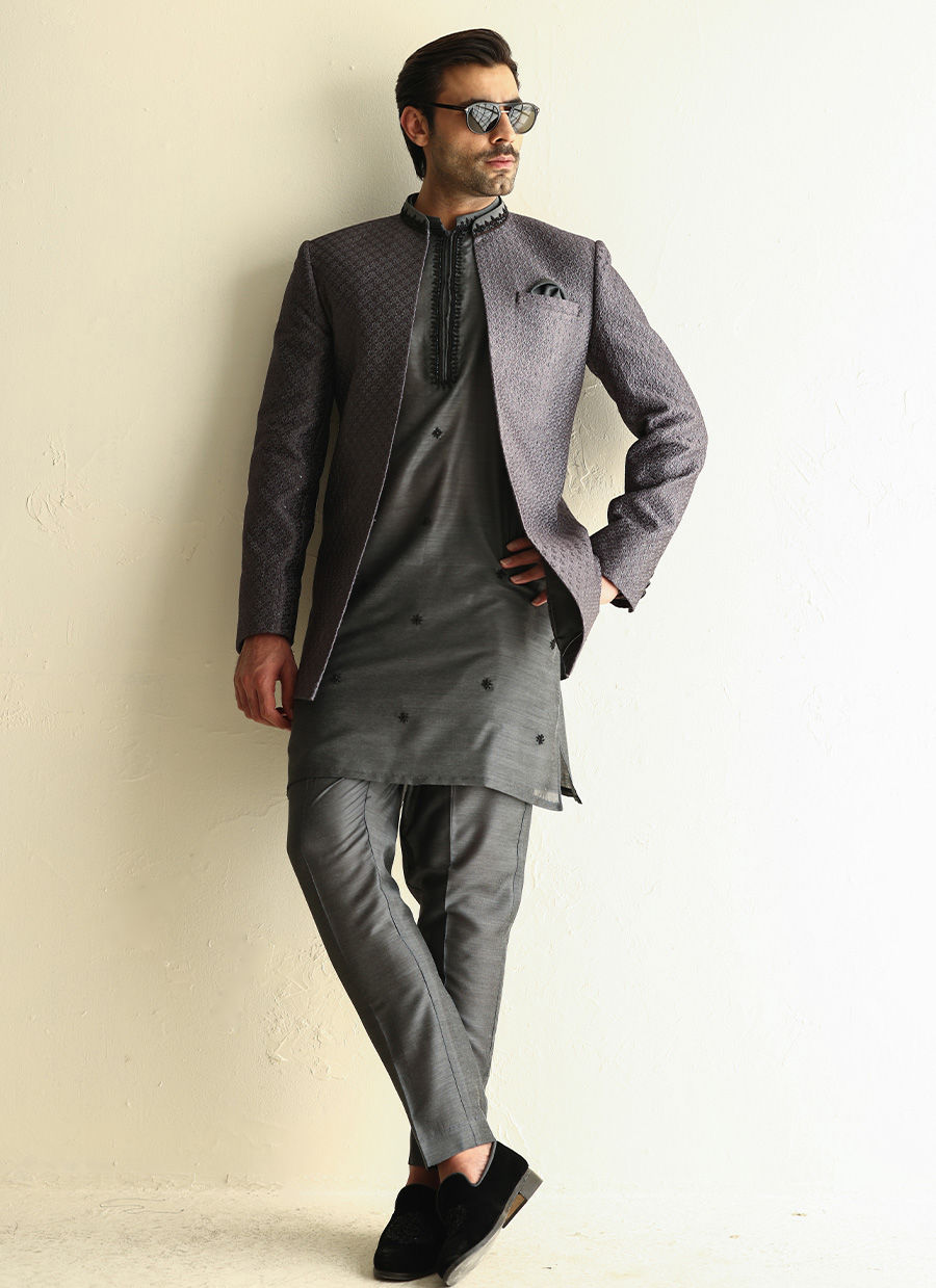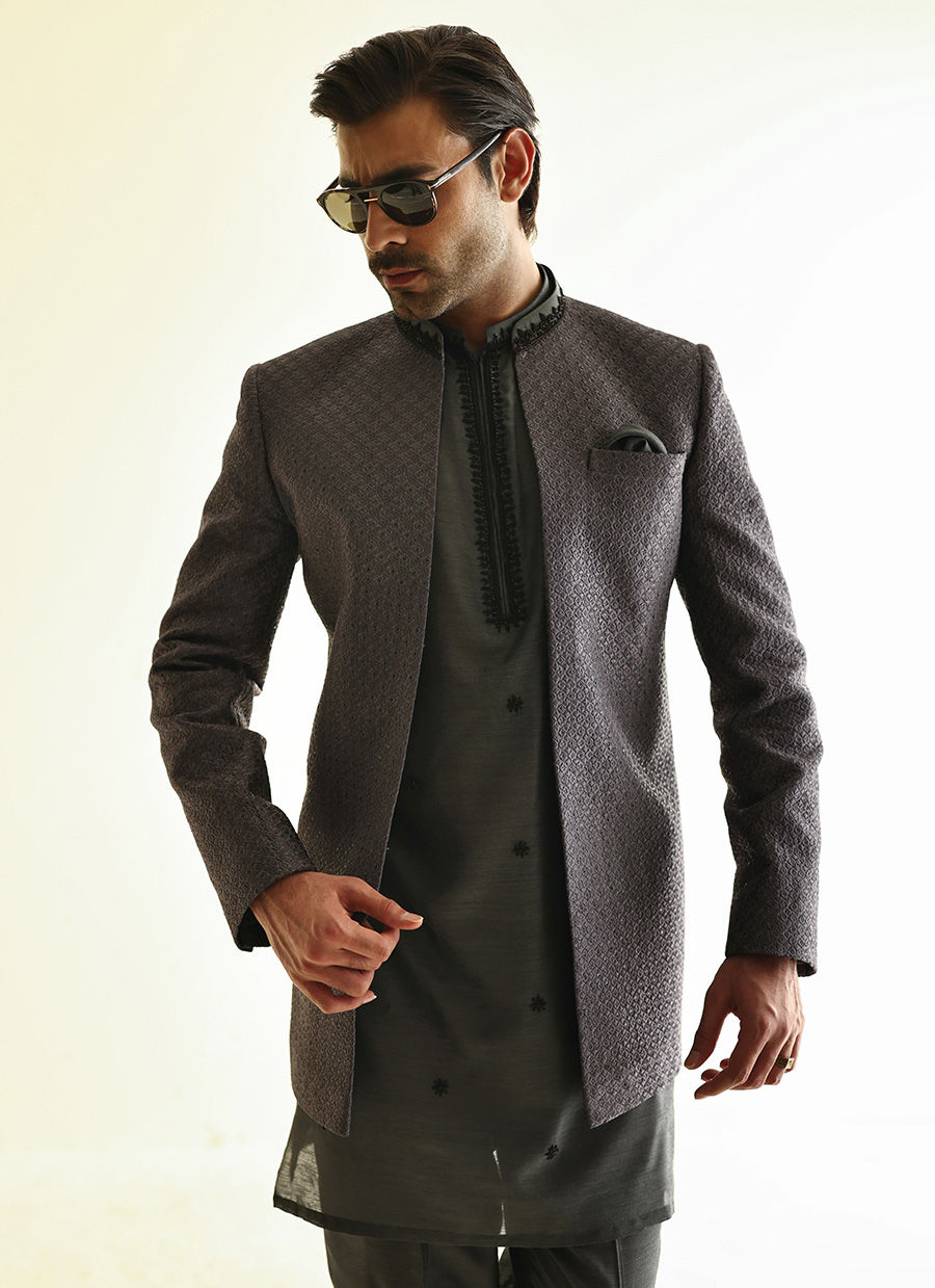 Fully embroidered raw silk front-open jacket paired with a khaddi silk kurta featuring hand-embroidered collar, placket, and all-over motifs for a rich, handcrafted look