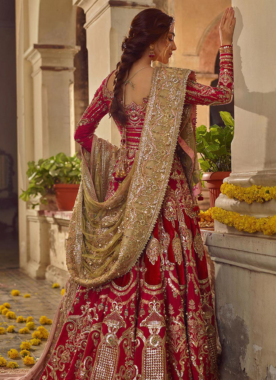 Mumtaz is a 4 piece bridal consisting of a silk pishwas with zarri tilla embroidery with a mix of delectable gold embellishments and deep fuchsia velvet appliqués matched with a stunning shocking pink brocade lehnga. It is paired with a lime green net dupatta with elaborate embroidered base with a stunning glimmer of embellished details and a powder pink cotton net chador with heavy borders of gota and marori .