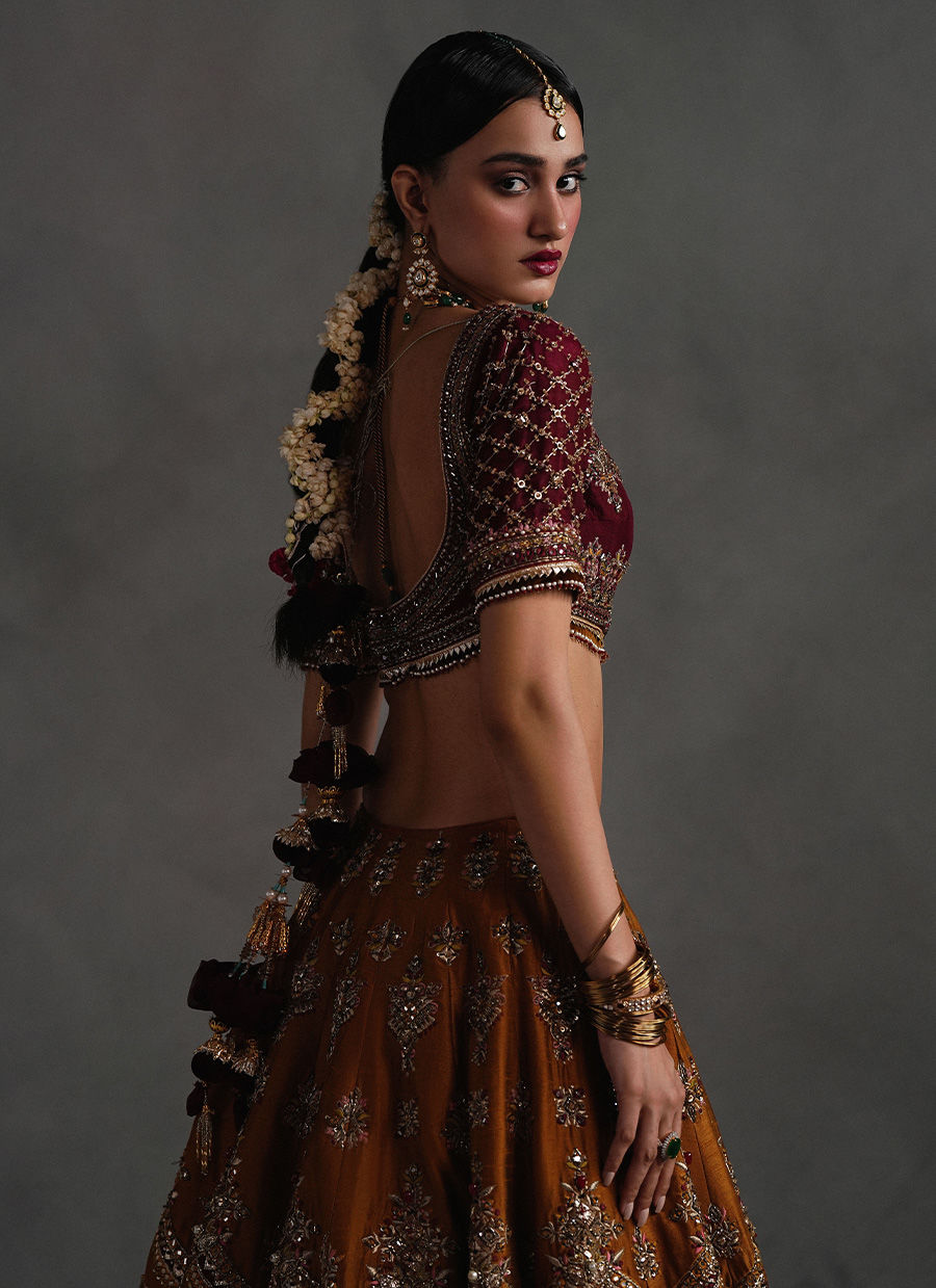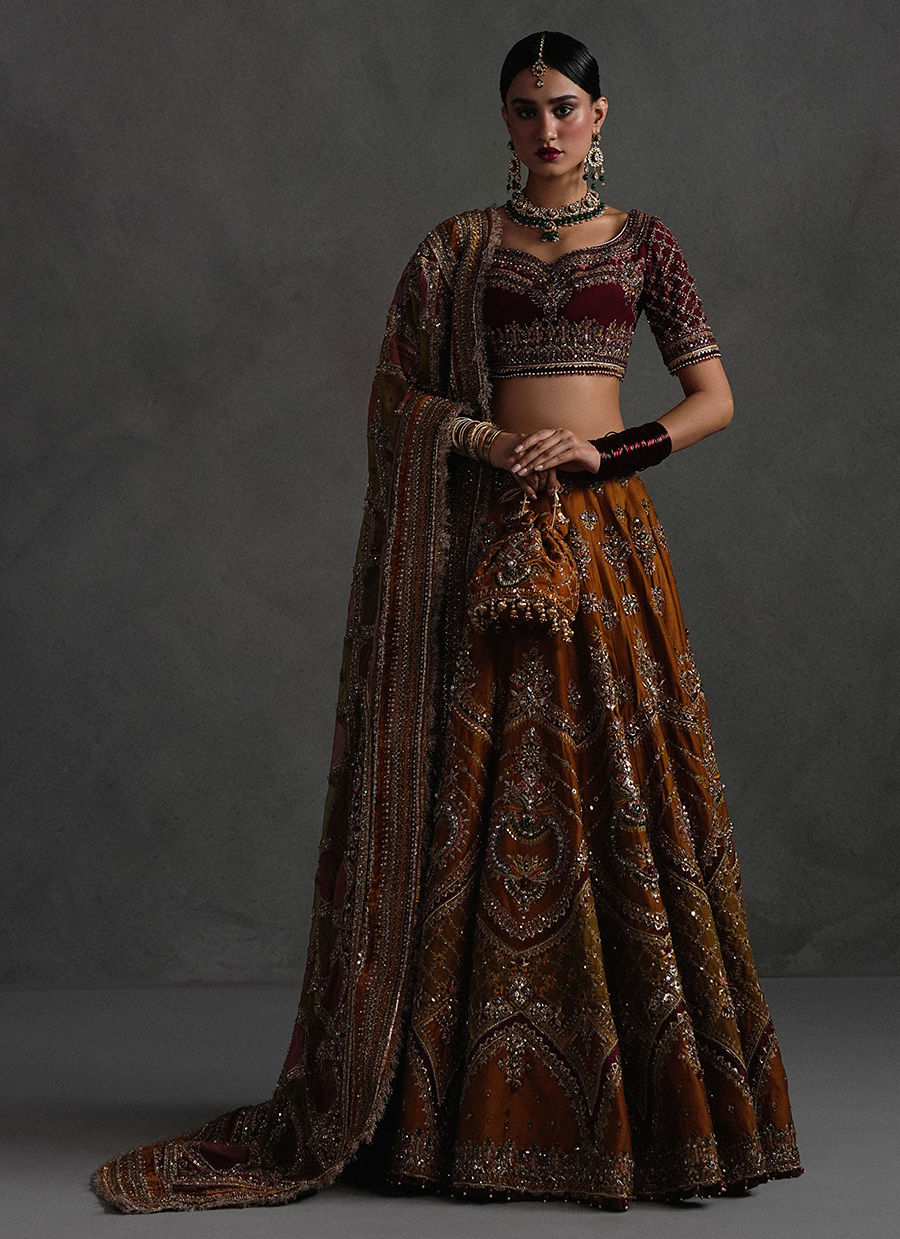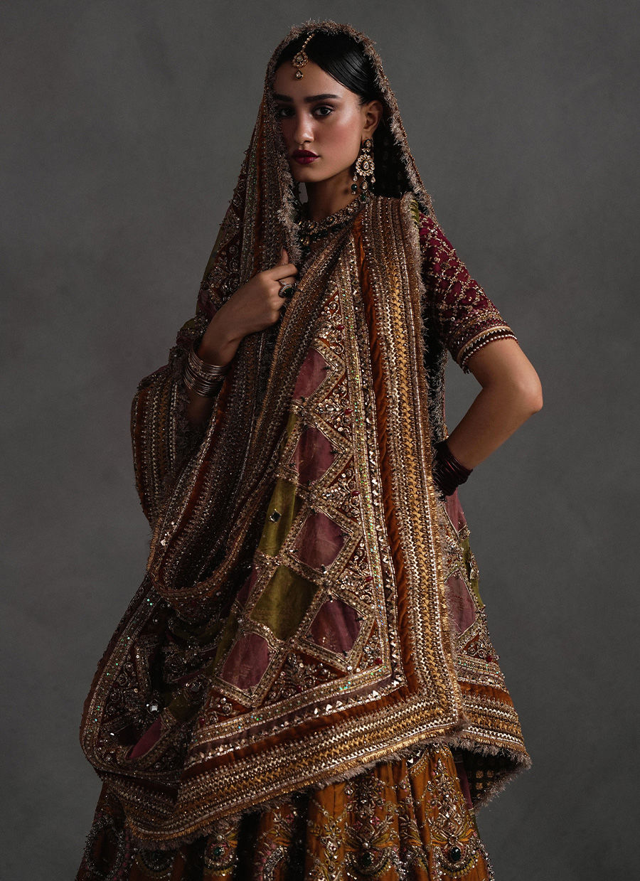 Mustard Heritage is our radiant mustard raw silk lehenga choli ensemble which draws inspiration from Mughal arches and architectural geometry. Each motif is painstakingly embroidered and heightened with decorative appliqués and glinting hand embellishments. The contrasting maroon blouse is rich with mirror work and metallic thread embroidery, while the pink-and-green dupatta brings unexpected drama with its laser-cut detailing, kiran trims, and dori work. A choice for the bold bride who wishes to turn tradition into theatre.
