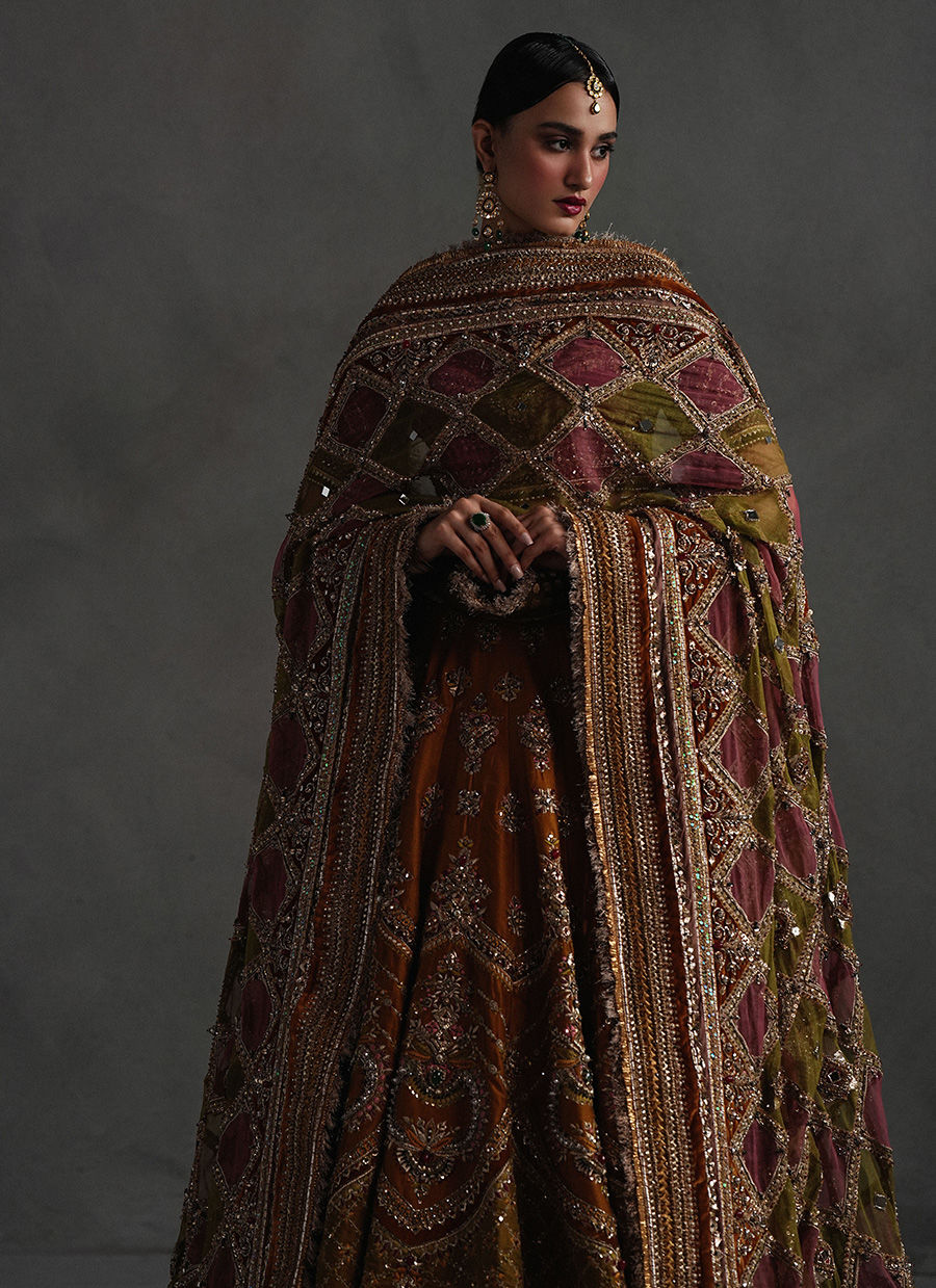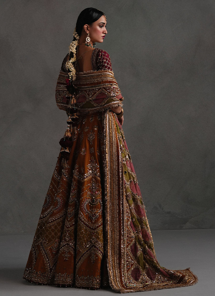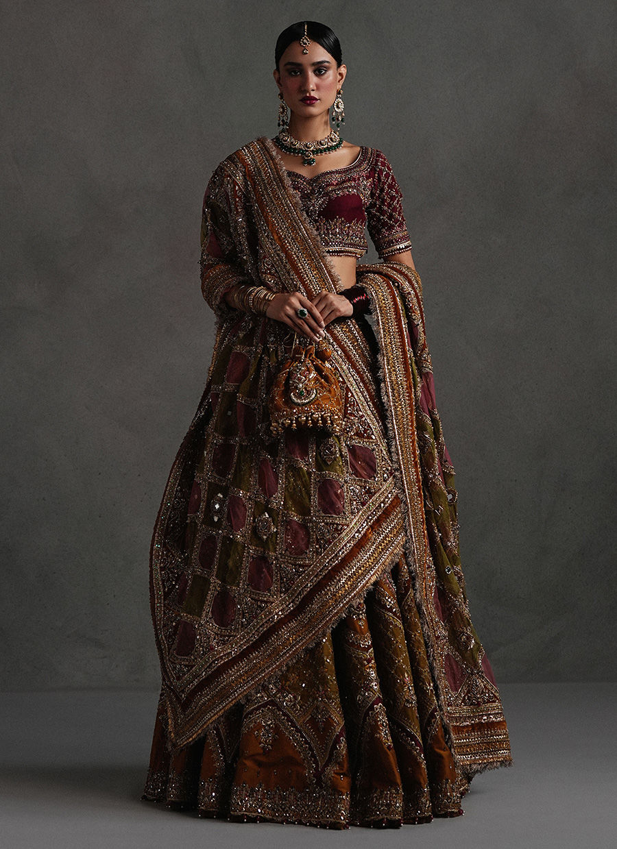 Mustard Heritage is our radiant mustard raw silk lehenga choli ensemble which draws inspiration from Mughal arches and architectural geometry. Each motif is painstakingly embroidered and heightened with decorative appliqués and glinting hand embellishments. The contrasting maroon blouse is rich with mirror work and metallic thread embroidery, while the pink-and-green dupatta brings unexpected drama with its laser-cut detailing, kiran trims, and dori work. A choice for the bold bride who wishes to turn tradition into theatre.
