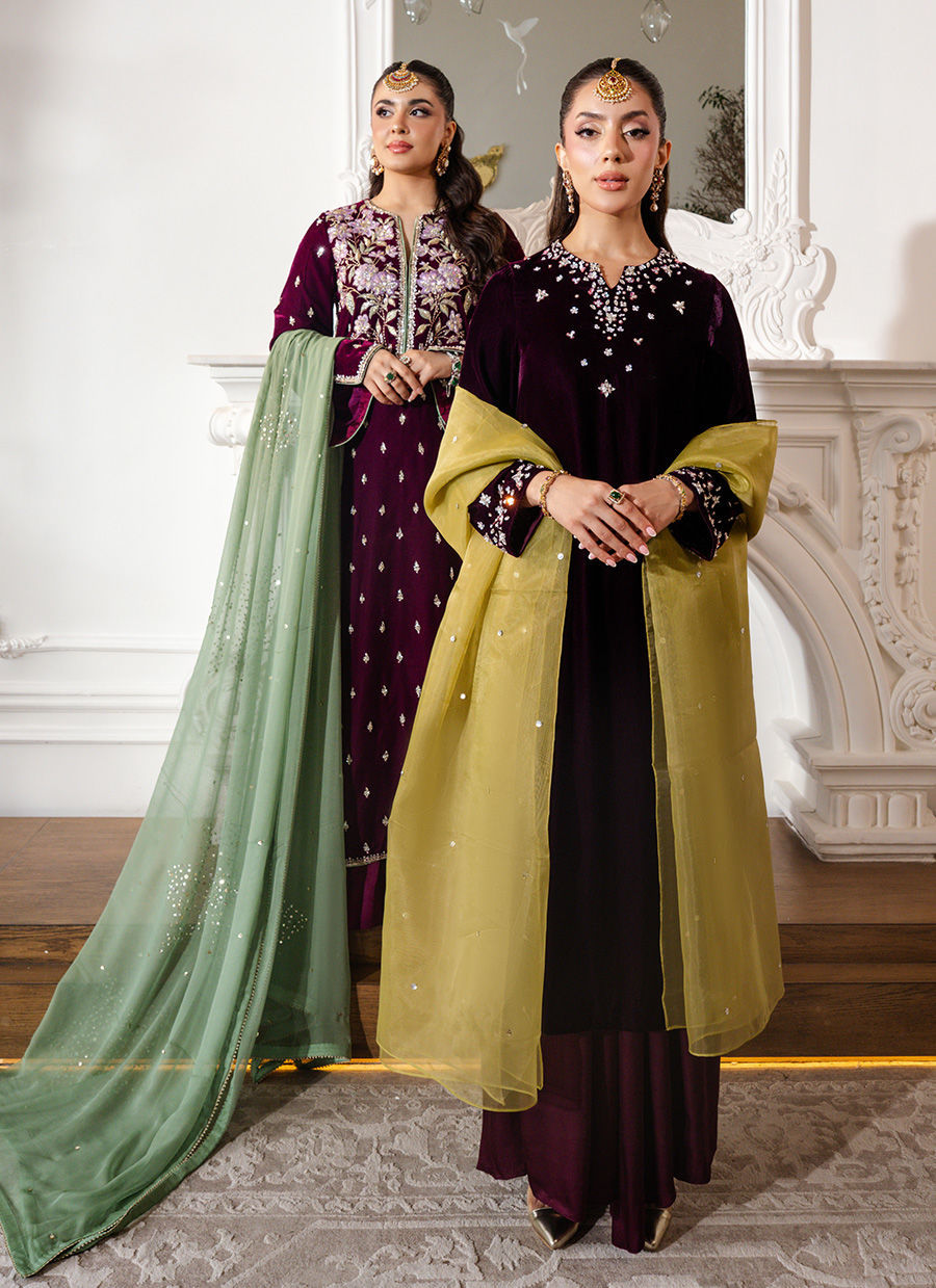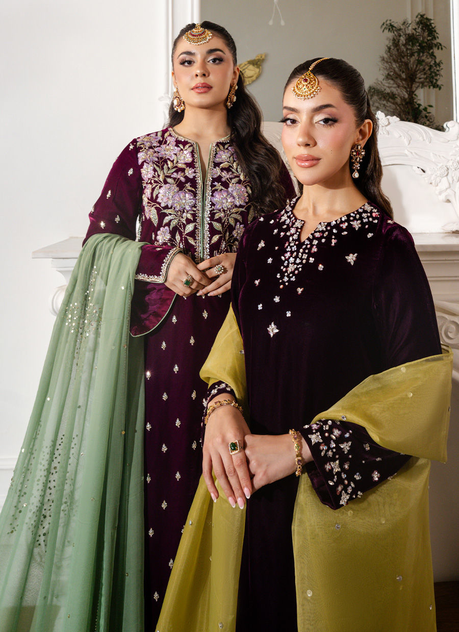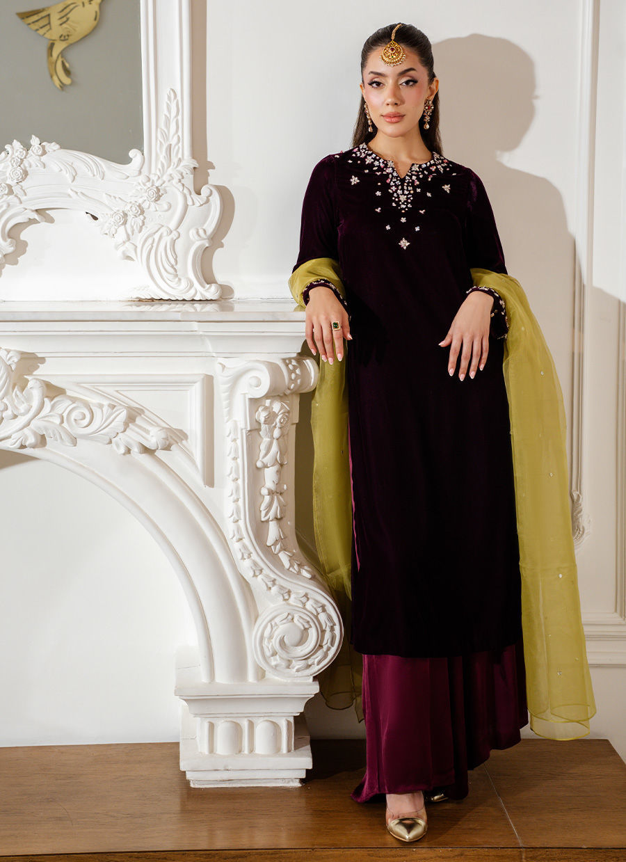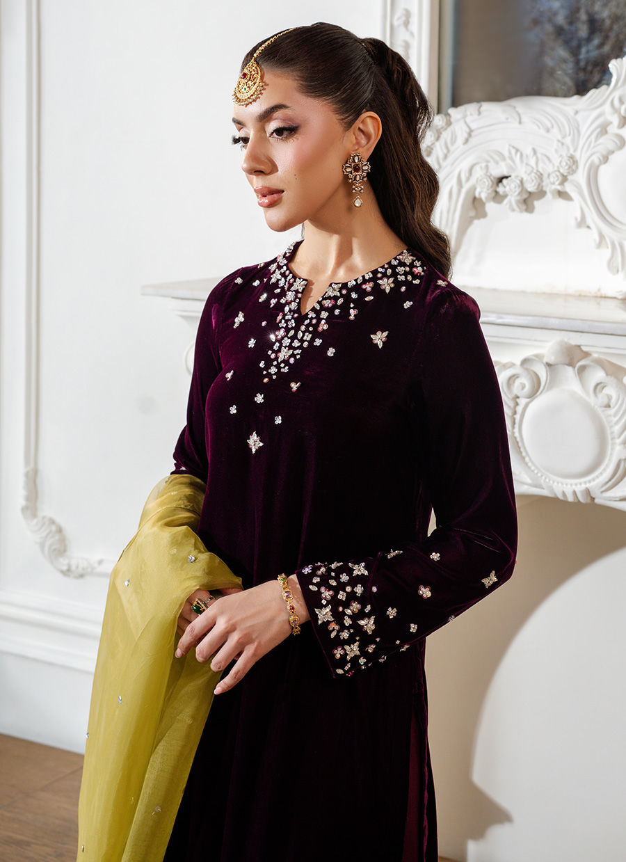 Muted Rose is an exquisitely crafted plum velvet shirt featuring a delicately hand-embellished neckline adorned with colored sequins. The refined craftsmanship extends to the sleeves, adding just the right touch of festive allure. Paired with matching satin pants and a contrasting olive green organza dupatta with a delicate sequin spray, this ensemble strikes the perfect balance between elegance and celebration, ideal for the upcoming festive season.