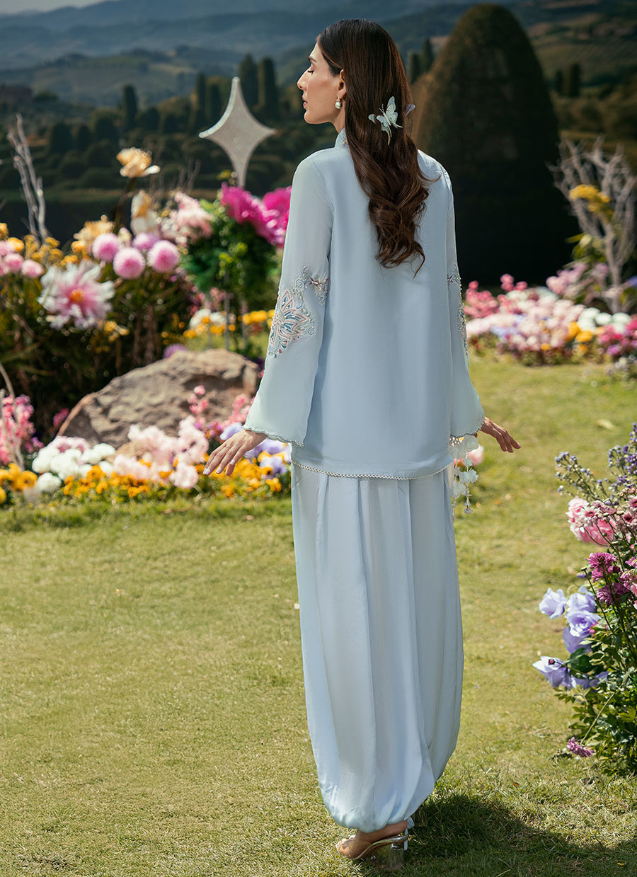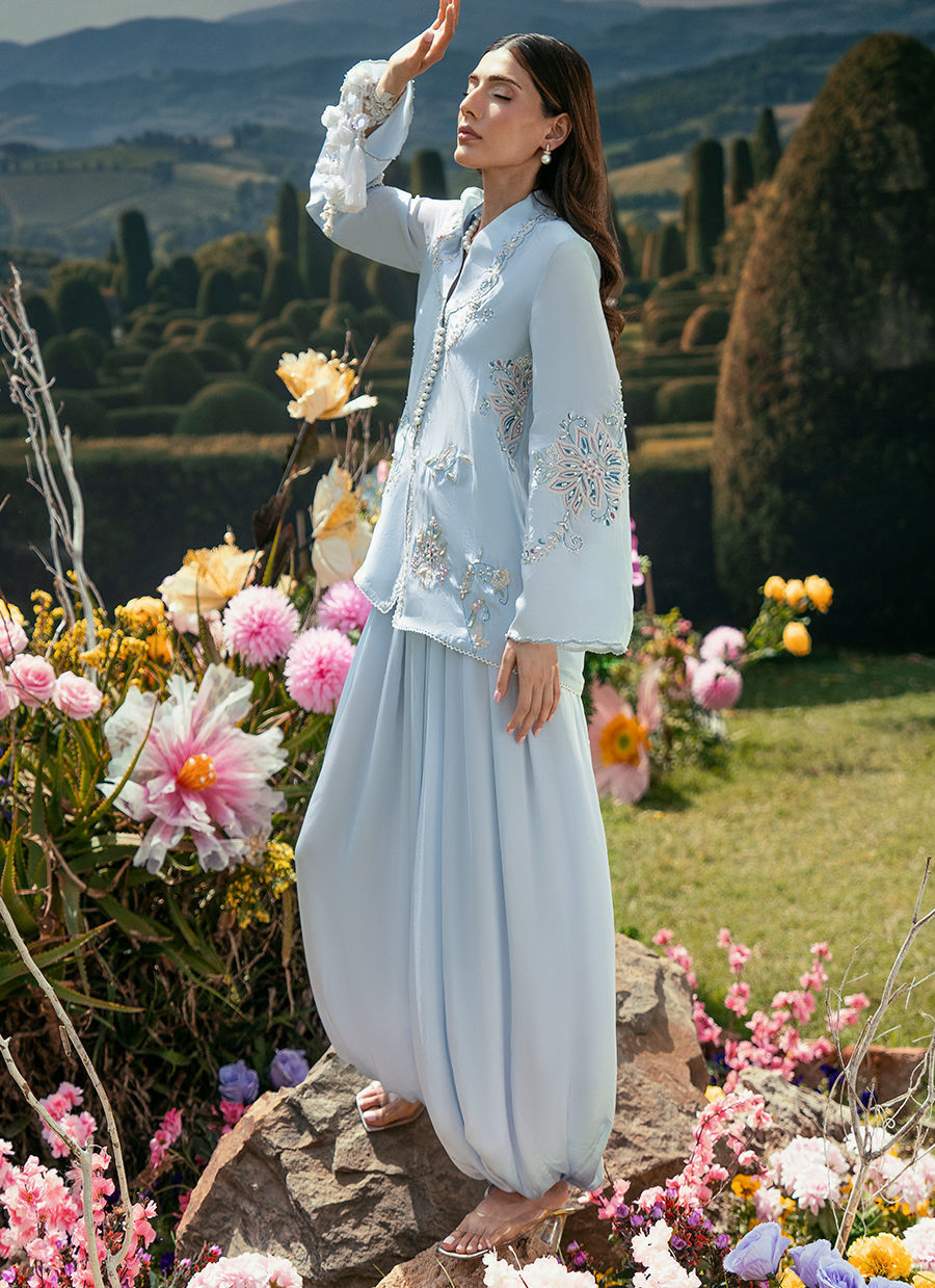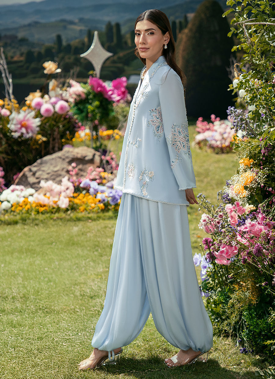 In a rich blue tone, this front-open shirt is detailed with pearl buttons running halfway down the front, paired with subtle all-over hand embellishments that add a soft, refined shimmer. It has a clean, slightly deep V shape formed by the embellished placket edges, giving it an elegant, elongated look. Styled with modern balloon pants, the ensemble strikes a balance between structured elegance and contemporary ease, creating a look that feels polished yet effortlessly chic.