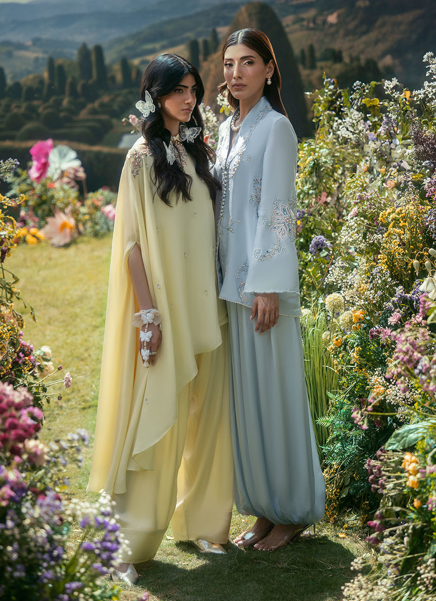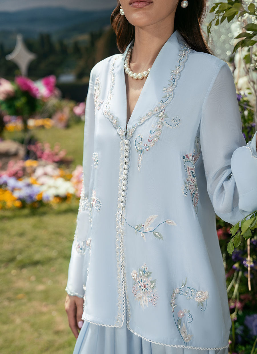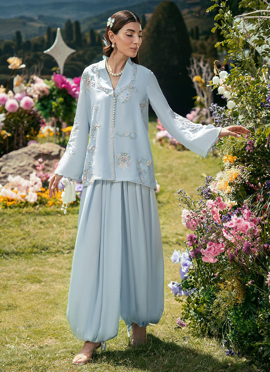 In a rich blue tone, this front-open shirt is detailed with pearl buttons running halfway down the front, paired with subtle all-over hand embellishments that add a soft, refined shimmer. It has a clean, slightly deep V shape formed by the embellished placket edges, giving it an elegant, elongated look. Styled with modern balloon pants, the ensemble strikes a balance between structured elegance and contemporary ease, creating a look that feels polished yet effortlessly chic.