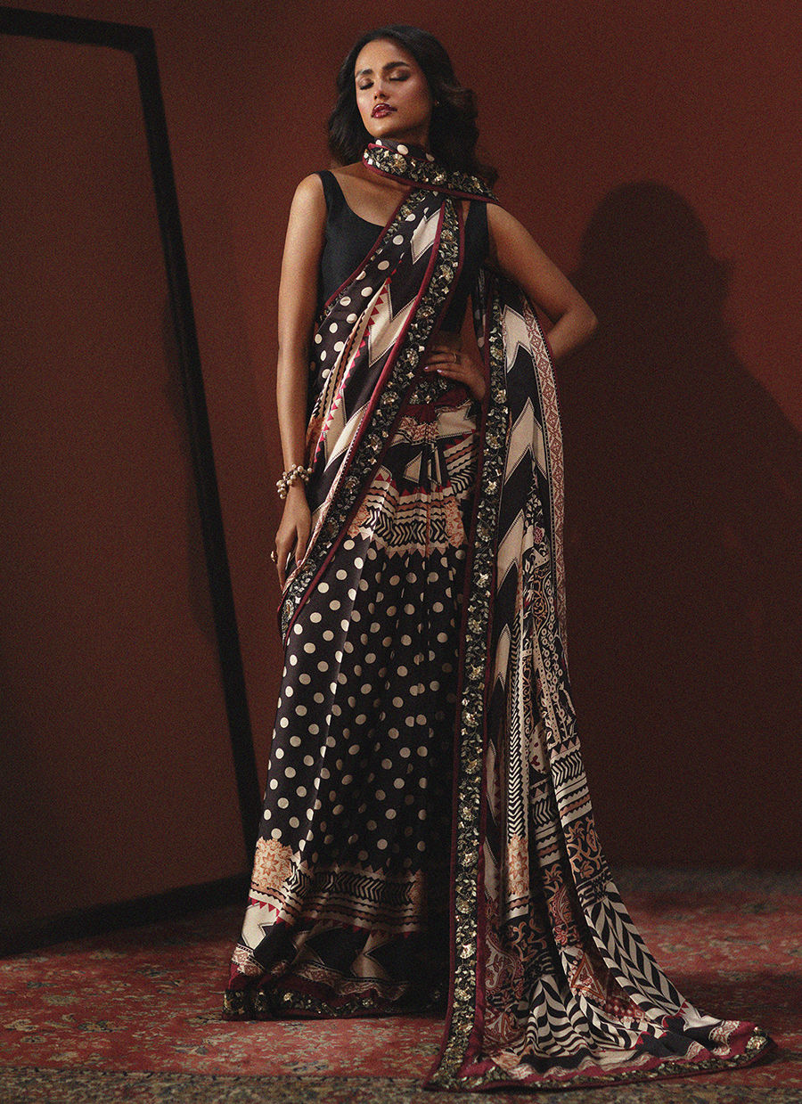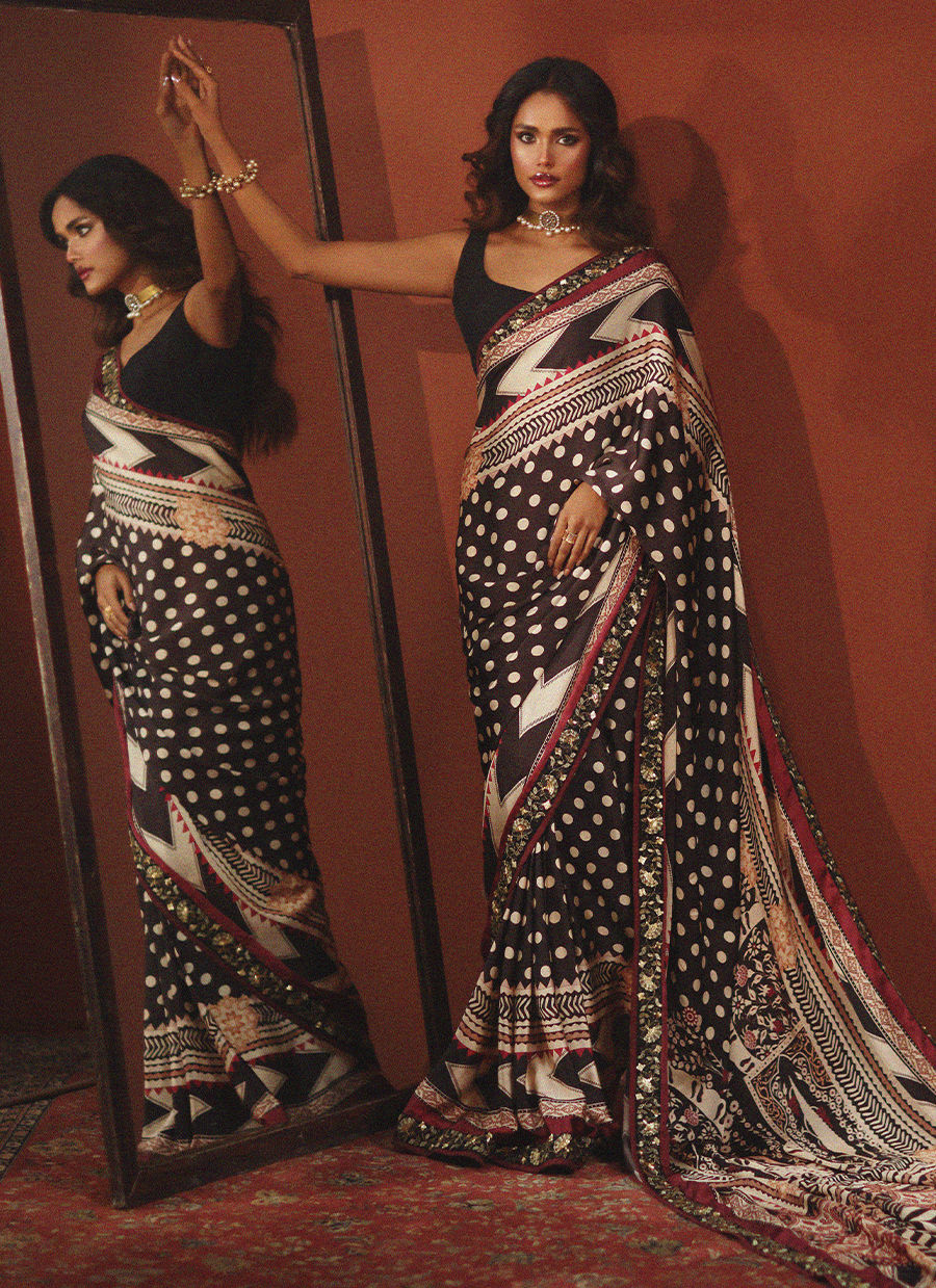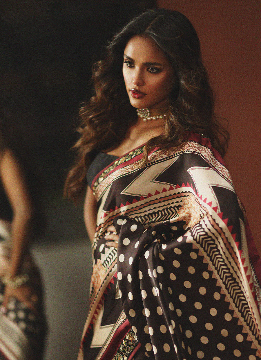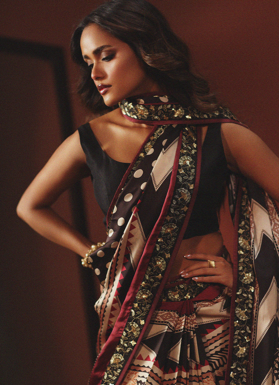 Wrapped in bold sophistication — this black, beige, and maroon printed silk sari features intricate embroidered borders that add depth and richness to every fold. Paired with a clean, plain silk blouse, the look is a perfect harmony of statement prints and modern minimalism. A timeless classic redefined with effortless grace.