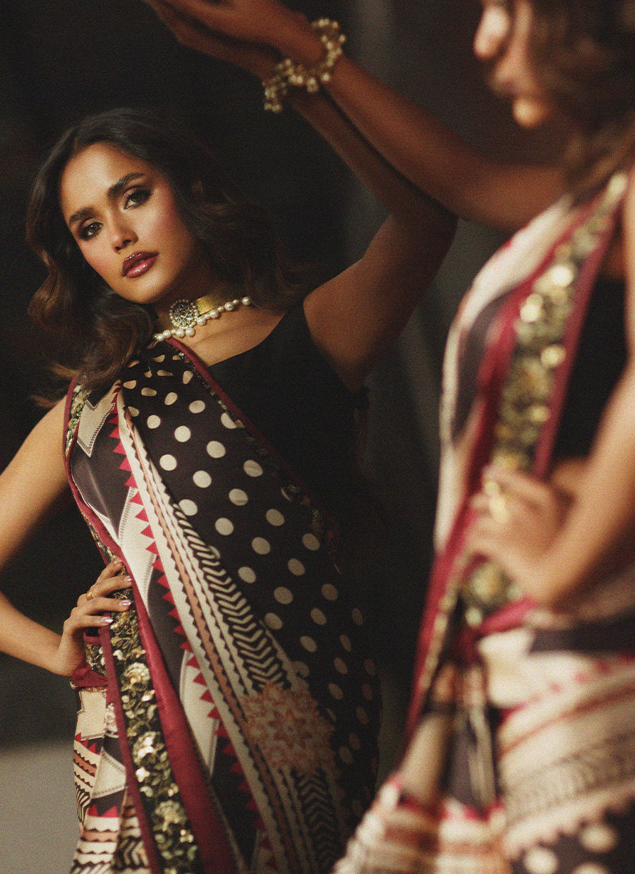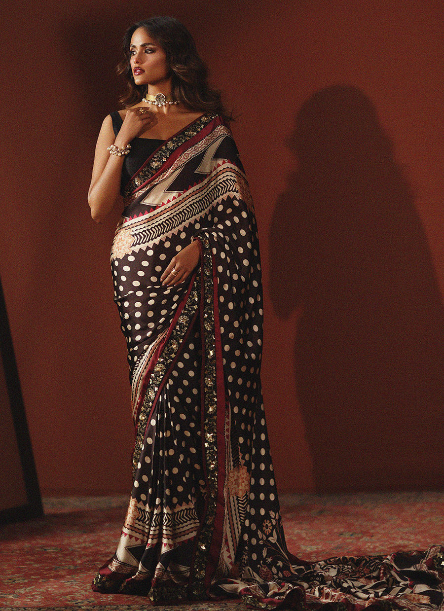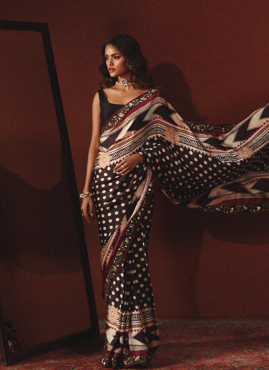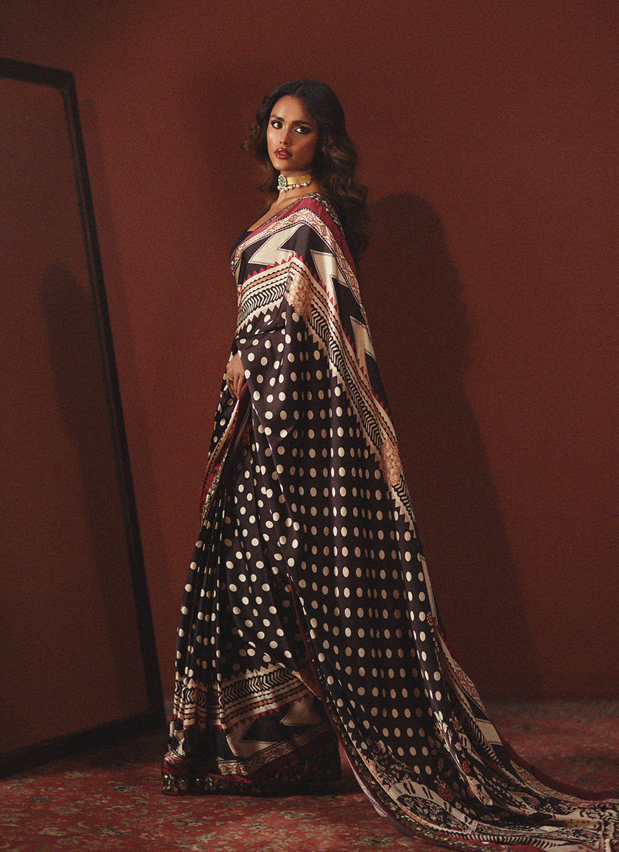 Wrapped in bold sophistication — this black, beige, and maroon printed silk sari features intricate embroidered borders that add depth and richness to every fold. Paired with a clean, plain silk blouse, the look is a perfect harmony of statement prints and modern minimalism. A timeless classic redefined with effortless grace.