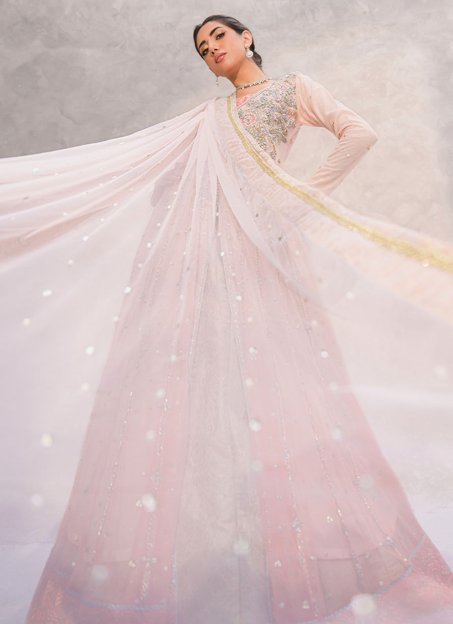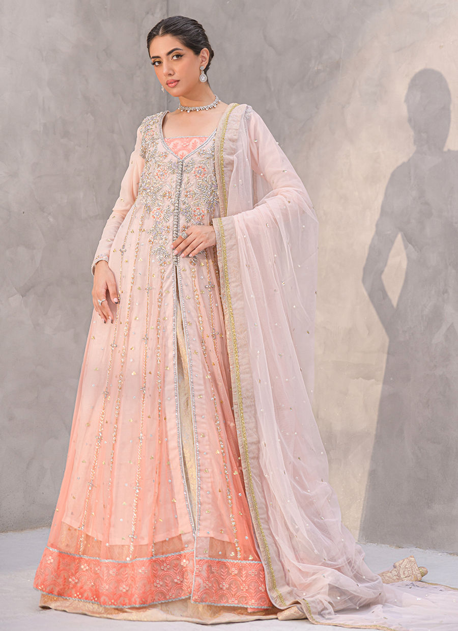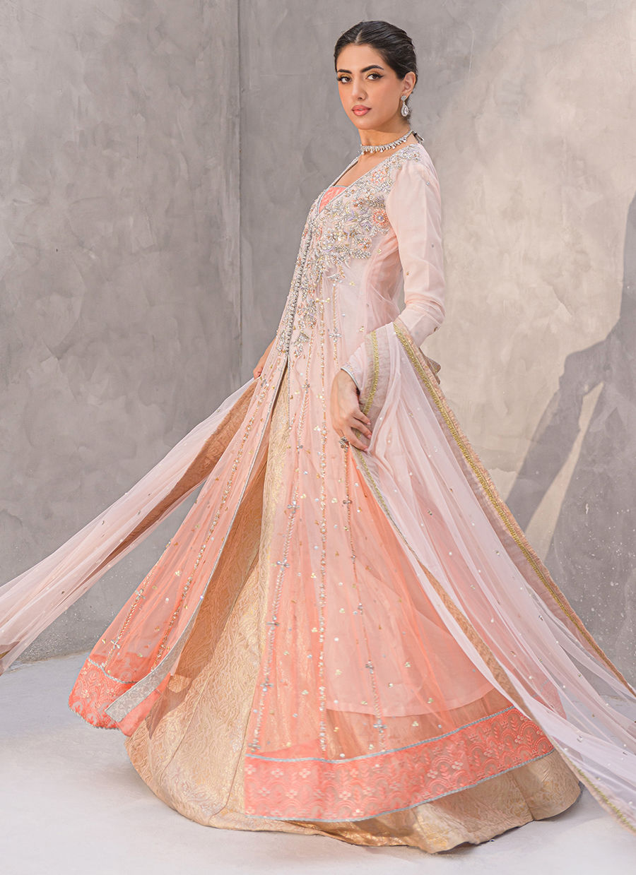 An ethereal pastel peach-pink peshwas crafted on delicate net fabric, adorned with intricate silver embellishments, pearl accents, and fine zari work. The ensemble flows gracefully with a heavily bordered hemline in soft coral tones, perfectly balanced with a sheer dupatta edged in antique gold. Regal yet romantic, this look is ideal for day weddings and receptions, radiating timeless elegance.